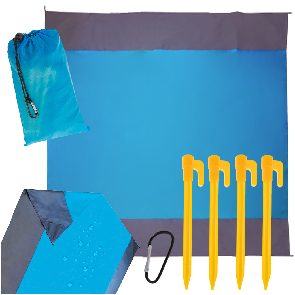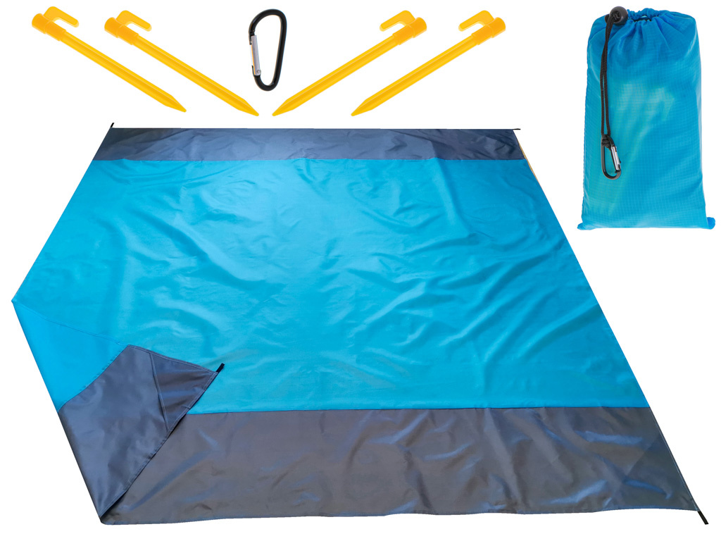 Nihče ne mara, ko se dvigne veter, zavihti vogale odeje in raztrosi pesek po vsem, kar je na njej. Nenehno urejanje odeje tudi ni preveč udobno. Pri tej odeji je vse skrbno premišljeno - del paketa so 4 klini, s katerimi lahko odejo enostavno pritrdite na tla!