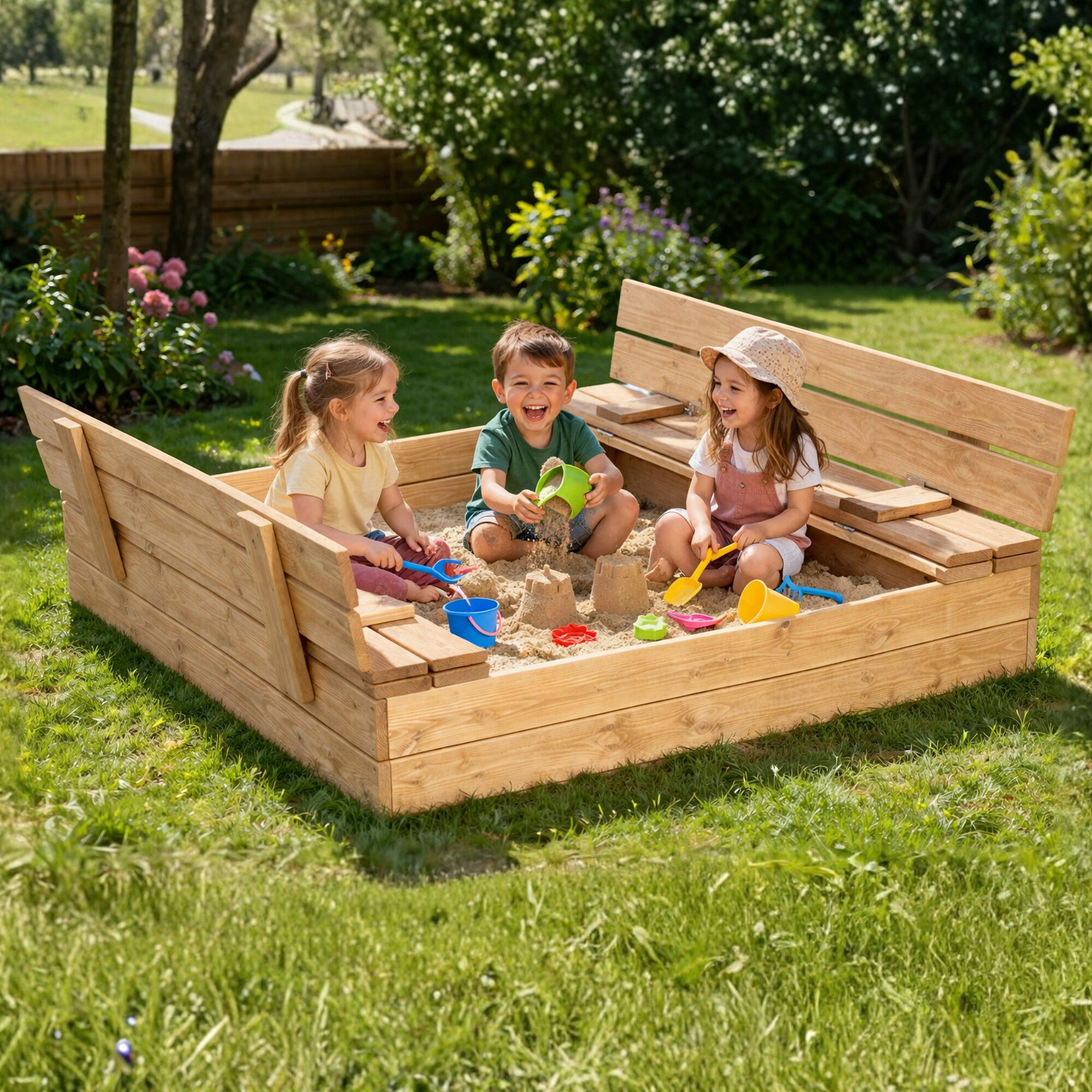Velika prednost je praktičen zaščitni pokrov, ki ščiti pesek pred umazanijo, dežjem in živalmi. Ko se pokrov odpre, se zlahka spremeni v udobne klopi, na katerih lahko otroci sedijo med igro.
