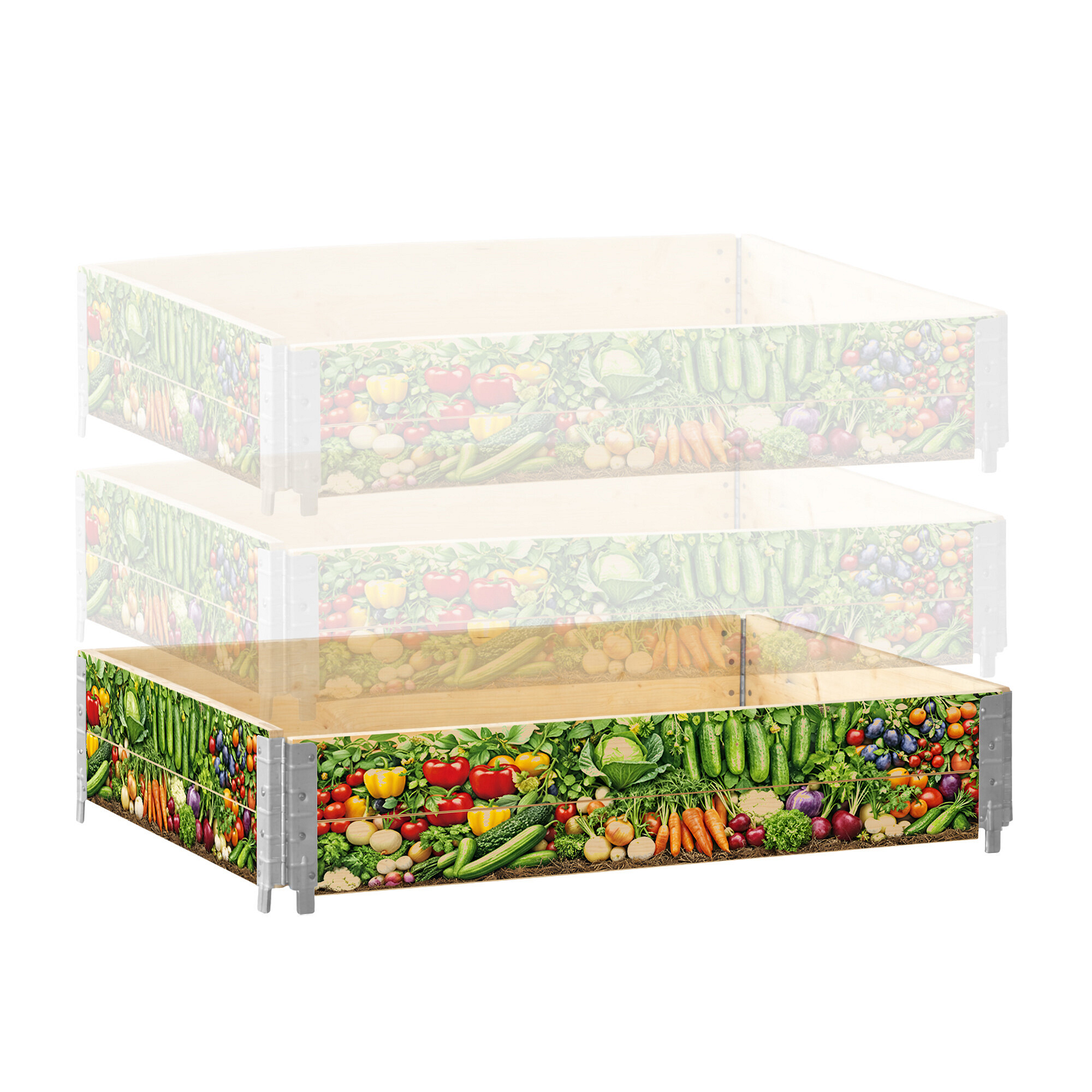 Greda je izdelana iz borovega lesa s certifikatom IPPC. Zunanja stran je dopolnjena z grafiko zelenjave, ki poudarja njen vrtni videz in se dobro prilega zunanjemu okolju. Dimenzija 120 × 80 cm ponuja dovolj prostora za domačo pridelavo običajnih vrst zelenjave, zelišč, jagod in cvetlic. Višina 40 cm omogoča ustvarjanje plasti zemlje, primerne za različne vrste sajenja.