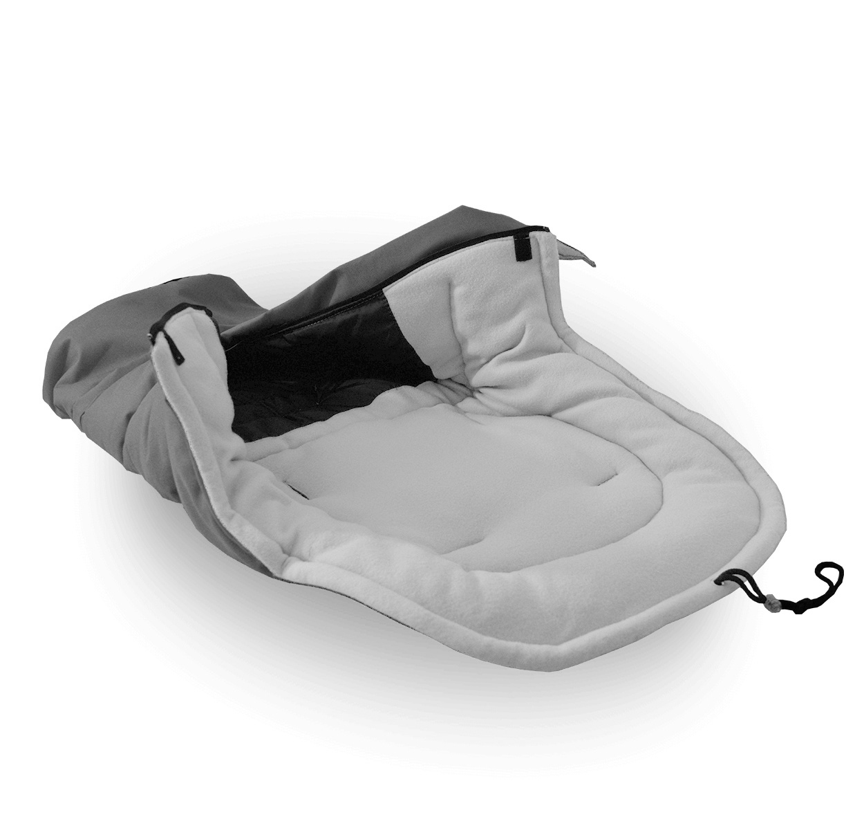 Otroška vreča ima zadrgo, odprtine za 5-točkovne varnostne pasove in gumijaste zaponke, ki omogočajo pritrditev na voziček.