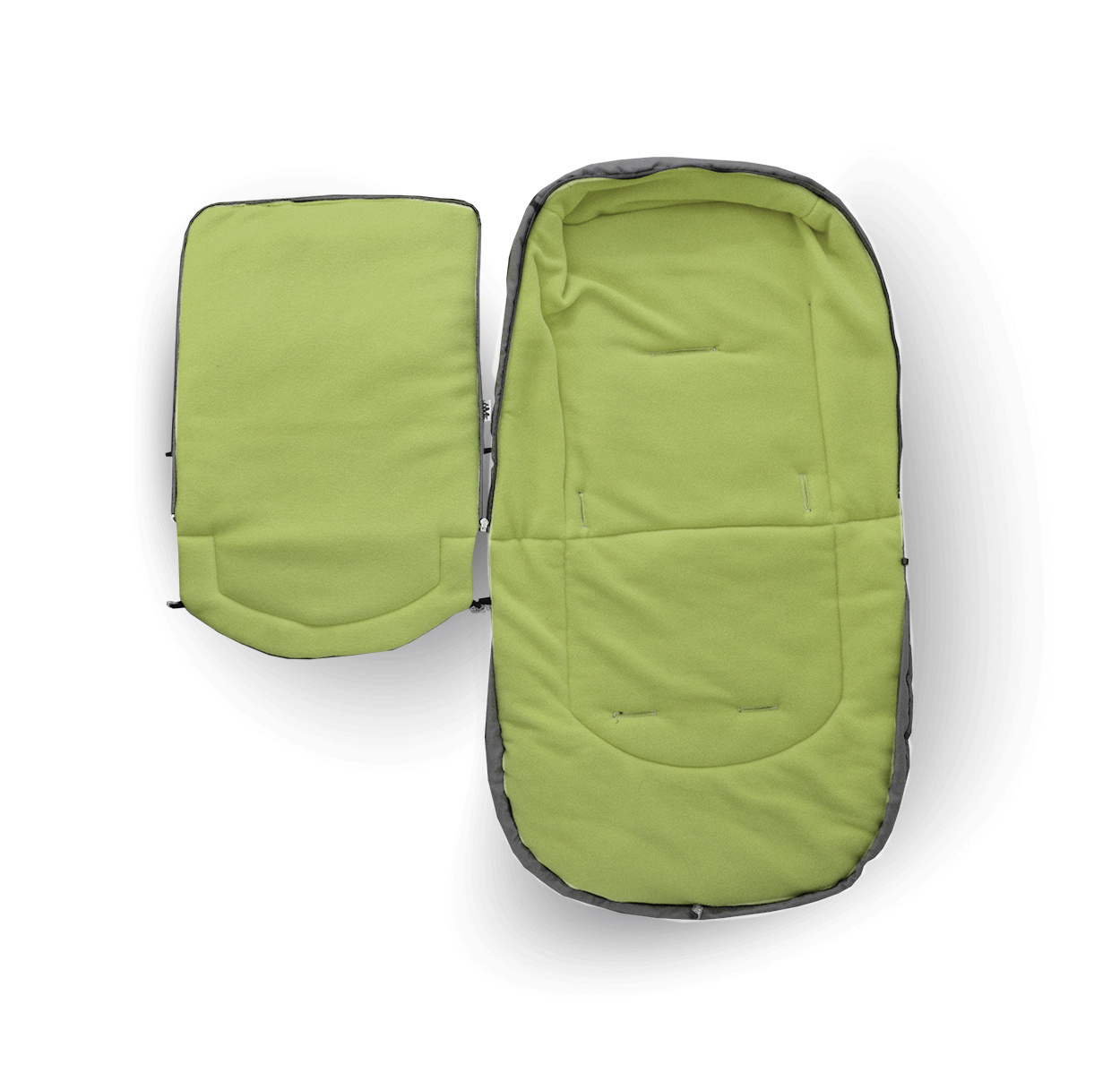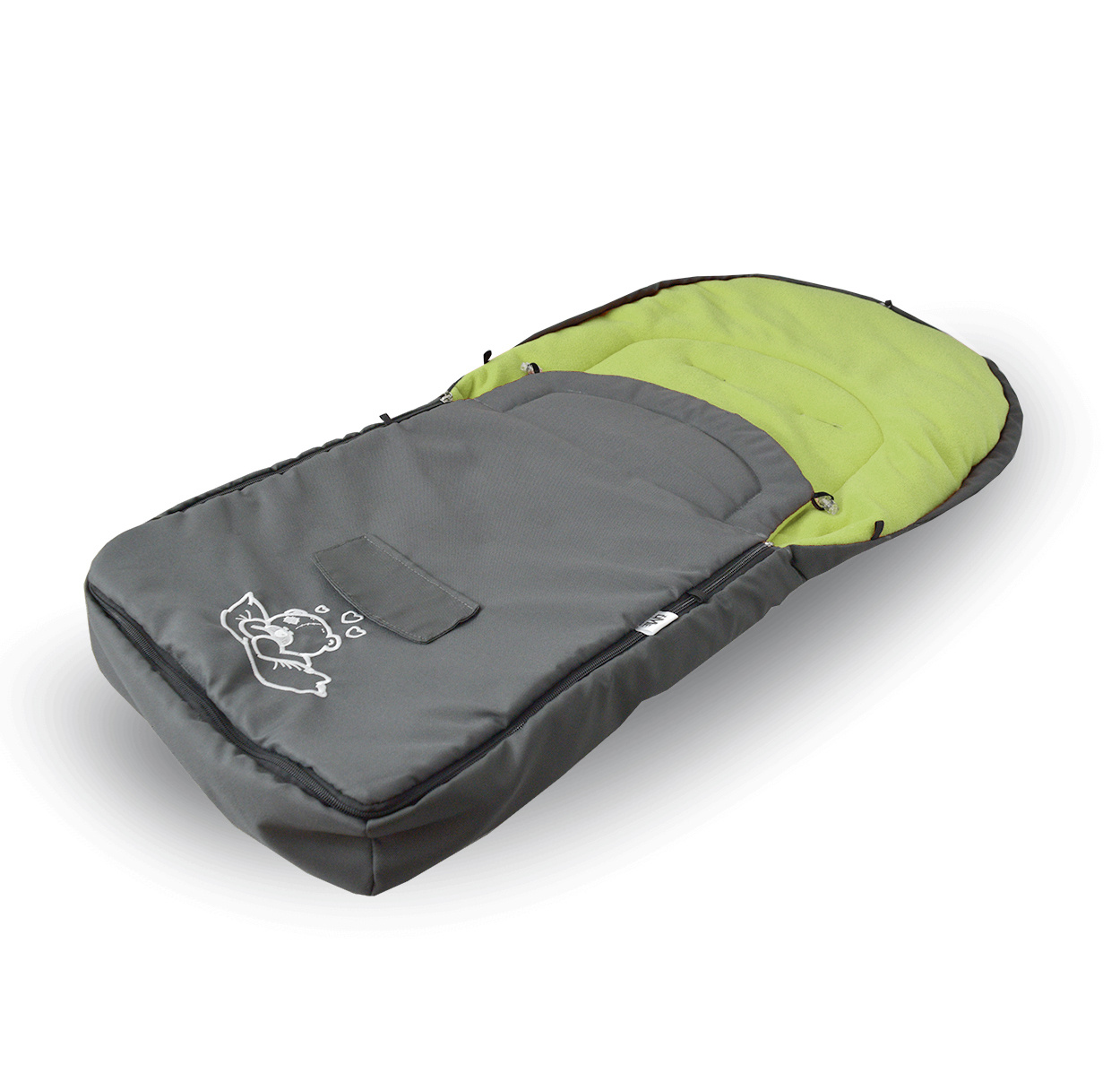 Otroška vreča ima zadrgo, odprtine za 5-točkovne varnostne pasove in gumijaste zaponke, ki omogočajo pritrditev na voziček.