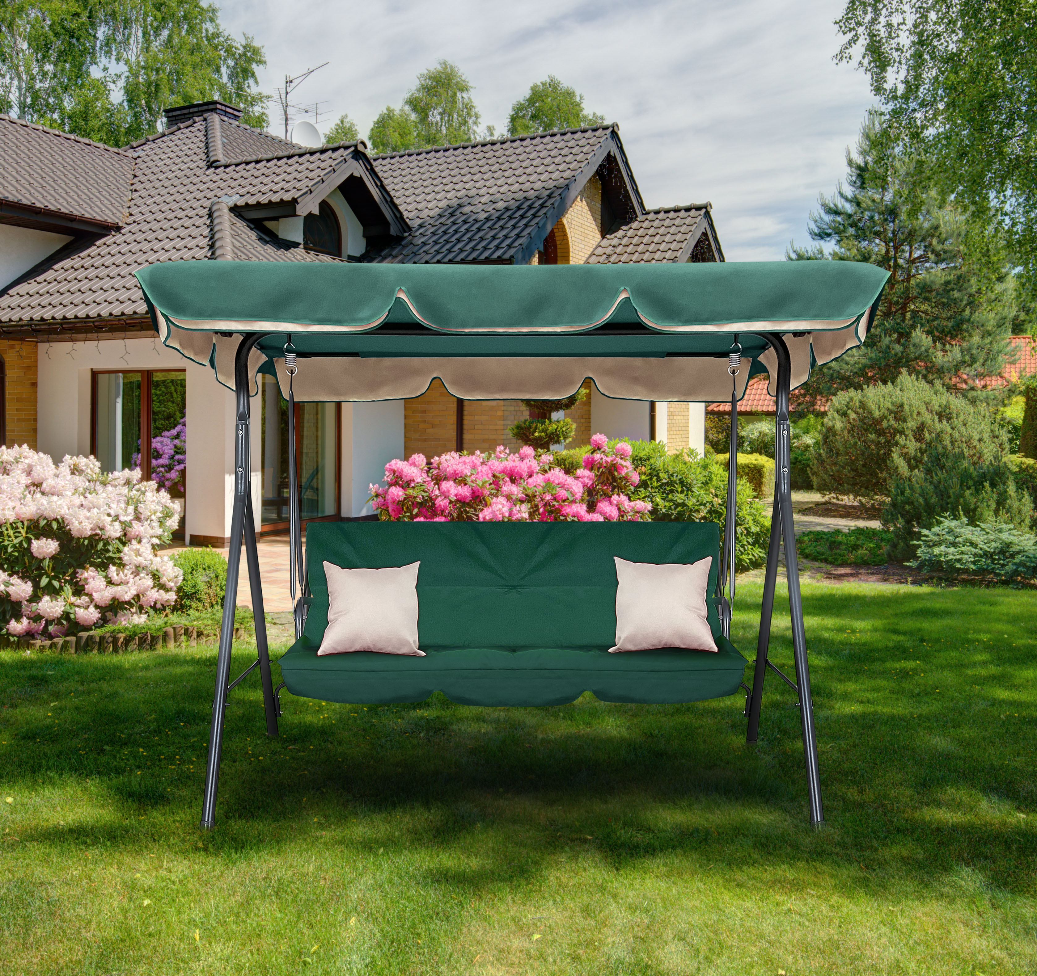 Gugalnica je opremljena s praktično nagibno streho, ki služi kot senčnik proti močnemu soncu.