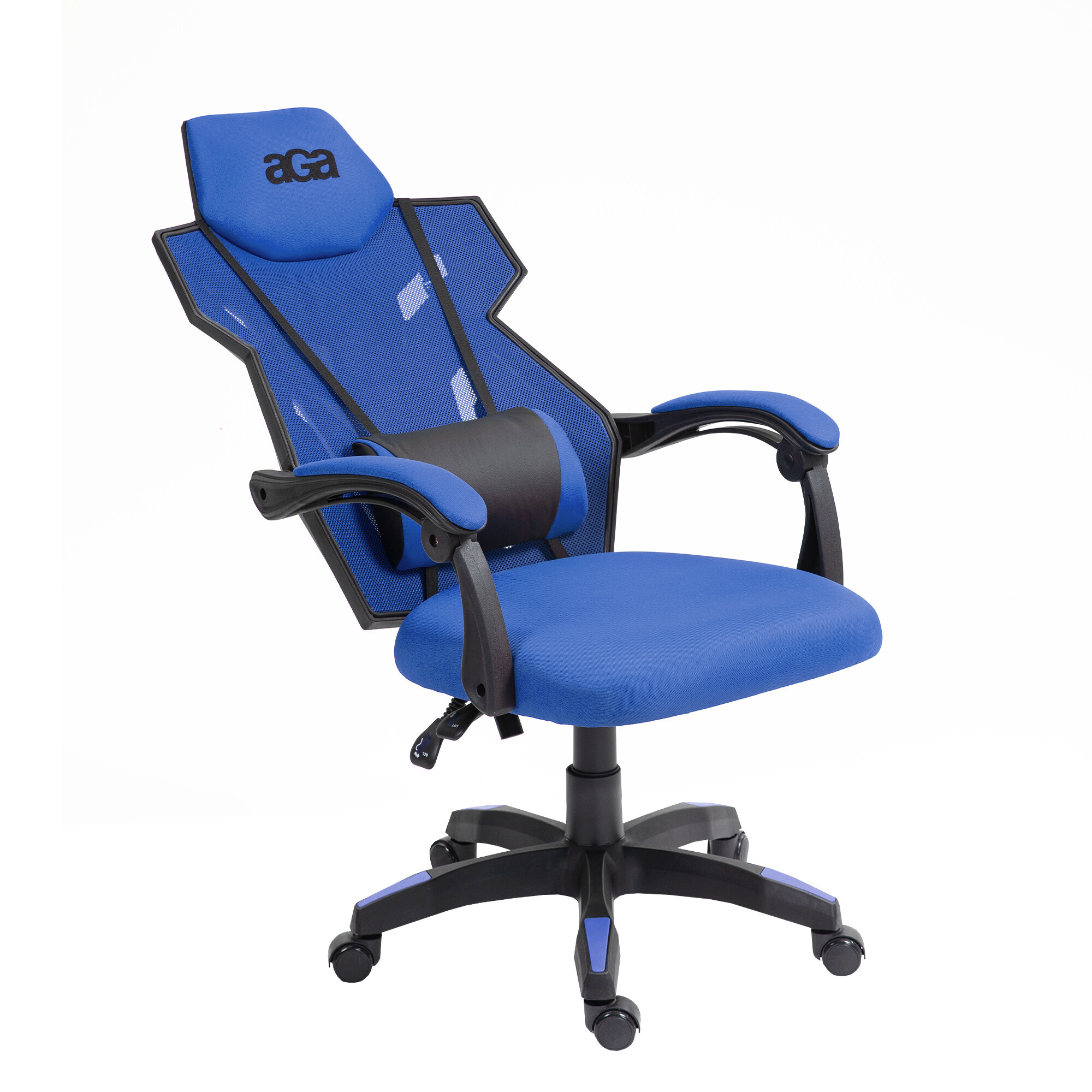 Mehanizem vam bo torej ponudil ne le kompleksno nastavitev višine sedeža in nagiba naslonjala stola, temveč tudi možnost blokade stola v katerem koli položaju. Naslon za hrbet je mogoče zakleniti pod katerim koli kotom od 90° do 155°.Asinhronska mehanika prav tako omogoča neodvisno povezavo sedeža in naslonjala, zato je mogoče naslonjalo in sedež nastavljati neodvisno drug od drugega, vsako s svojo ročico pod sedežem. Stol Aga je nato postavljen na trdno plastično petkrako osnovo. Ta osnova ima pet plastičnih koles, ki so primerna za premikanje po mehkih in trdih tleh.Vašo pozornost bo zagotovo pritegnila tudi vgrajena opora za glavo, ledvena opora in premična blazina. Ta oprema vam bo namreč omogočila več ur udobnega sedenja in izjemen počitek. Celota je dopolnjena s trdnimi nasloni za roke, ki so usklajeni z barvnimi poudarki, ki ustrezajo celotni barvni zasnovi stola.