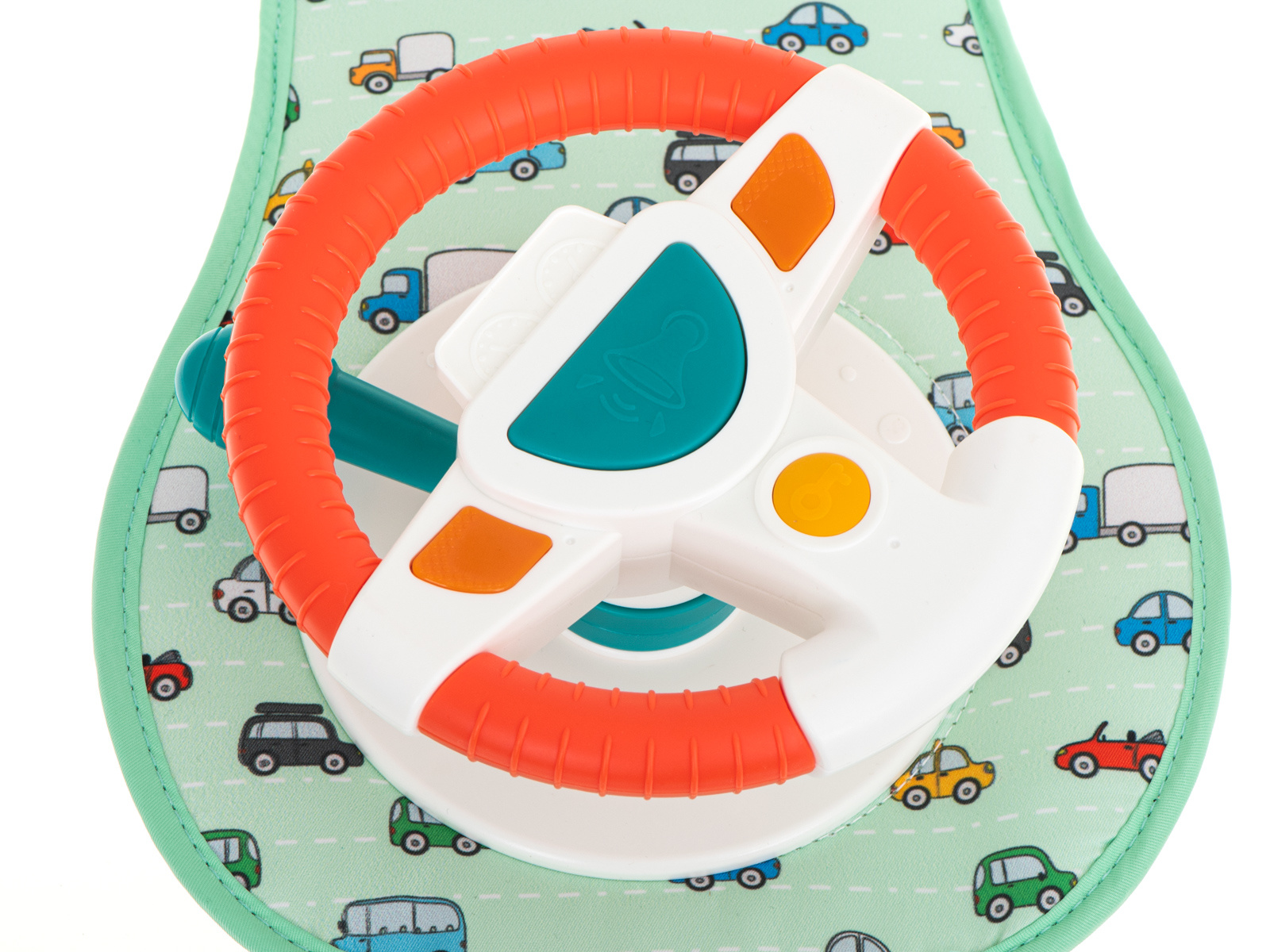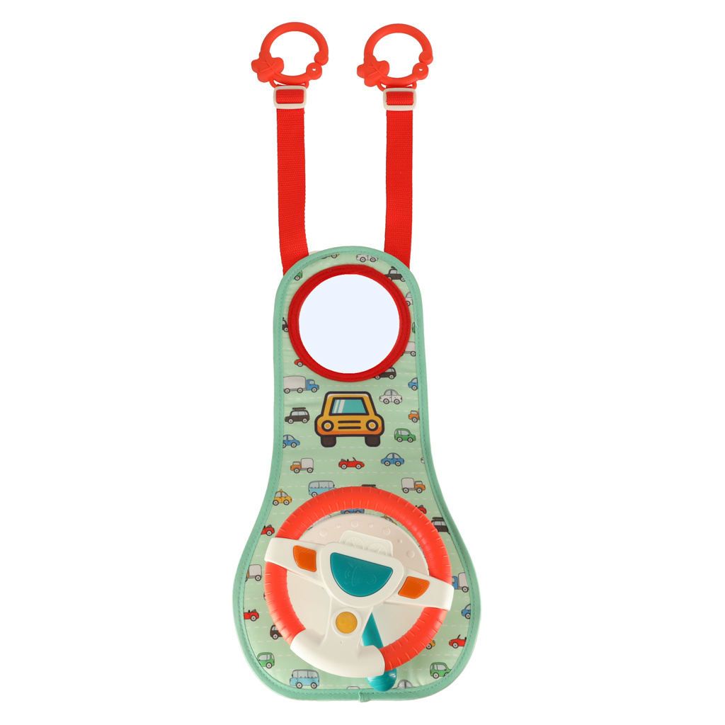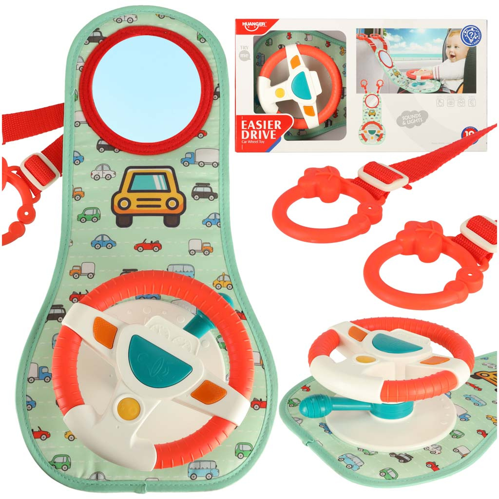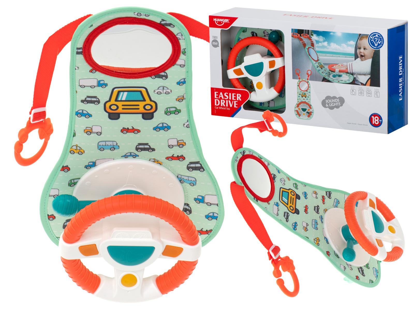 Razigran ali jokajoč otrok na zadnjem sedežu je za voznika vozila velik stres. Imamo rešitev za vas, ki bo vašemu malčku polepšala pot in zagotovila gladko vožnjo. Interaktivni volan je vrsta upravljalne plošče, ki uspešno zaposli majhne roke skozi celotno vožnjo. Sestavljen je iz volana s 4 gumbi, senzoričnega ročaja in plastičnega varnostnega ogledala. Kosi so nameščeni na trdni podlagi, prevlečeni s prijetno tkanino z motivom avtomobilčkov.