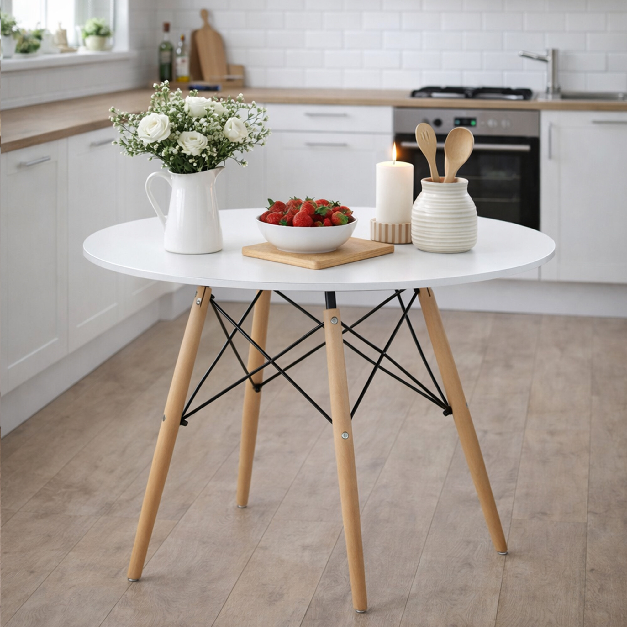 Jedilna miza v skandinavskem slogu se zlahka ujema z notranjostjo kuhinje ali jedilnice.