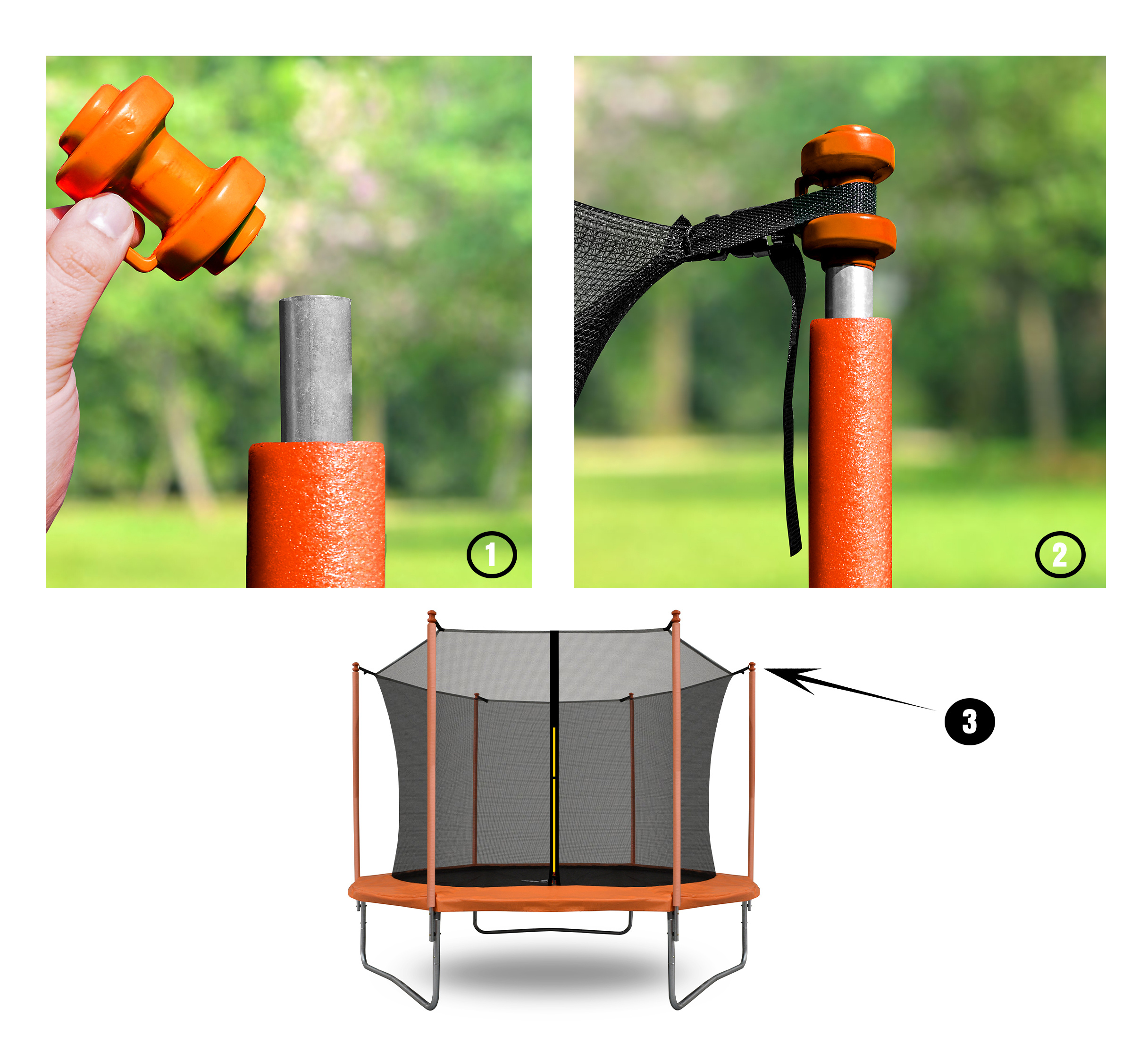 Klobuček se namesti na zgornjo zaščitno palico mreže trampolina in njegova glavna naloga je preprečiti poškodbe zaradi ostrega roba.