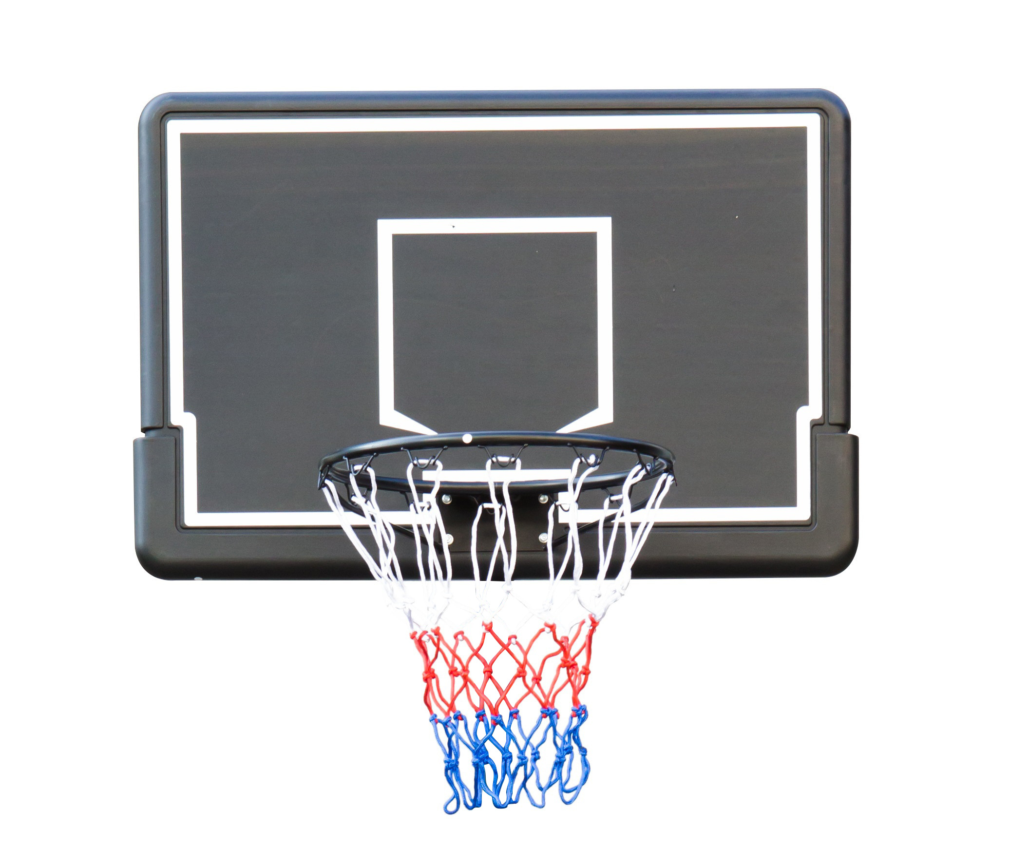 Na odbojni plošči s klasičnimi belimi črtami je pritrjen koš za košarko z jeklenim obročem s premerom 43 cm, lakiranim s prašnim lakom, in z mrežo, odporno na vremenske vplive.