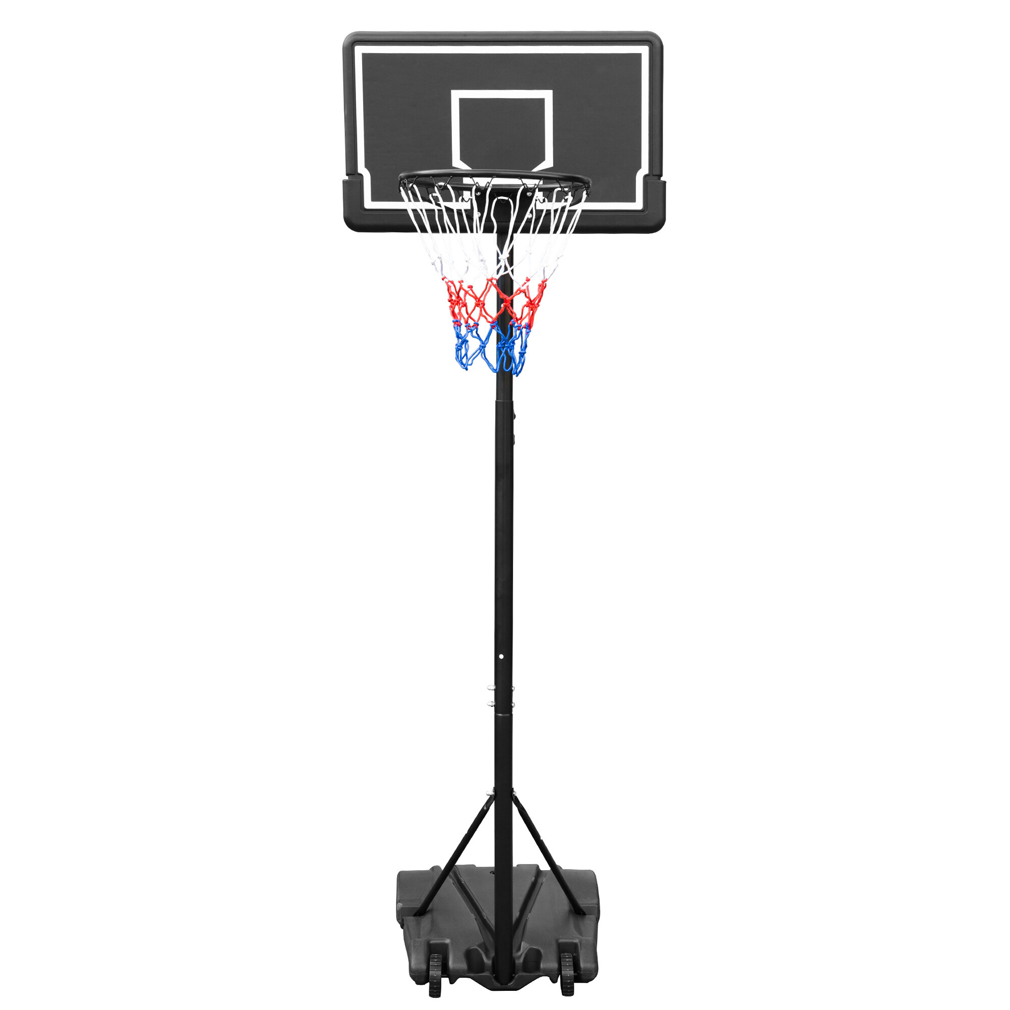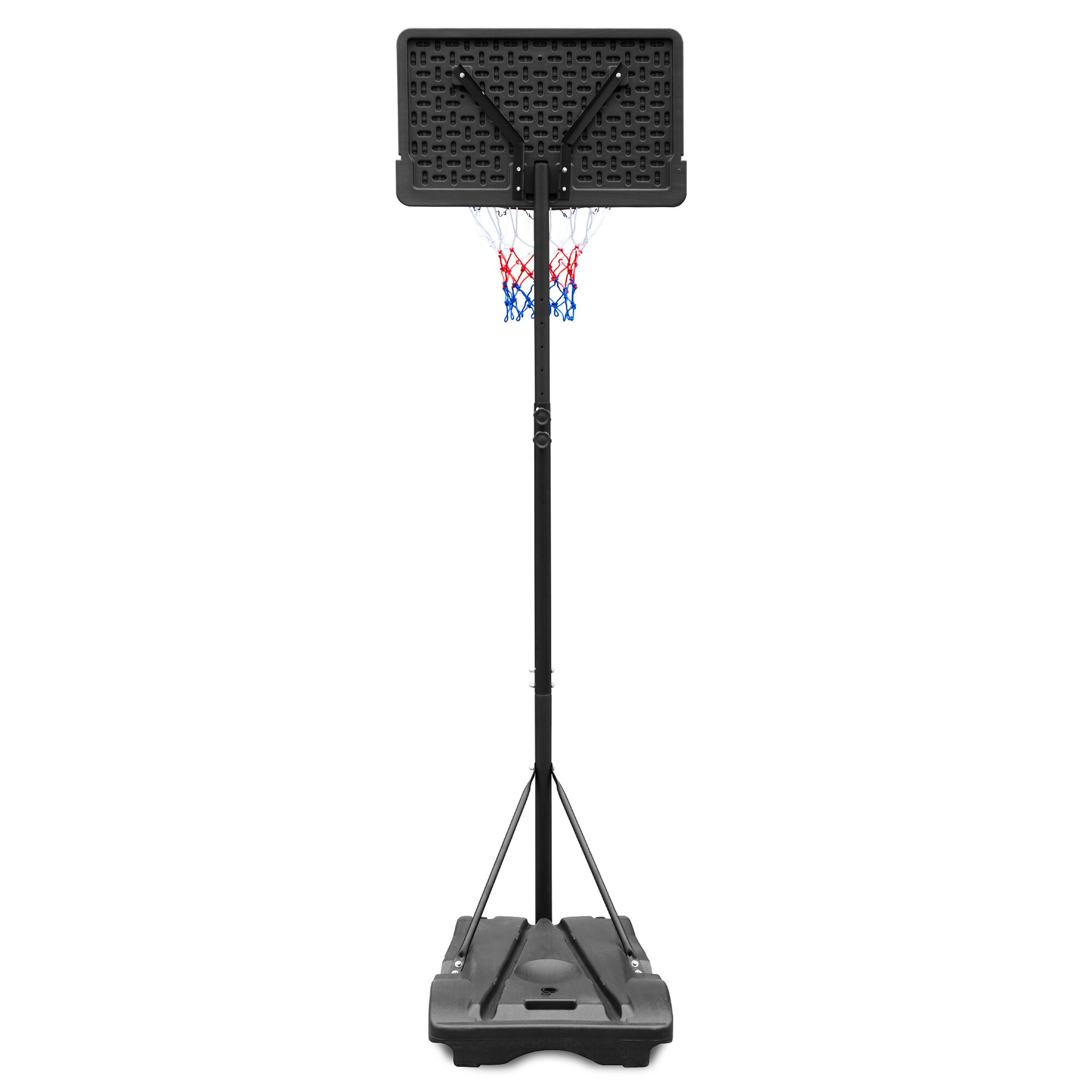 Mobilni koš za košarko z nastavljivo višino, trdno plastično ploščo in obročem z mrežo.
