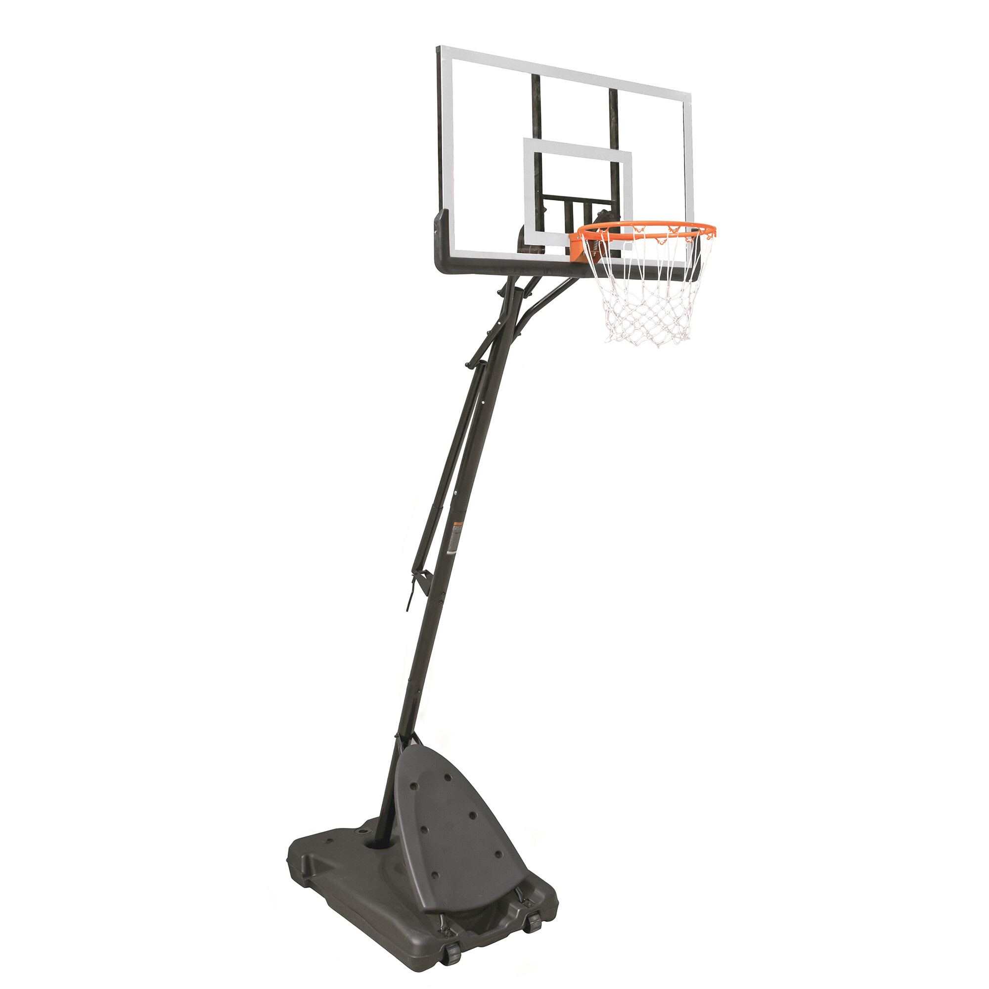 Mobilni koš za košarko z nastavljivo višino, trdno plastično ploščo in obročem z mrežo, ki ima uradno velikost.