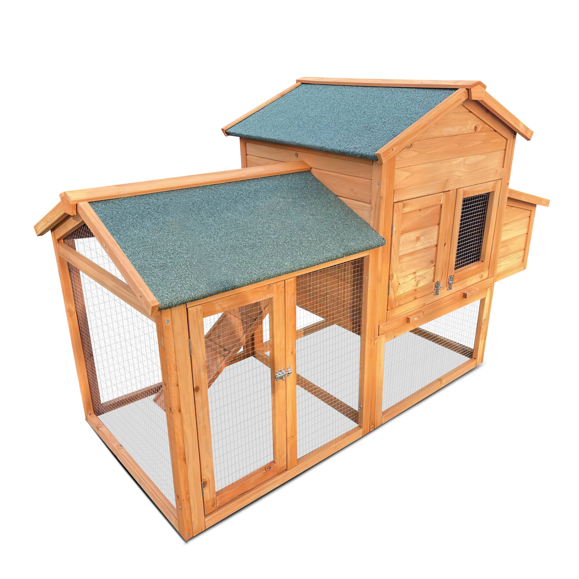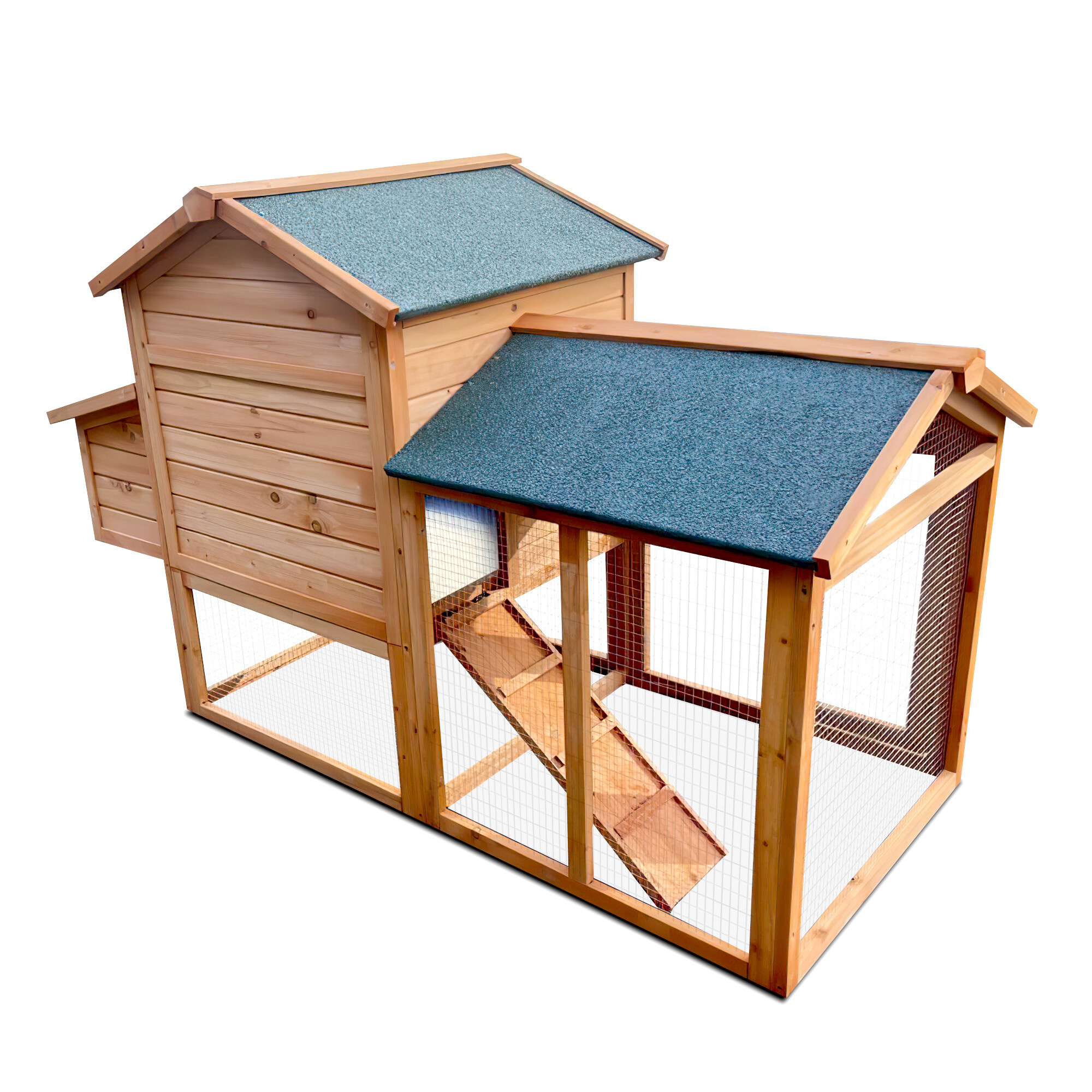 Zaradi tega je kokošnjak stabilen in dolgotrajno odporen proti zunanjim vplivom. Konstrukcija je zasnovana tako, da zagotavlja dovolj prostora za kokoši in hkrati omogoča enostaven dostop za rejce.Ograja, povezana z bivalnim delom, omogoča kokošim prosto gibanje.