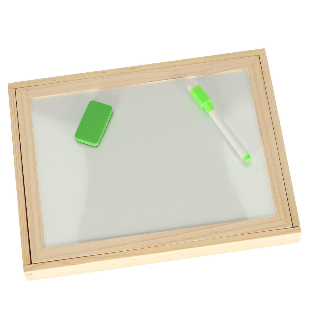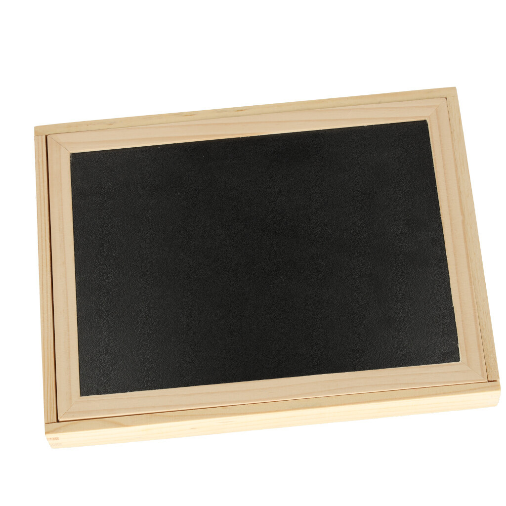 Dimenzije: dolžina 30 cm. širina 23 cm. 3 cm V.Bela magnetna stran se uporablja za barvne sestavljanke in pisanje s flomastrom - Črna stran table se uporablja za tradicionalno pisanje s kredo