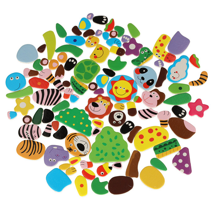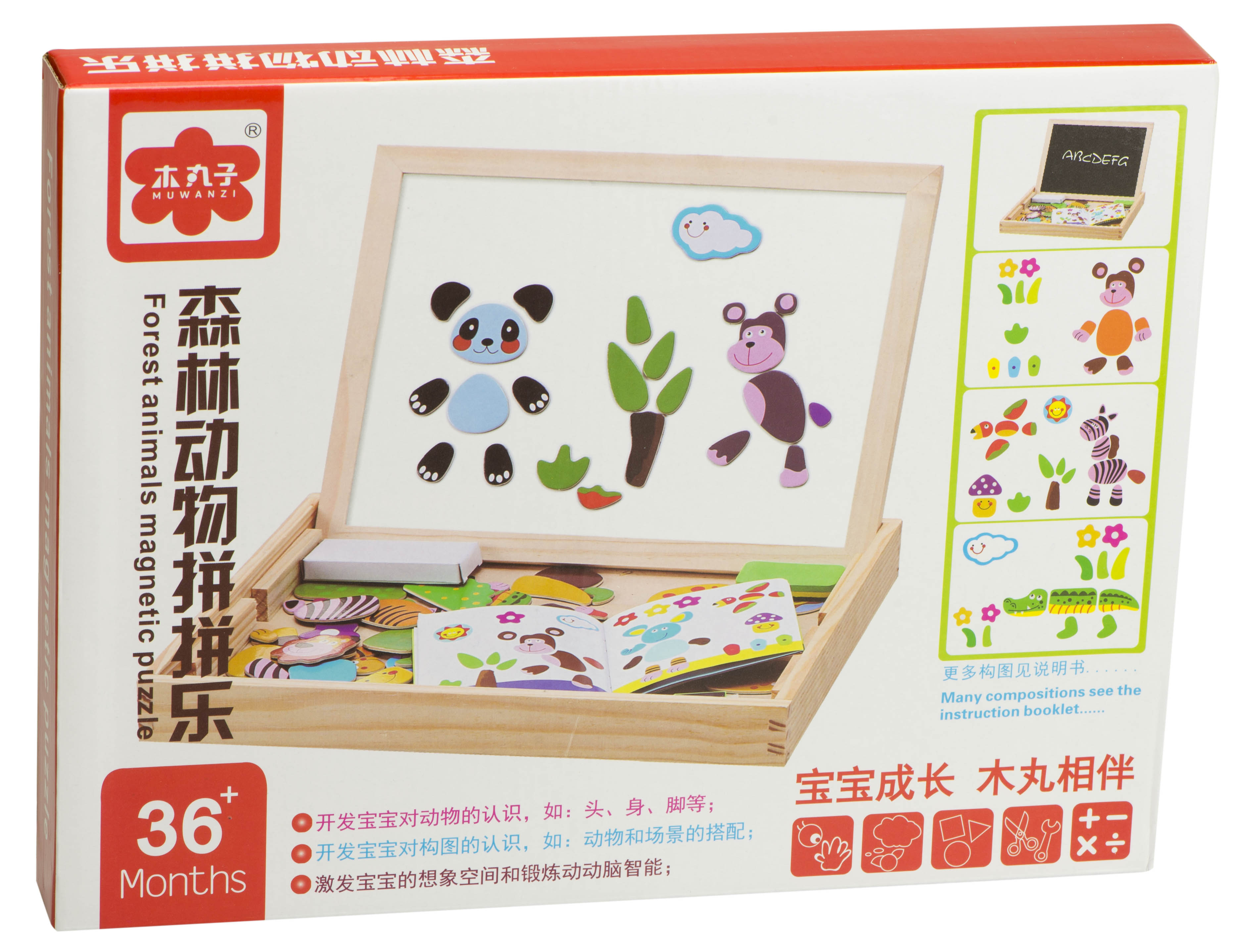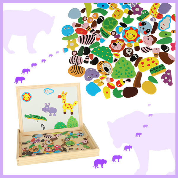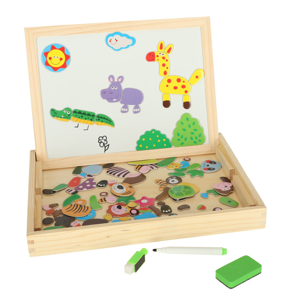 Obojestranska lesena deska z magnetnimi sestavljankami za razporeditev slik.