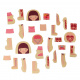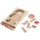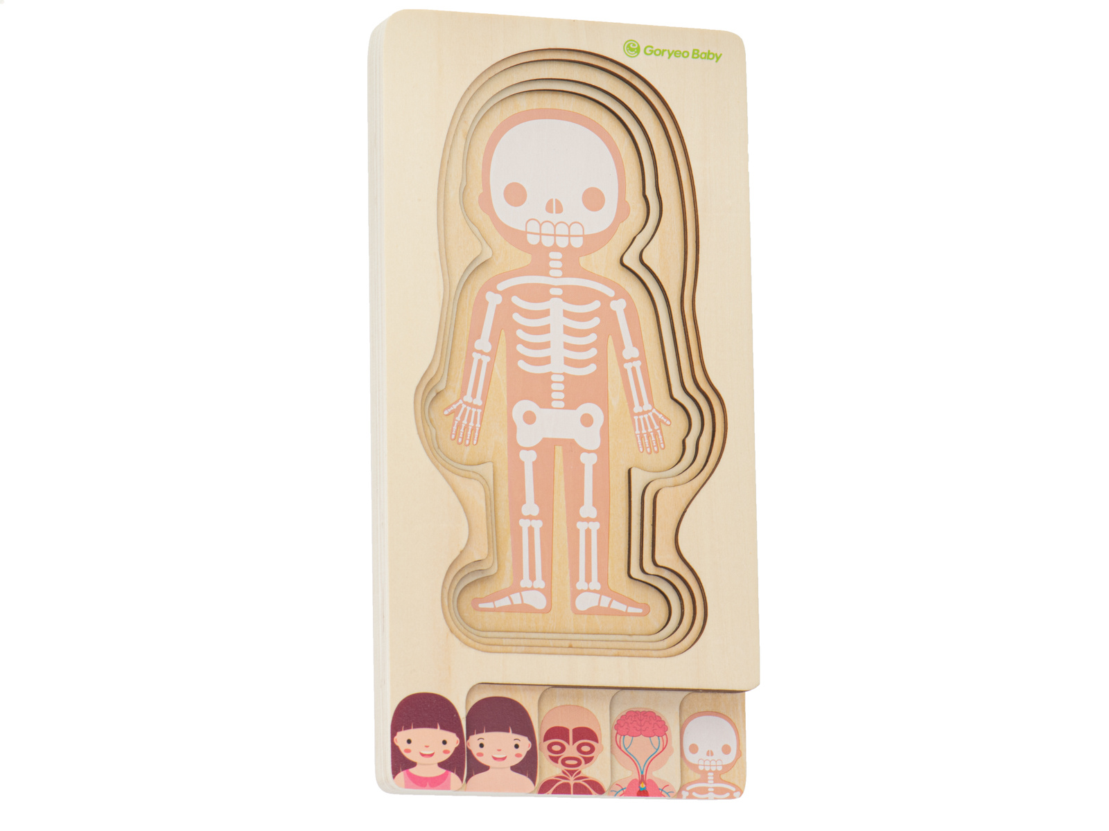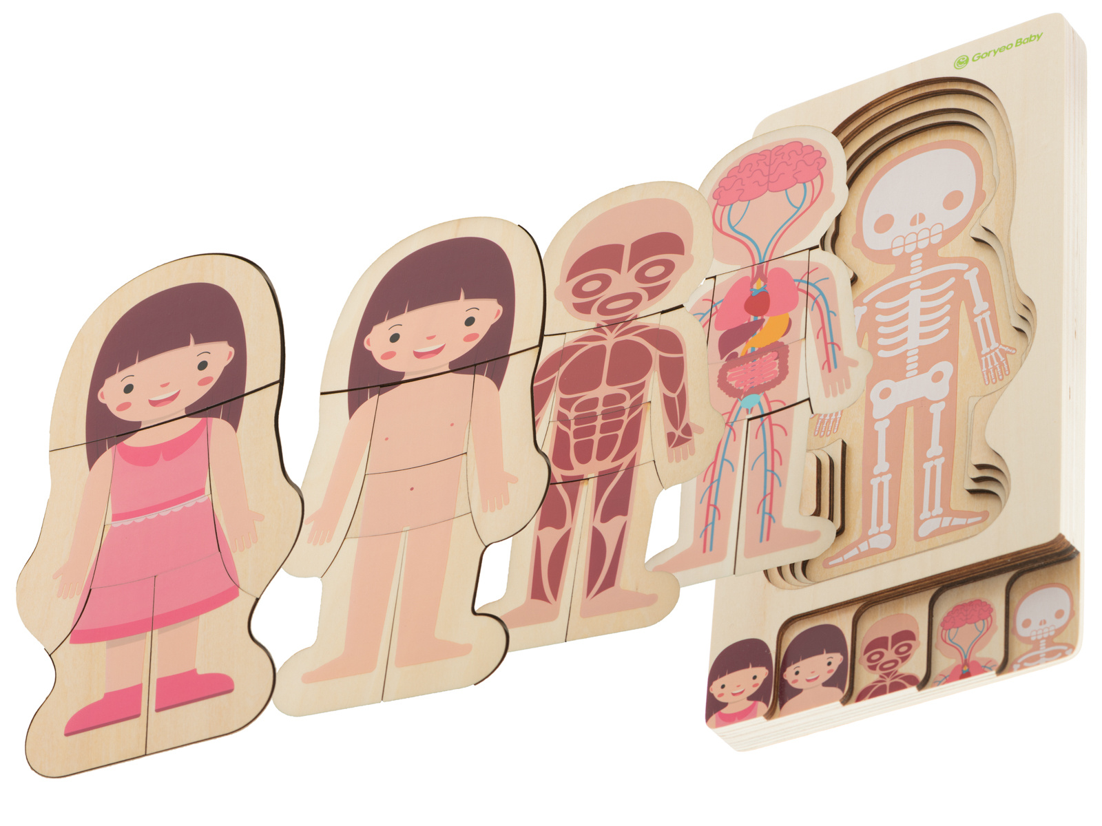Naloga malčka je, da razporedi človeško okostje, notranje organe, mišice, telo in na koncu oblačila v pravilnem vrstnem redu.Vsebina kompleta: