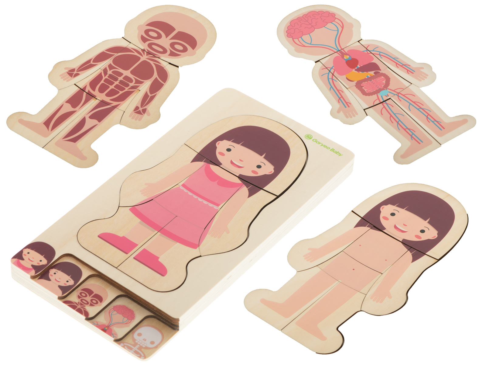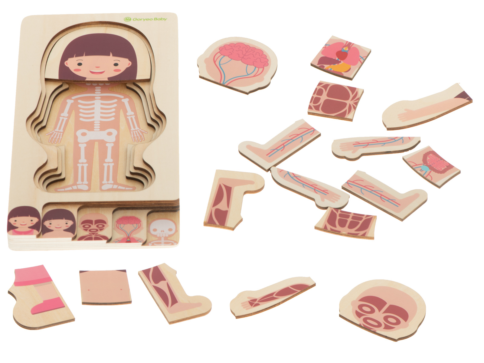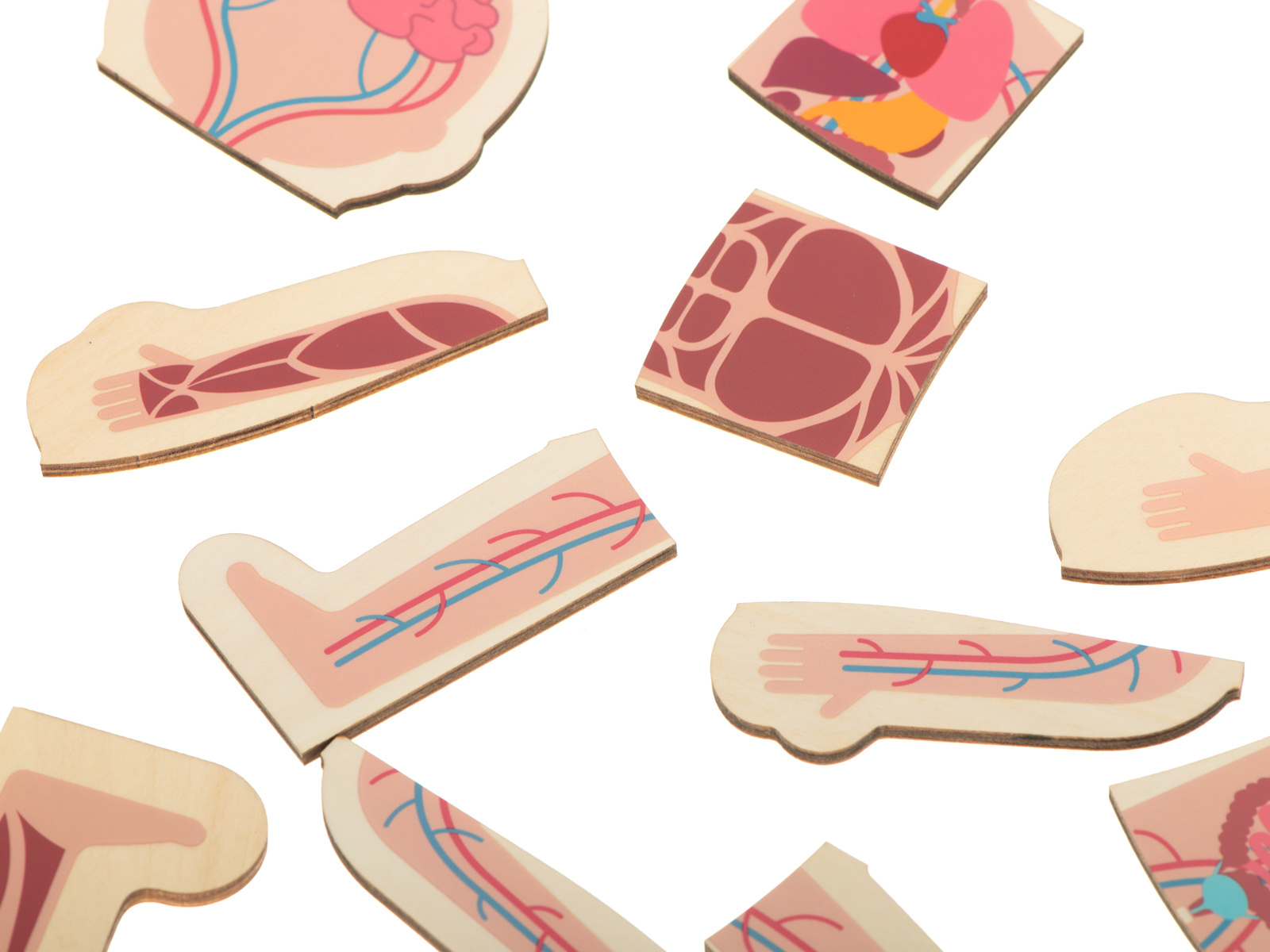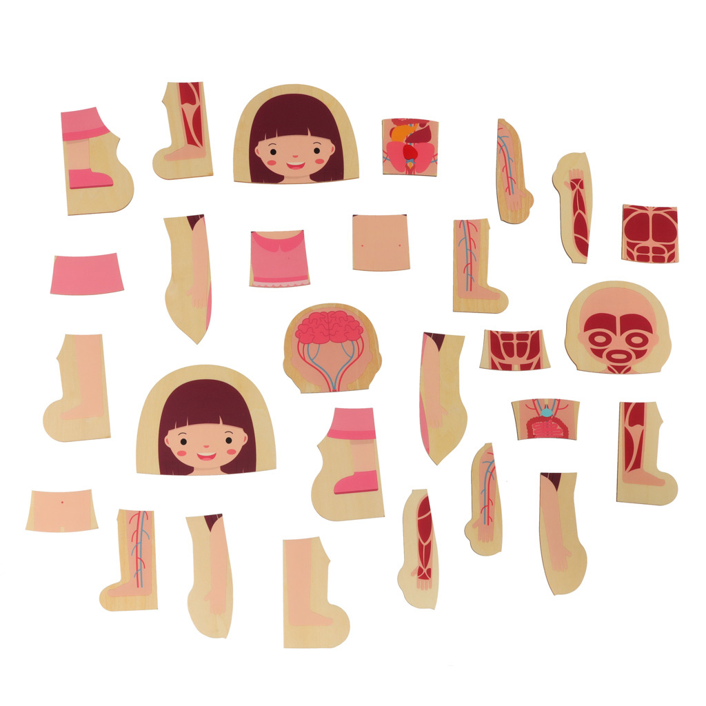 Sestavljanke prikazujejo človeški prerez, vključno s kostmi, notranjimi organi, mišicami in telesom
