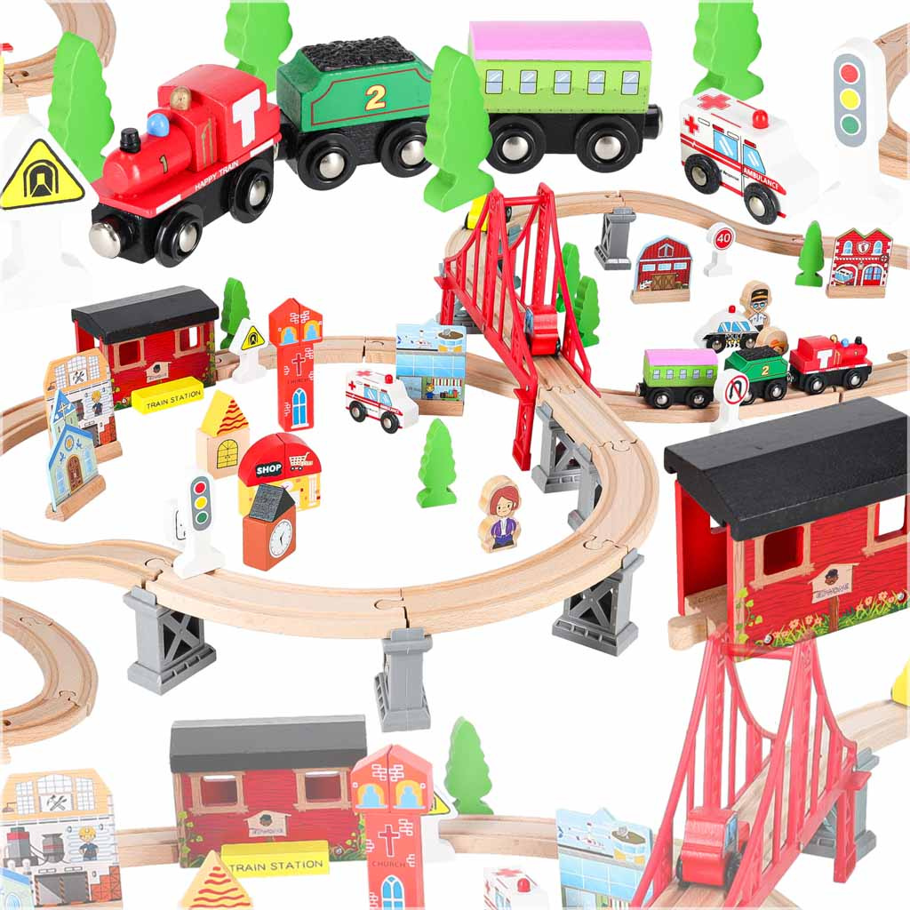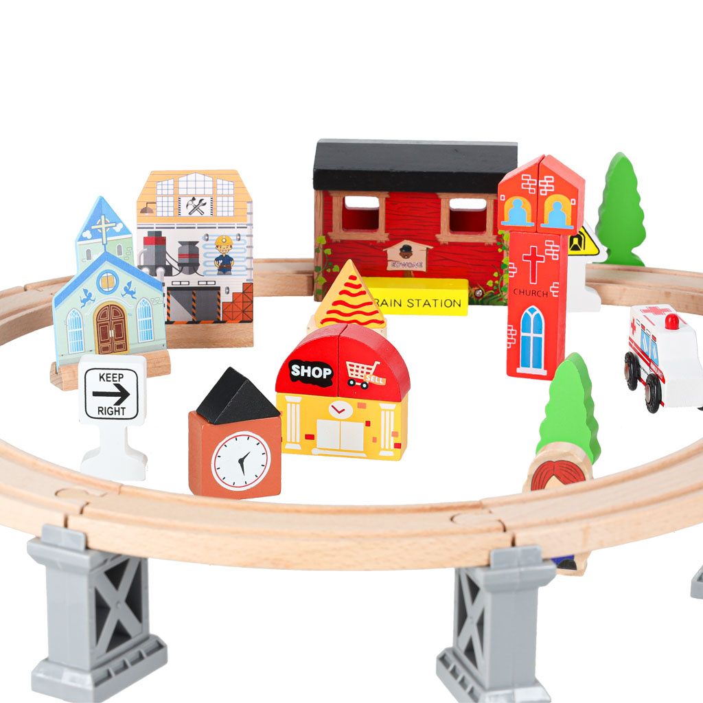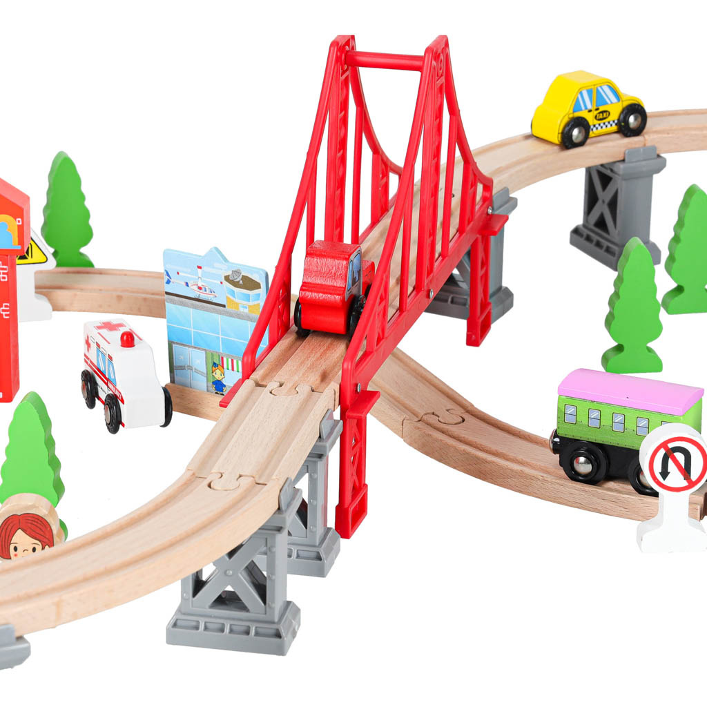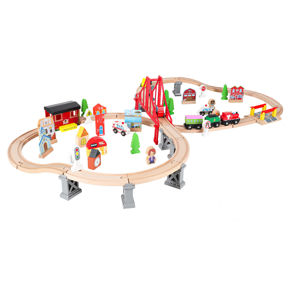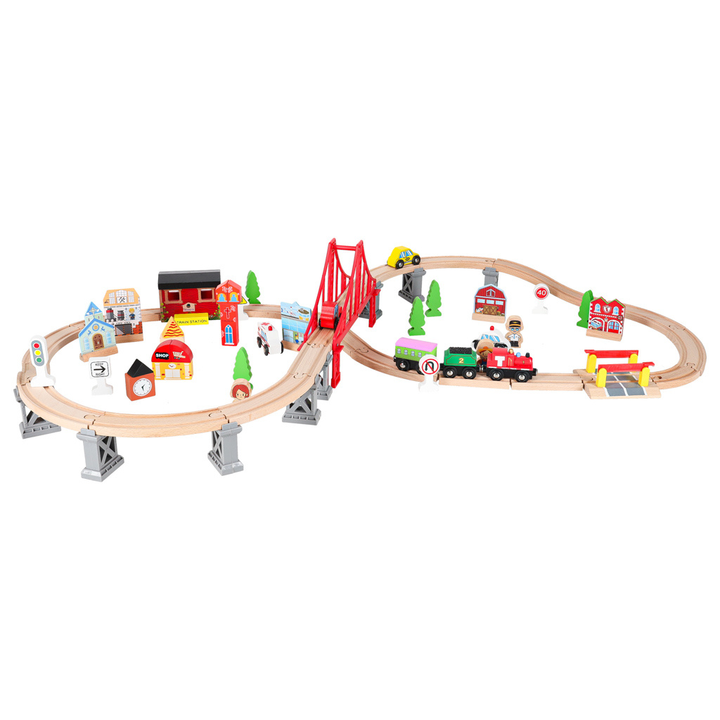Pripravljen je današnjim otrokom zagotoviti ure kreativne zabave in staršem nostalgičen povratek v preteklost. Lesena železnica je za najmlajše pravo doživetje! Barvni elementi, iz katerih nastajajo izjemne pokrajine. Bogat komplet - do 70 elementov! - ponuja praktično neomejene ustvarjalne možnosti.Vključno: