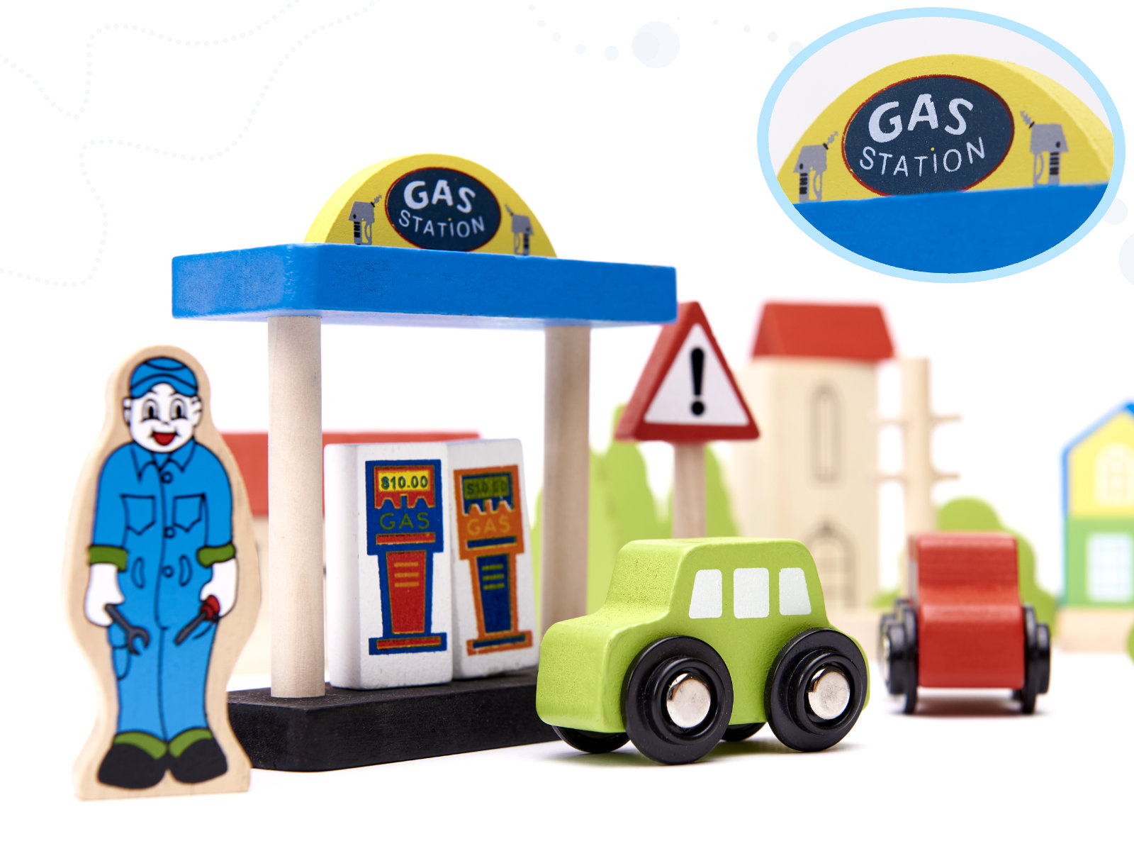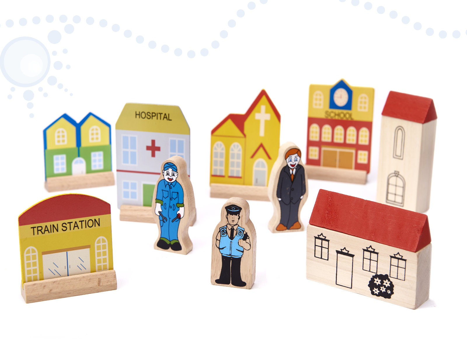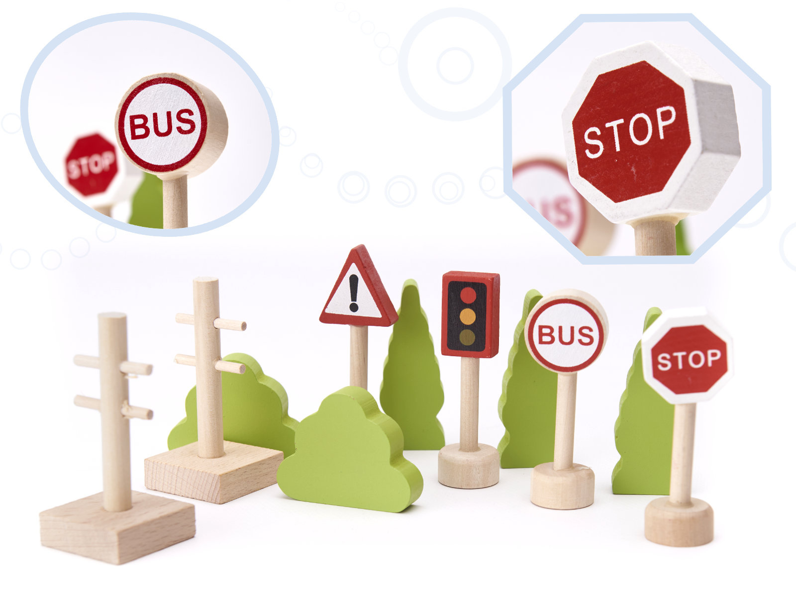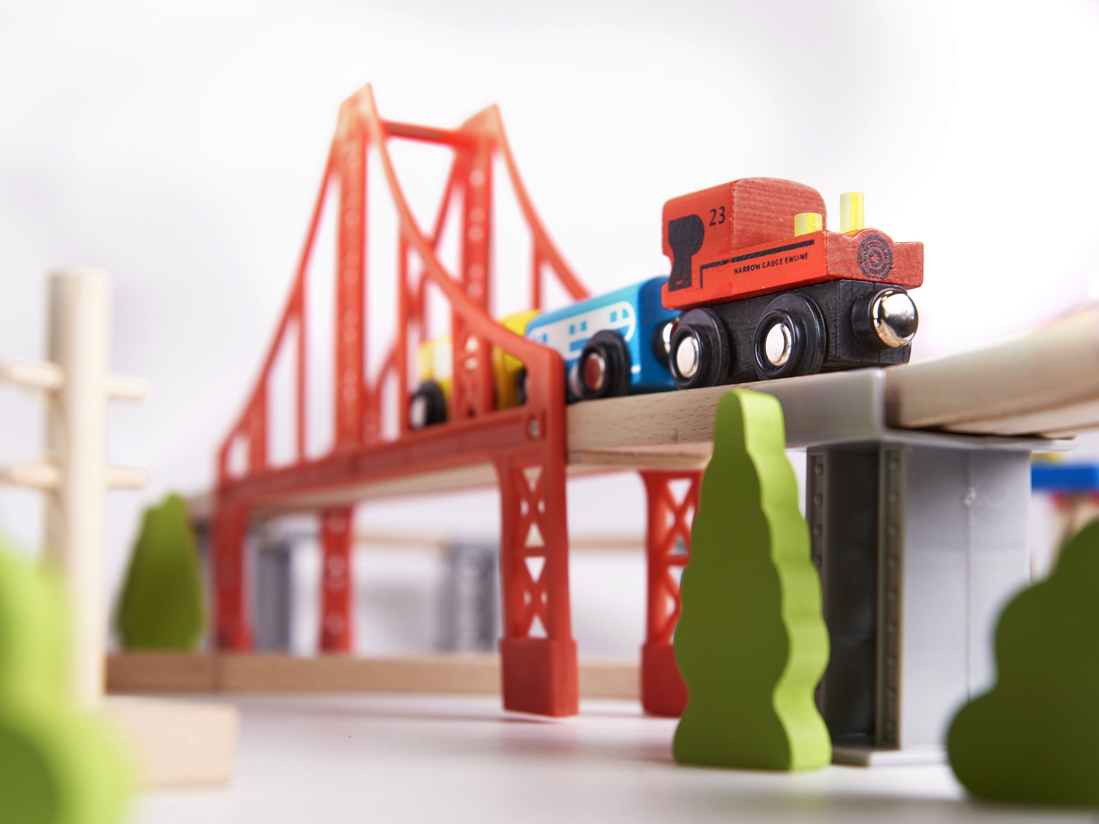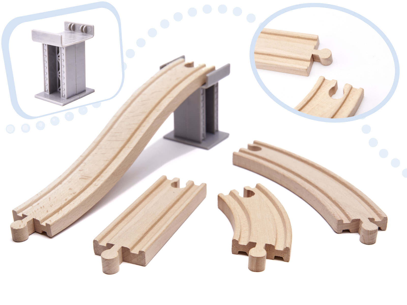 Pripravljen je današnjim otrokom zagotoviti ure kreativne zabave in staršem nostalgičen povratek v preteklost. Lesena železnica je za najmlajše pravo doživetje! Barvni elementi, iz katerih nastajajo izjemne pokrajine. Bogat komplet - do 70 elementov! - ponuja praktično neomejene ustvarjalne možnosti.Vključno: