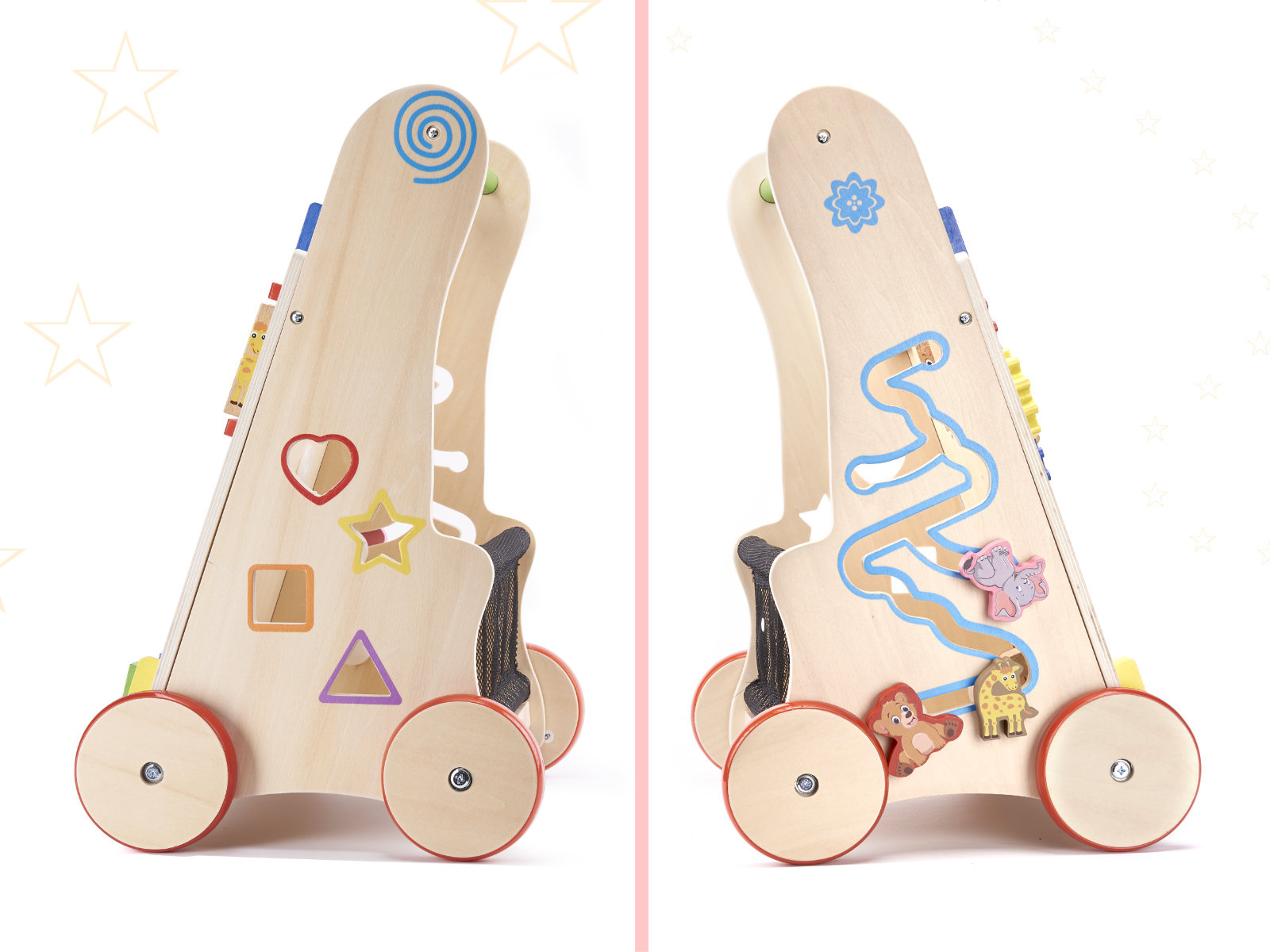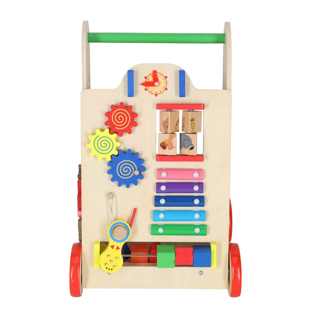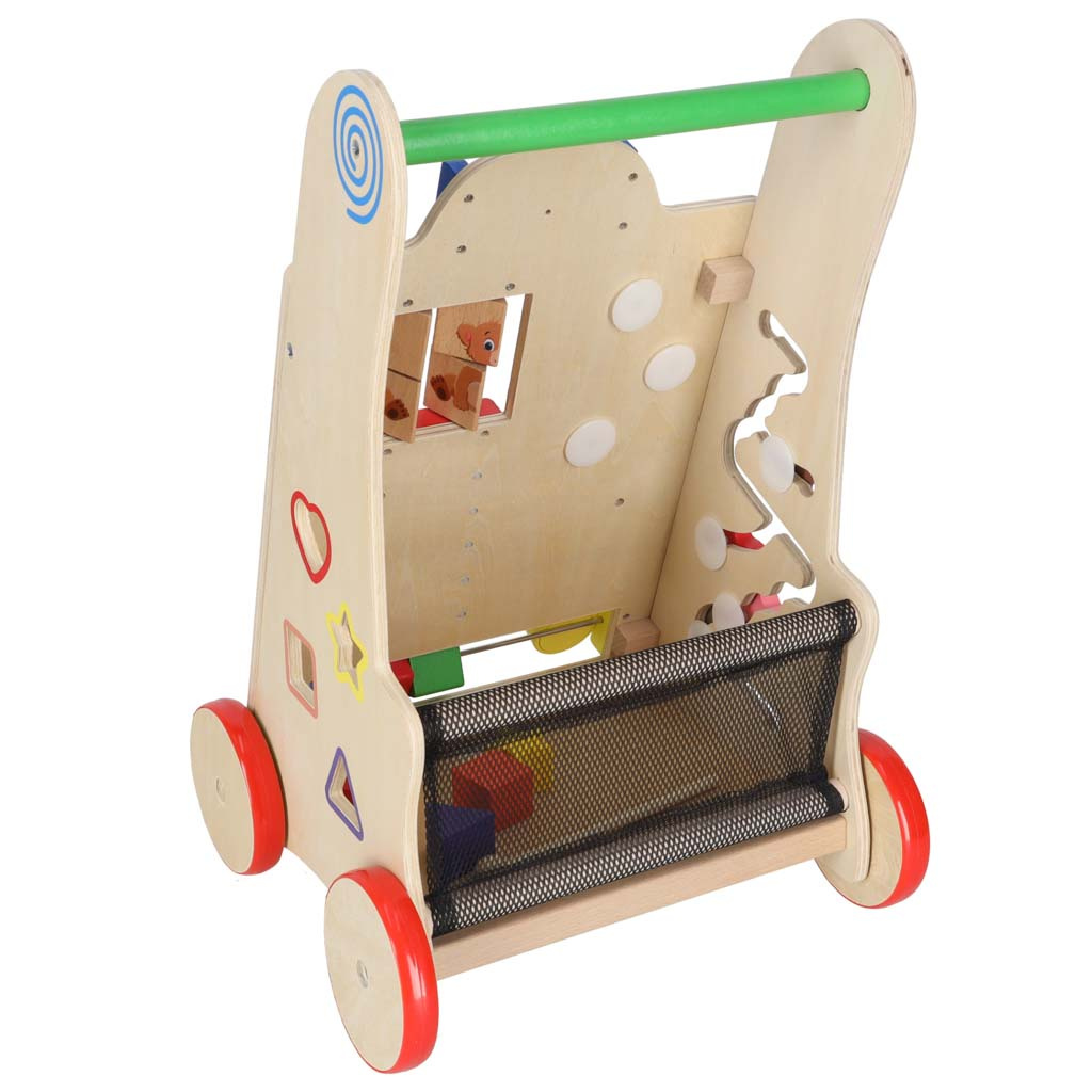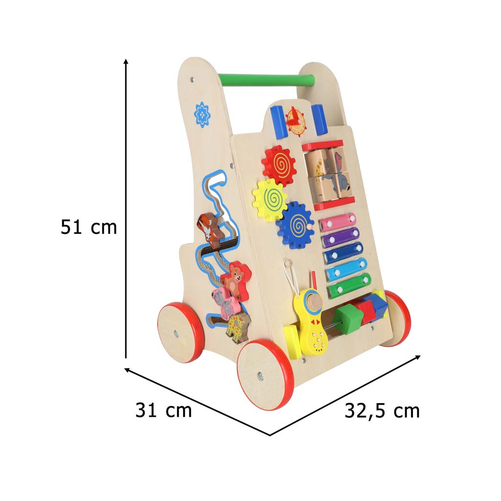 V poznejših letih bo prav prišel tudi kot voziček za priljubljene igrače in prvo računalo.Hoja z odrivnim kolesom pomaga malčku ohranjati ravnotežje pri učenju hoje. Podpira razvoj ročnih spretnosti in razvija motoriko celotnega telesa. Hojica bo spodbudila vašega malčka k telesni aktivnosti.Naš hojček je stabilna opora za malčka, ki se uči hoditi. Otroku je ne bo uspelo prevrniti. Lesena kolesca so zaščitena z nedrsečo gumijasto plastjo.Estetski dizajn, izrazite barve, poudarek na podrobnostih - prijeten in varen spremljevalec za vašega otroka.To poganjalec bo všeč staršem, ki iščejo ekološke dodatke za svojega otroka. Lesene igrače so odlična izbira!Ni samo hojica! Razvijalci so poskrbeli, da igra malčkom nudi zabavo na več načinov. Na sprednji strani je nameščena manipulacijska plošča, polna elementov, ki bodo razveselili otroke:
