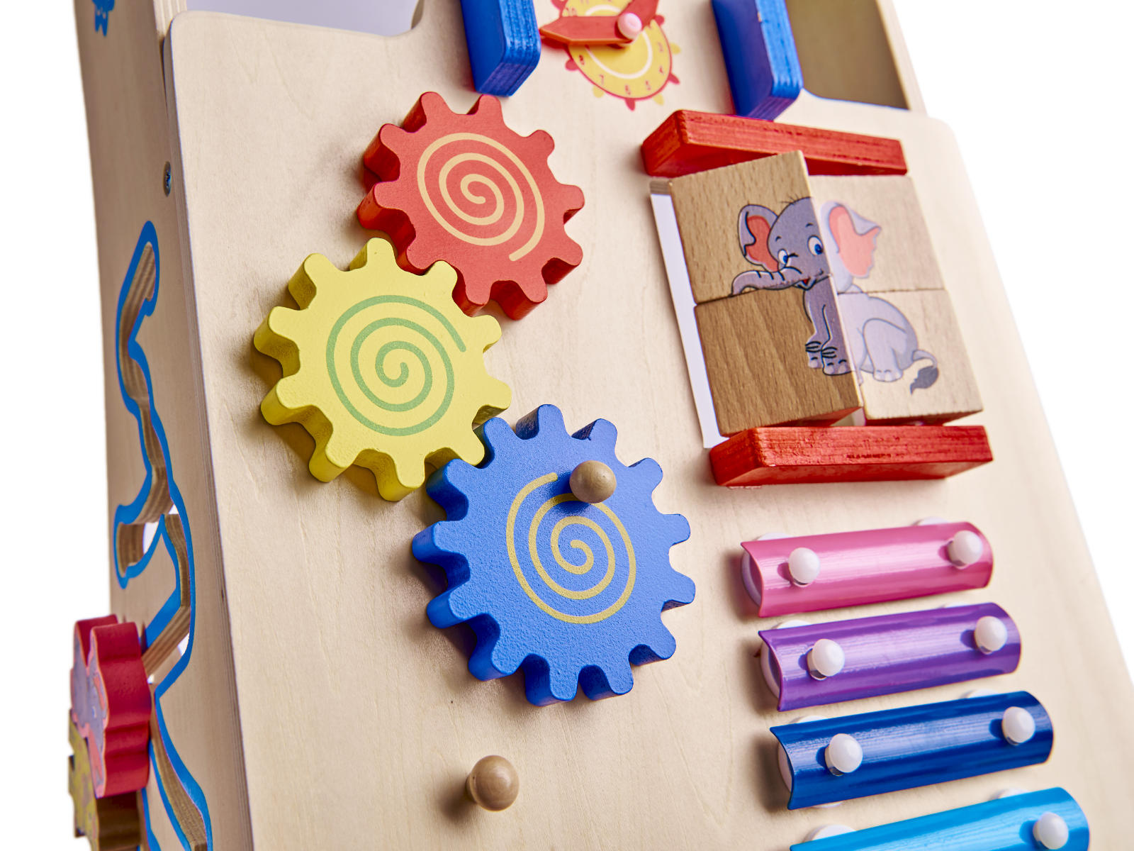 Barvni elementi pritegnejo oko in majhne ročice s svojimi barvami.