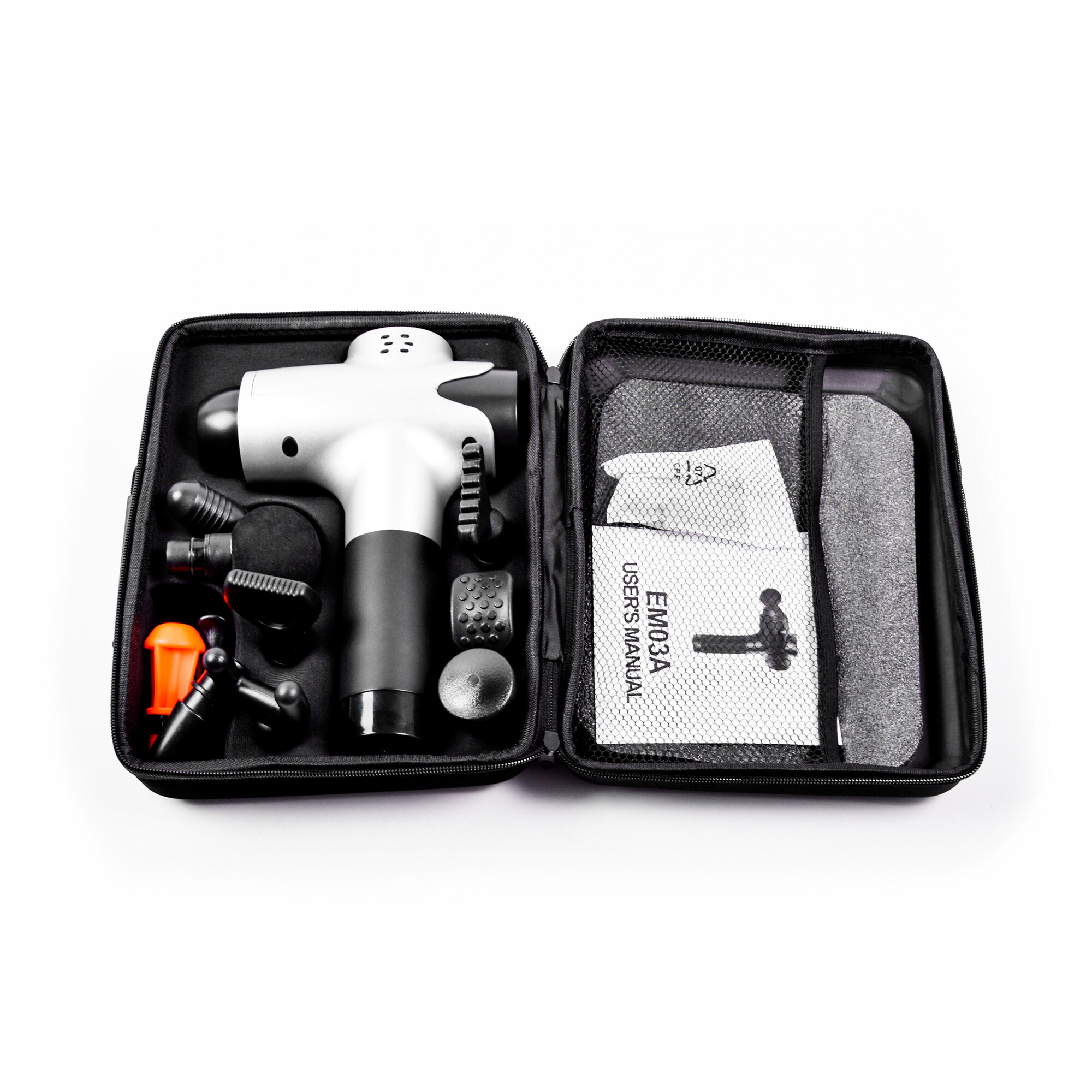 Zagotovo boste cenili nedrseč ročaj za trden oprijem.Masažna pištola je priložena v praktičnem kovčku za enostaven prevoz, tako da jo lahko brez težav vzamete s seboj kamorkoli.