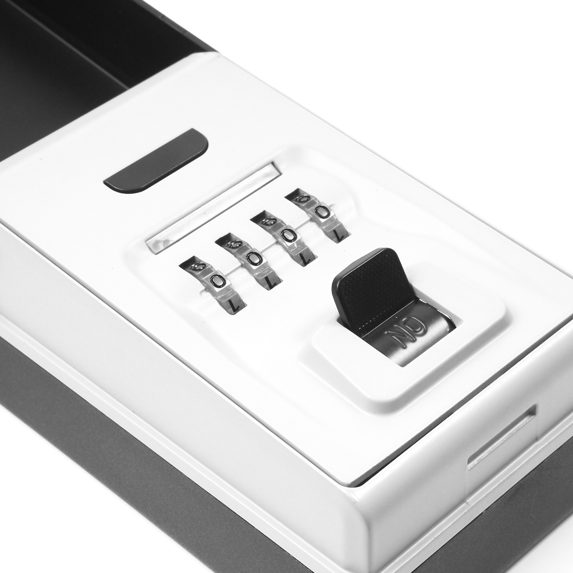 Omarica je opremljena s kodno ključavnico, ki omogoča varno shranjevanje ključev brez skrbi za nepooblaščen dostop. Nastavljiva koda ključavnice zagotavlja prilagodljivost in varnost, vse to brez potrebe po uporabi ključev.