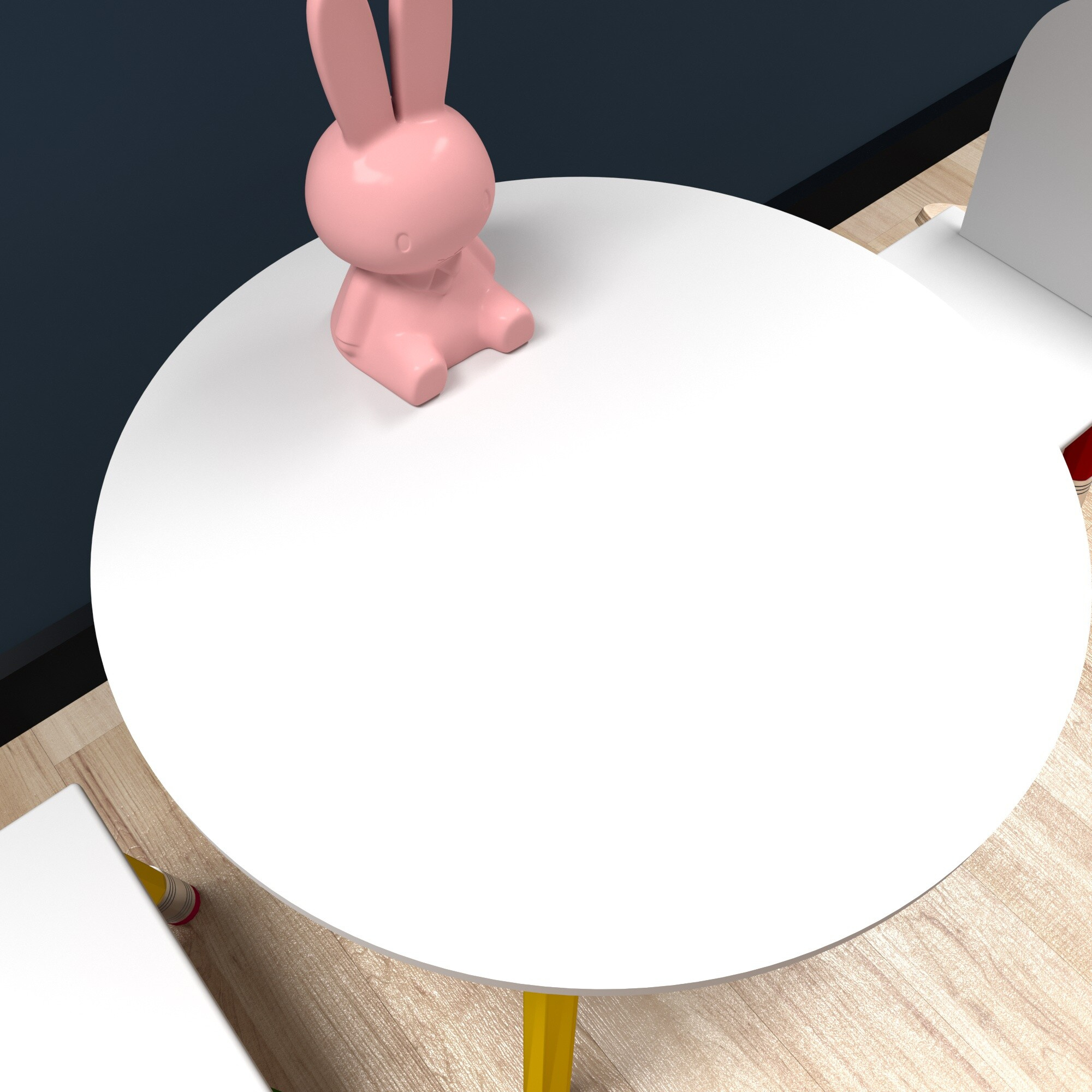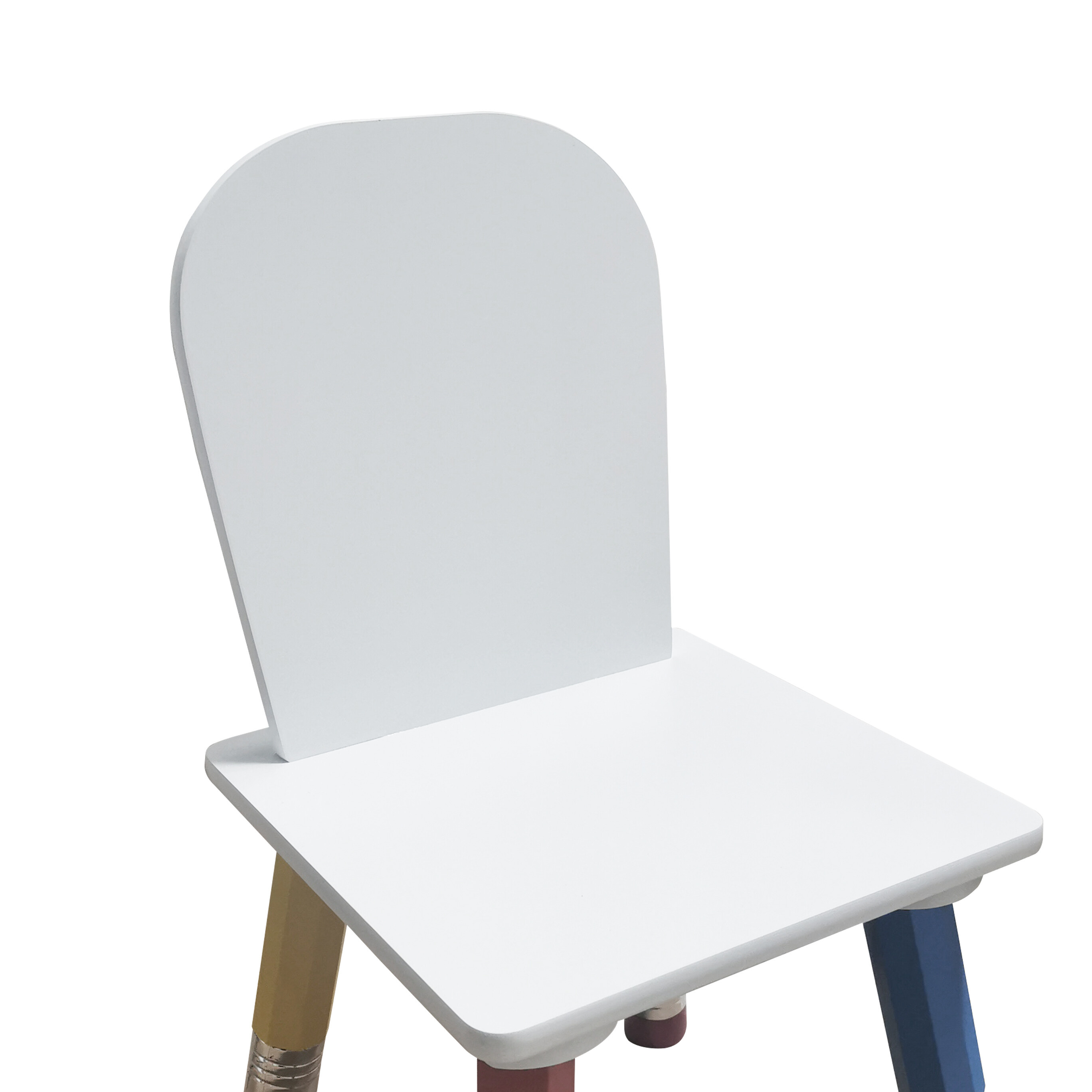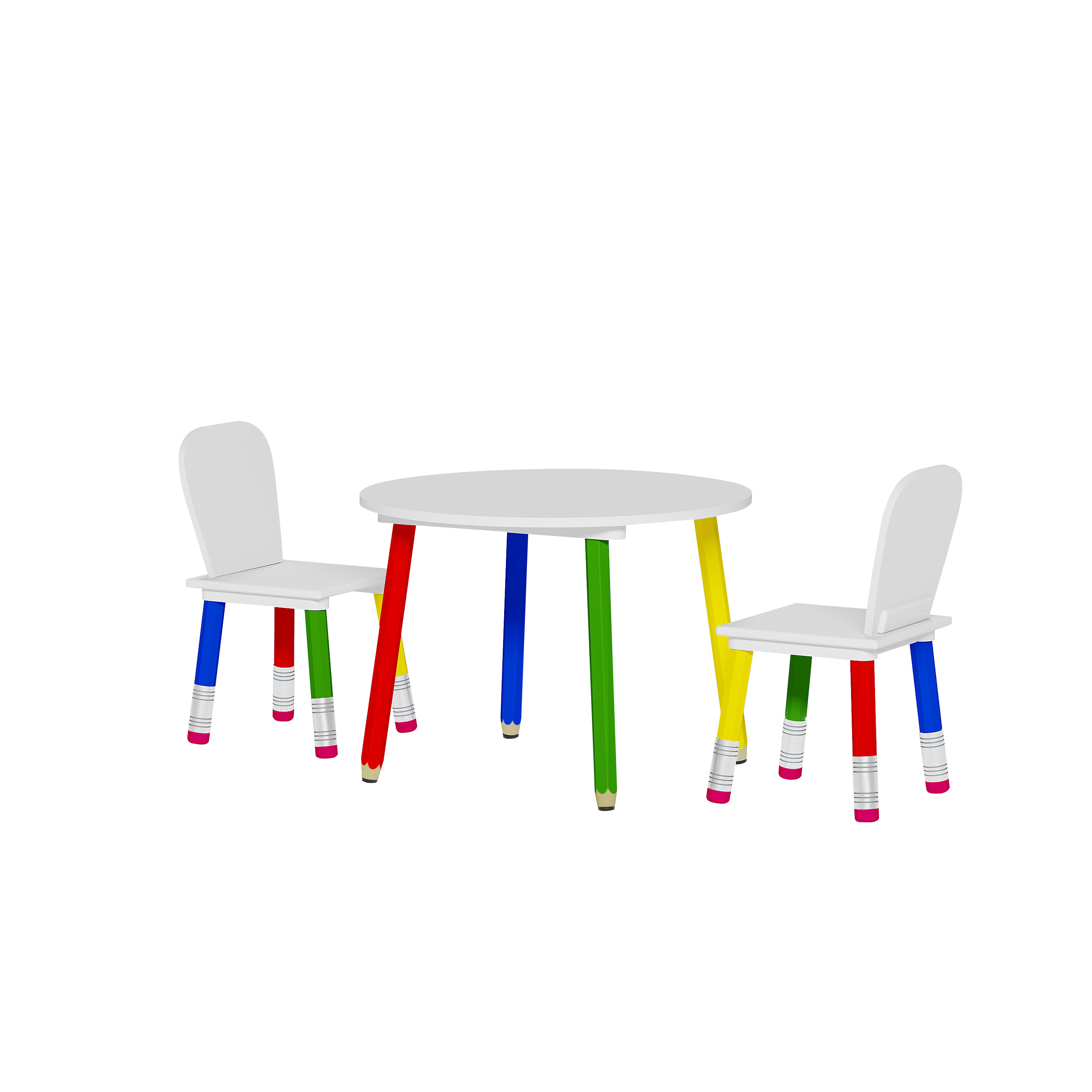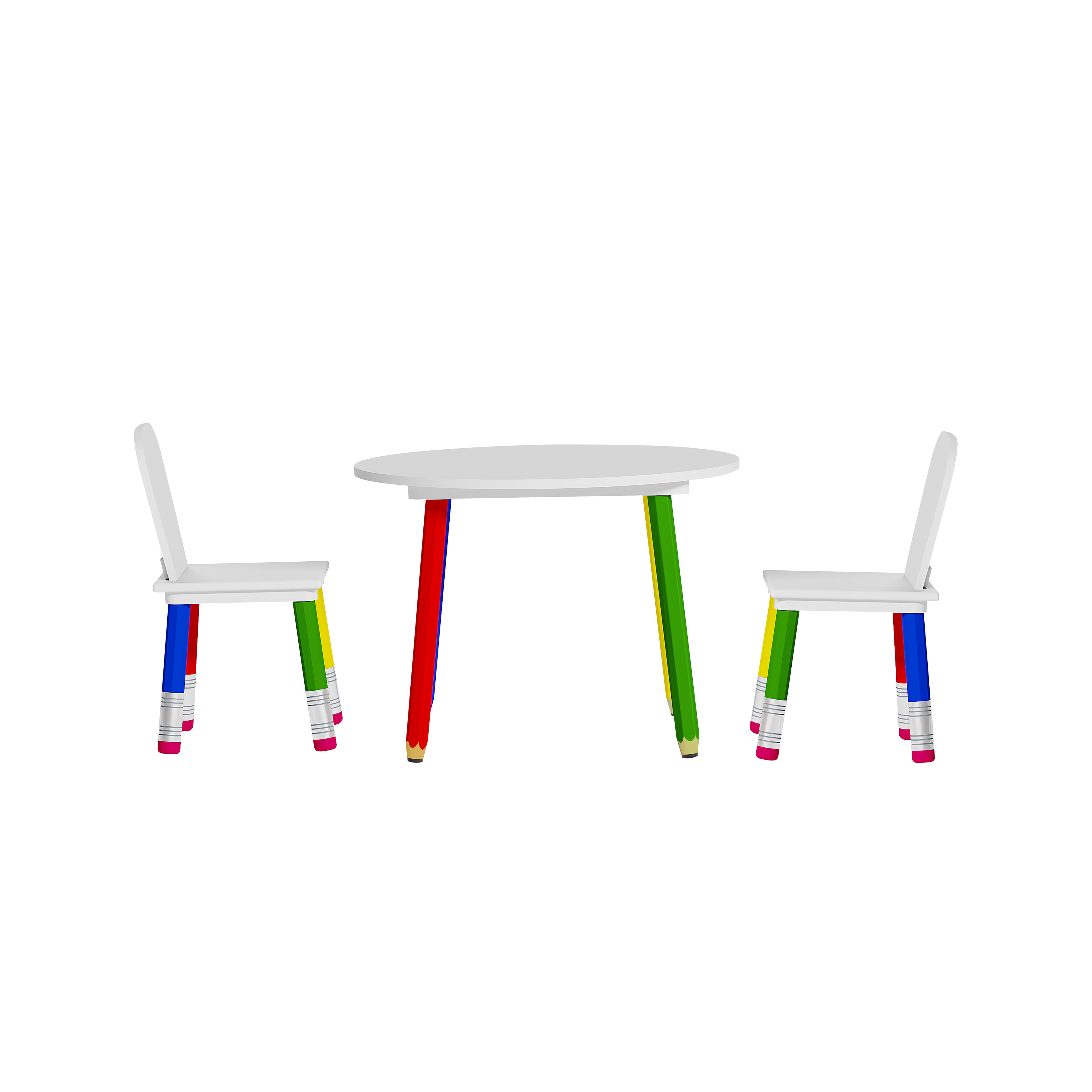 Priskrbite svojim otrokom ta otroški barvni jedilni set z mizico in stolčki.Noge pohištva spominjajo na otroške barvice.