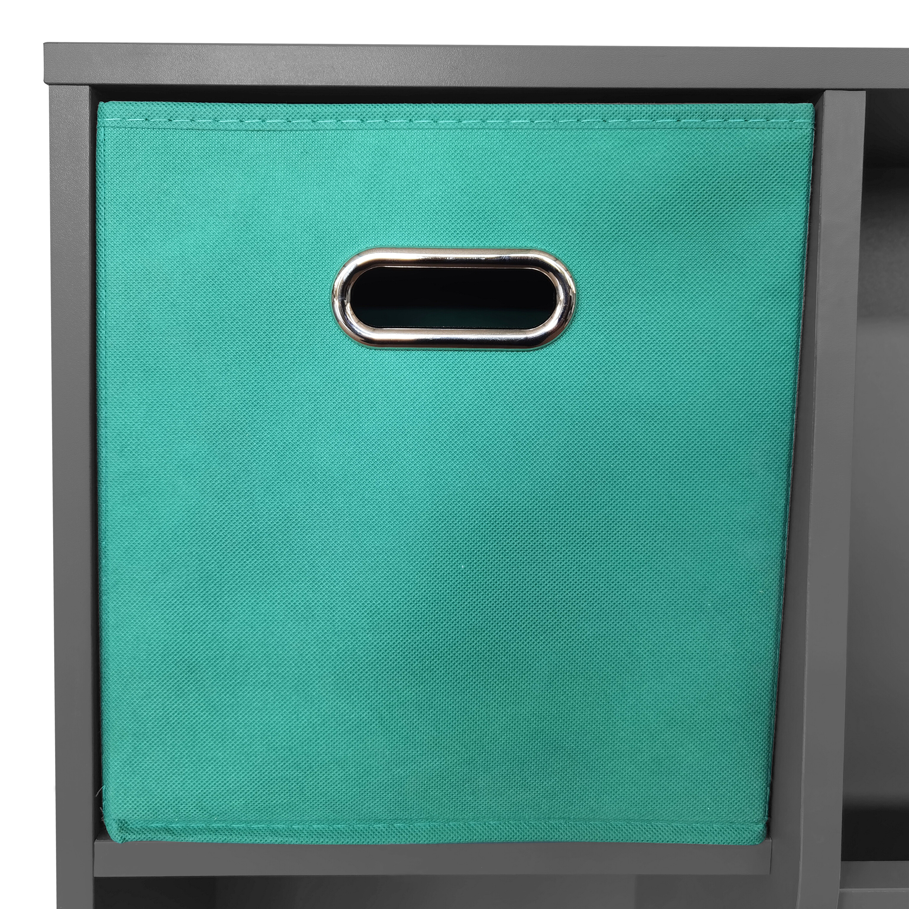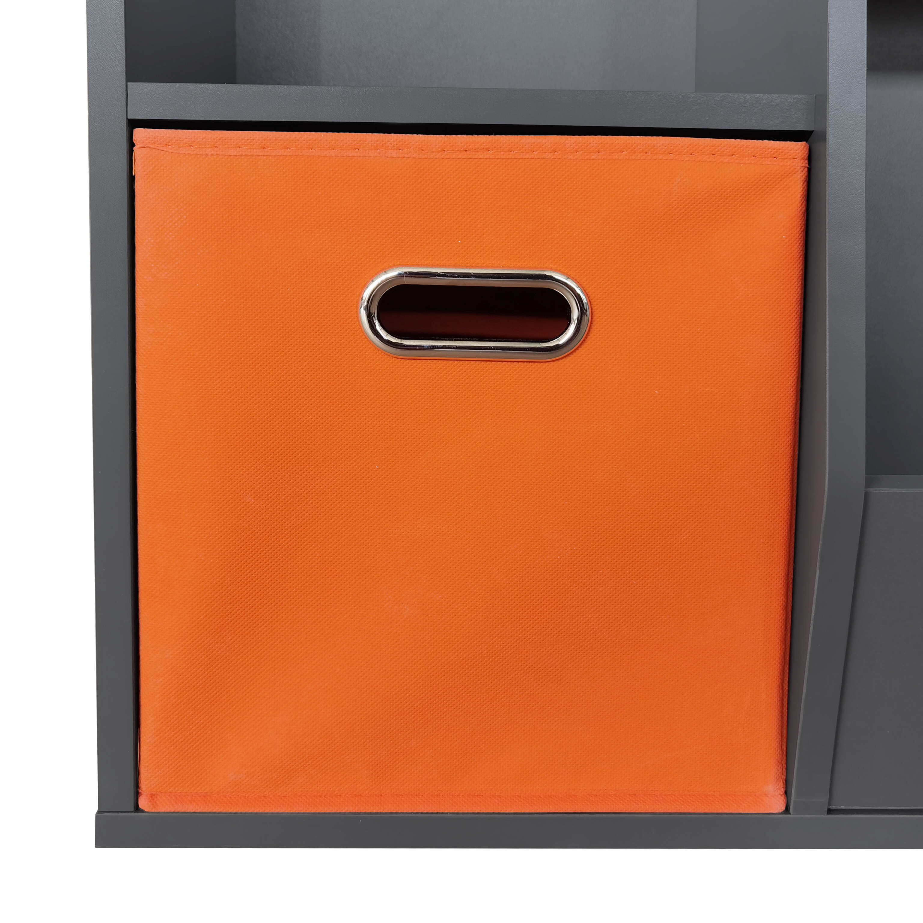 Del sta dva odstranljiva tekstilna zaboja z ročaji, ki lahko služita za shranjevanje otroških zakladov.Na vrhu je plošča, ki ustvarja dodaten primeren prostor za odlaganje različnih igrač ali malenkosti.