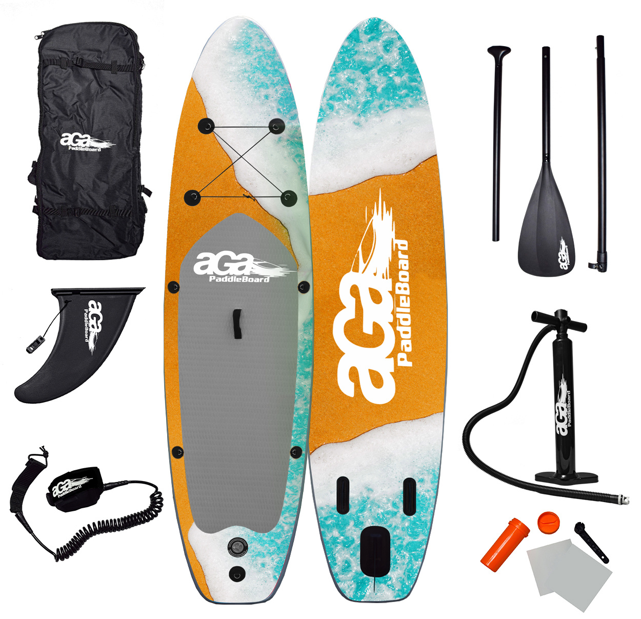 V paketu boste našli vse, kar potrebujete za odhod na vodo: tridelno aluminijasto veslo z nastavljivo dolžino, črpalko z manometrom, nosilec za kamero, varnostno vrvico za nogo - leash, plavut, komplet za popravilo in torbo za prenos supa.