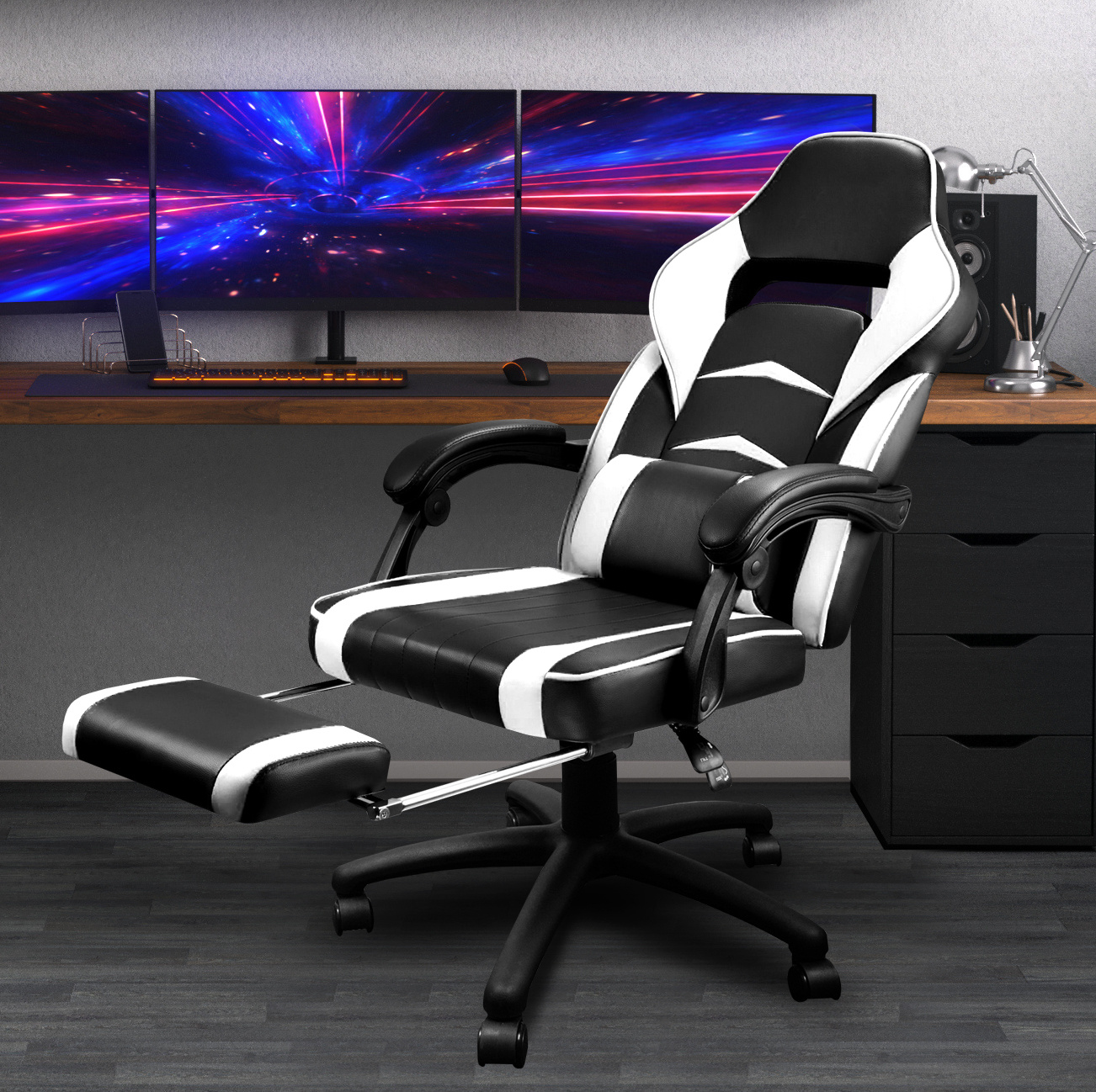Sedež in naslonjalo sta močno oblazinjena in vam zagotavljata udobje med dolgim in napornim delovnim dnem.Zahvaljujoč izvlečnemu podnožju si lahko privoščite sprostitev tudi med delom.