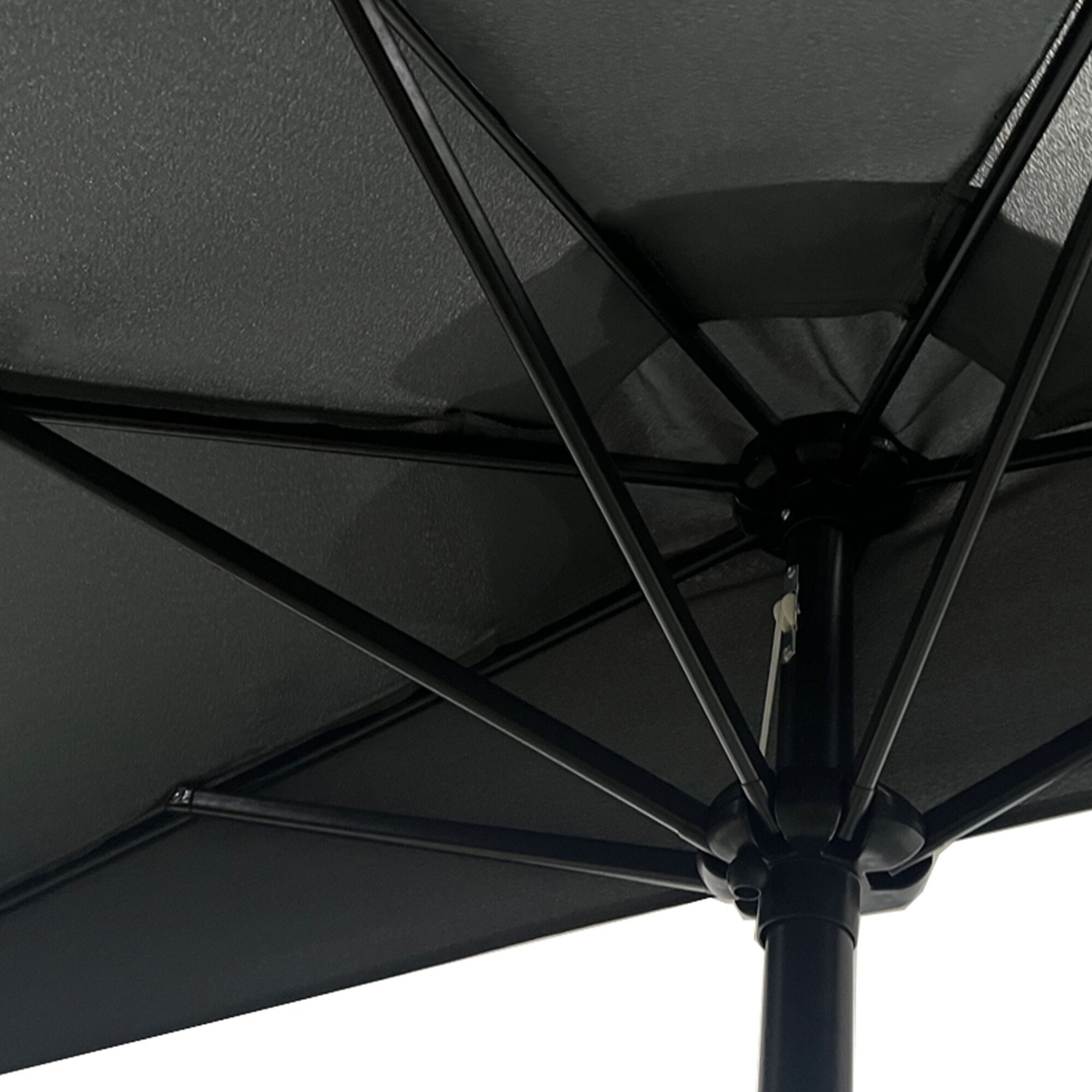 Polkrožni vrtni senčnik s trdno konstrukcijo in kakovostno prevleko, izdelano iz trpežnega poliestrskega materiala.