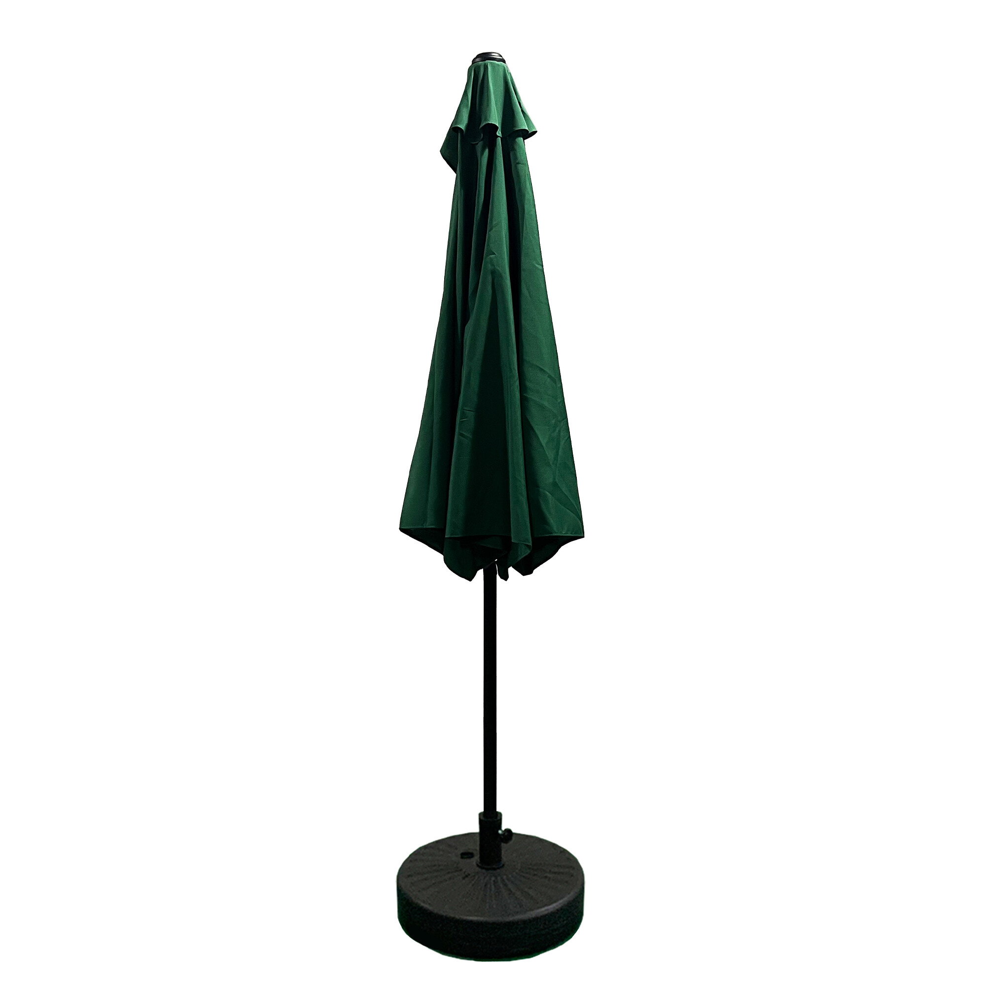 Polkrožni vrtni senčnik s trdno konstrukcijo in kakovostno prevleko, izdelano iz trpežnega poliestrskega materiala.
