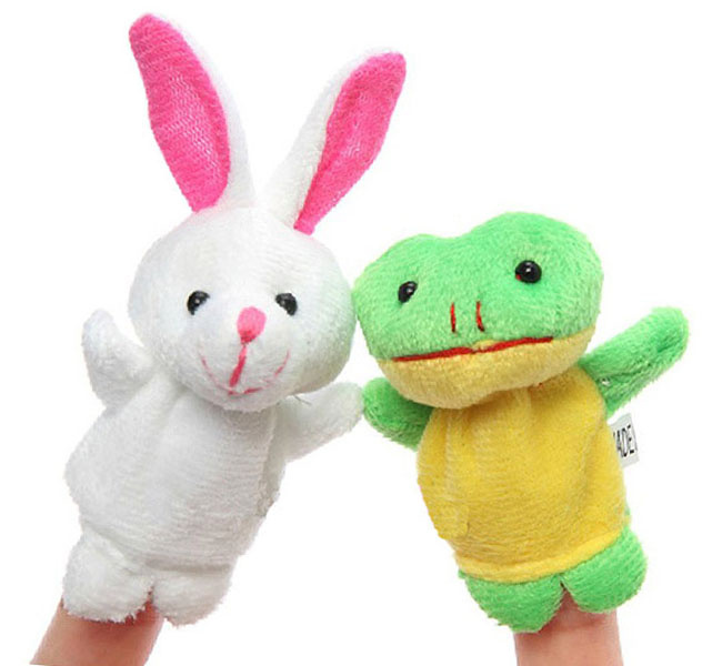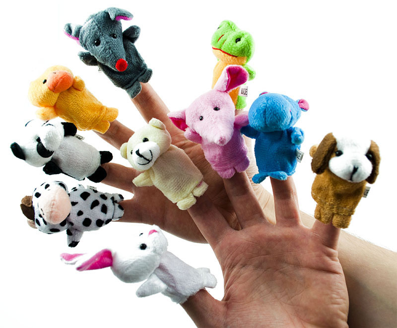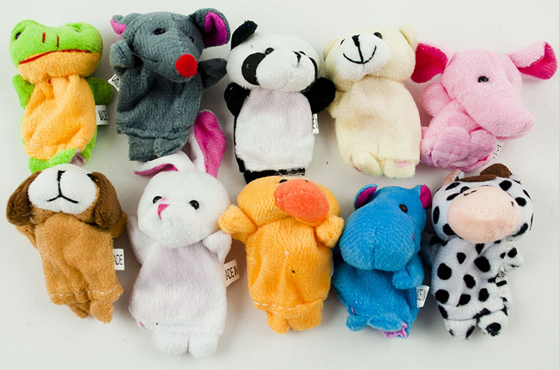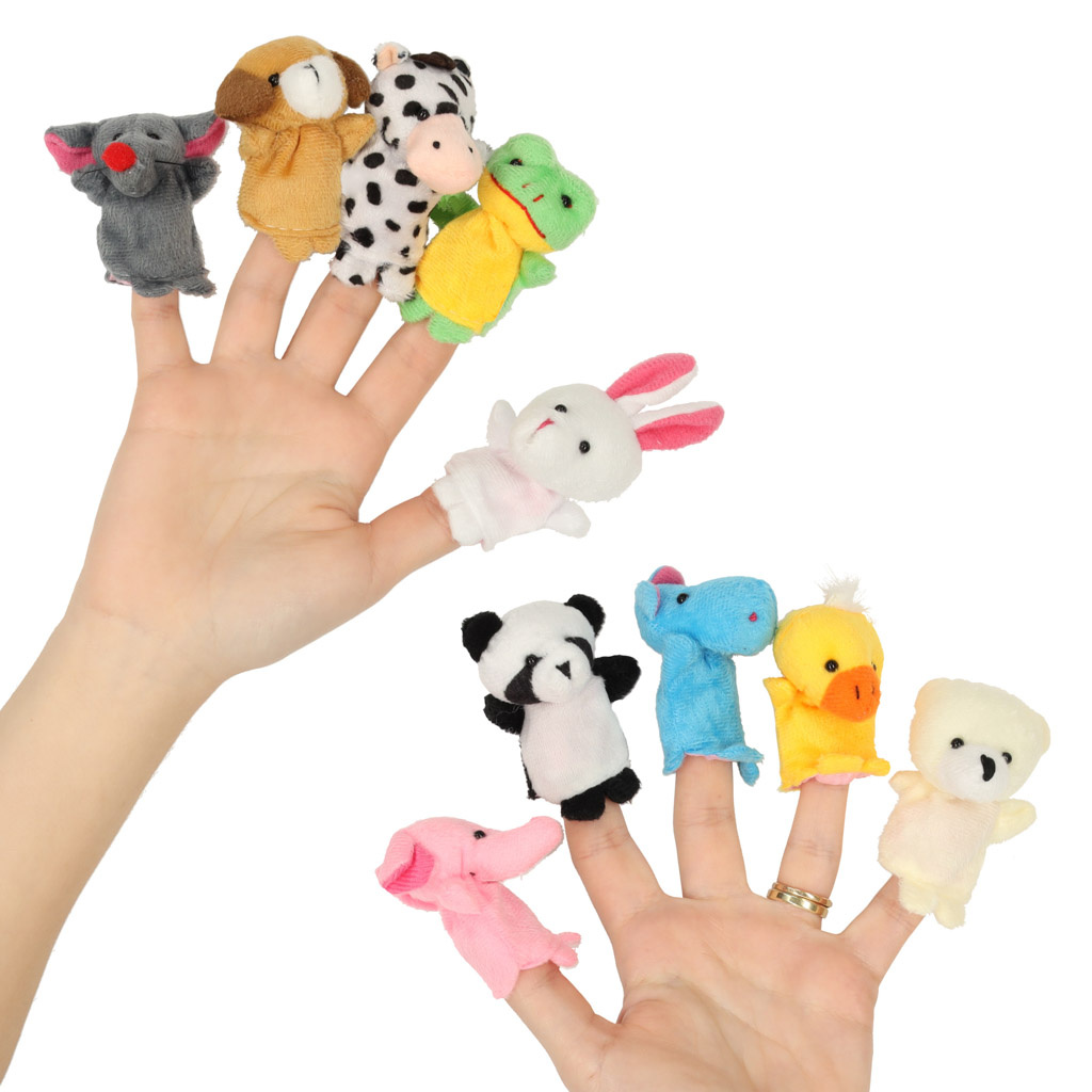 Komplet pisanih plišastih prstnih lutk v obliki živali: povodnega konja, slona, zajca, race, krave, psa, pande, medveda, miši in žabe. Set vsebuje 10 lutk. Dimenzije: dolžina 6,5-7 cm, širina 5,5-6 cm.Celoten opis