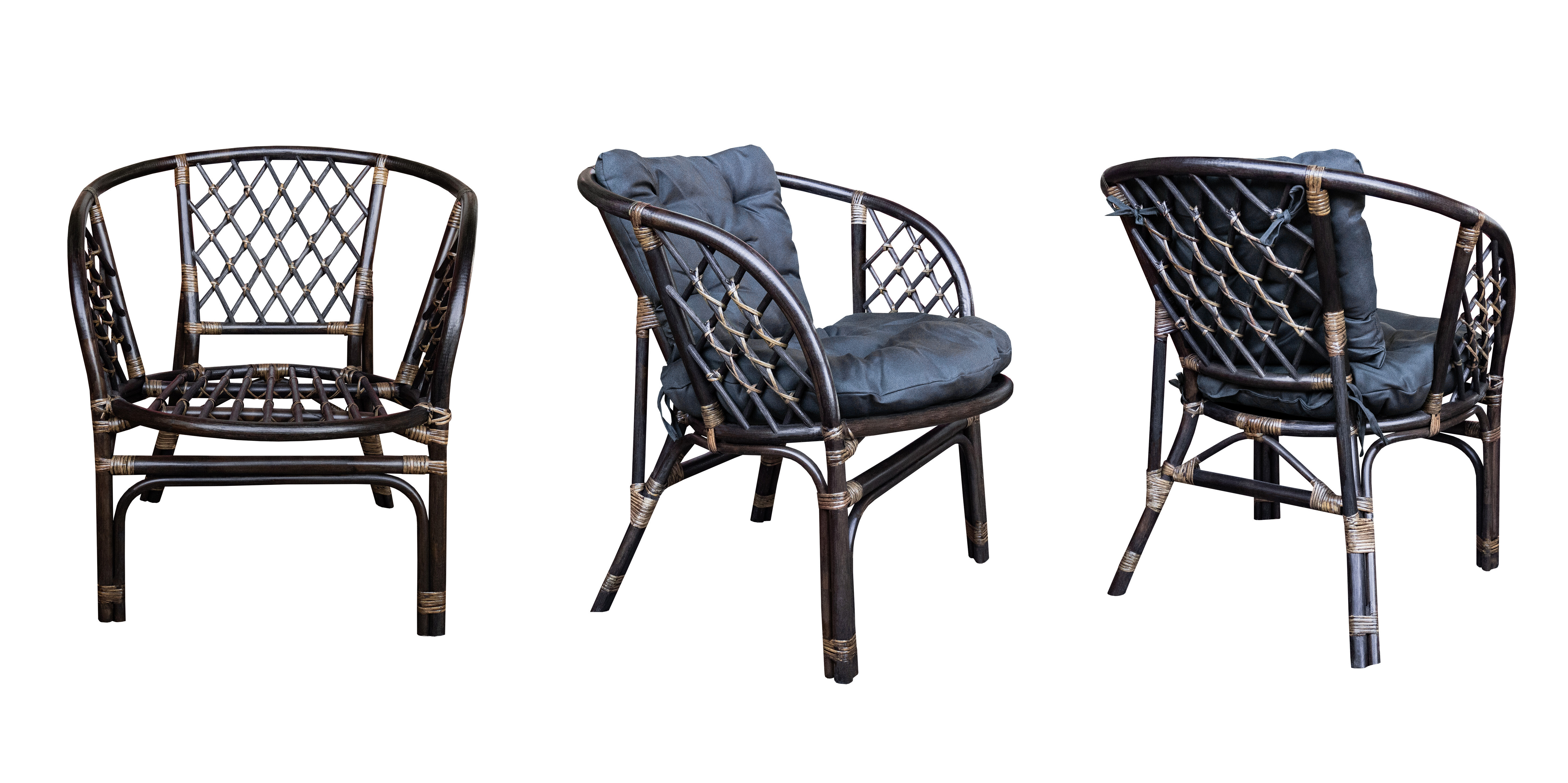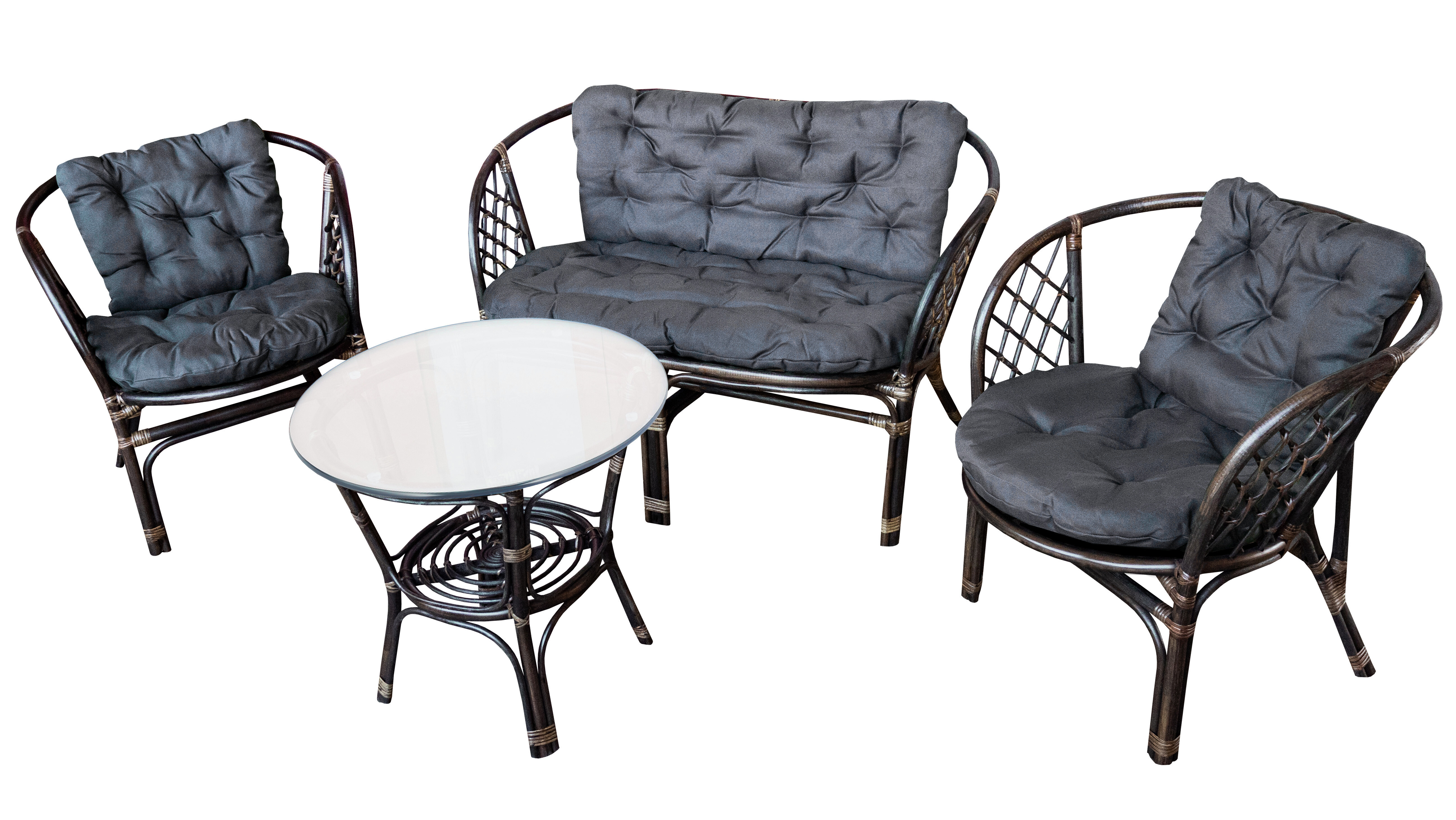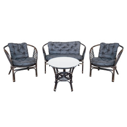 Kolekcija vsebuje dva ratanova stola, ratanovo klop in ratanovo mizo s stekleno ploščo.