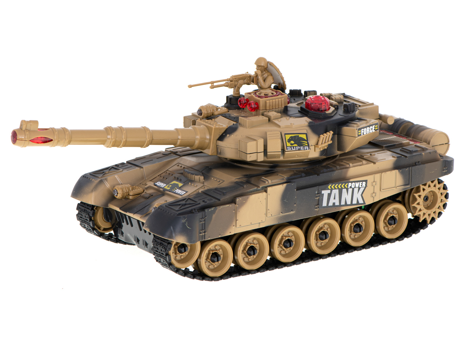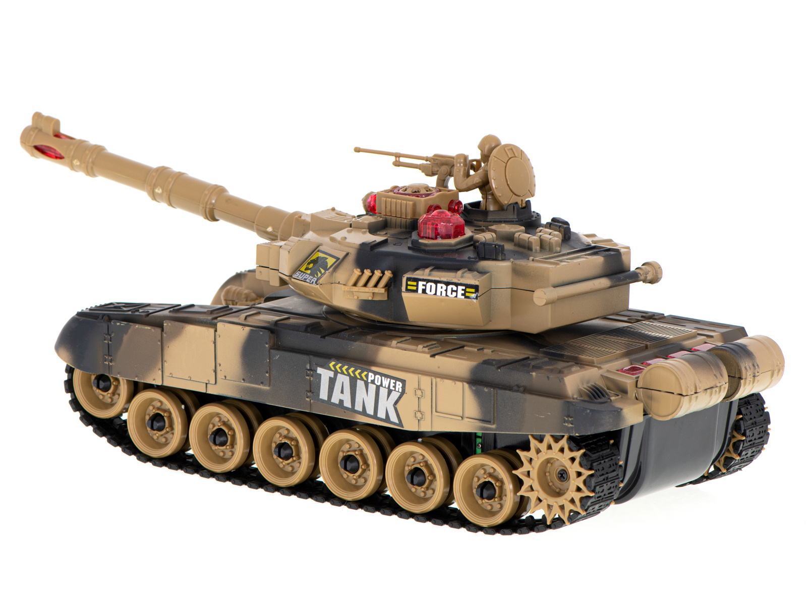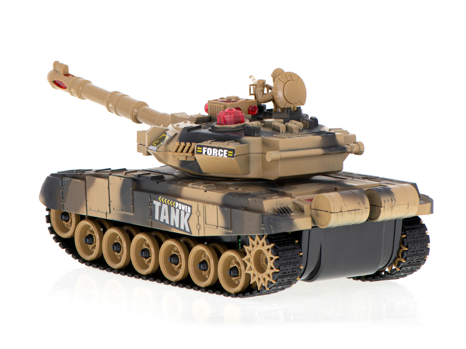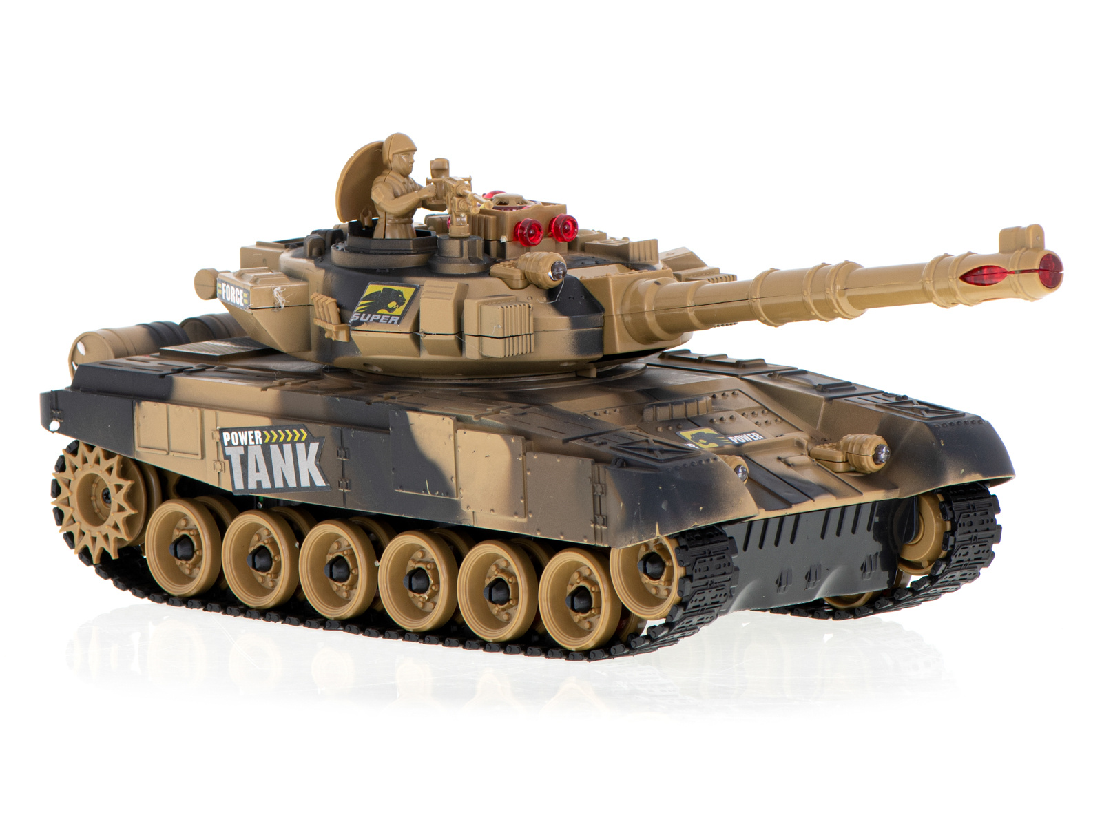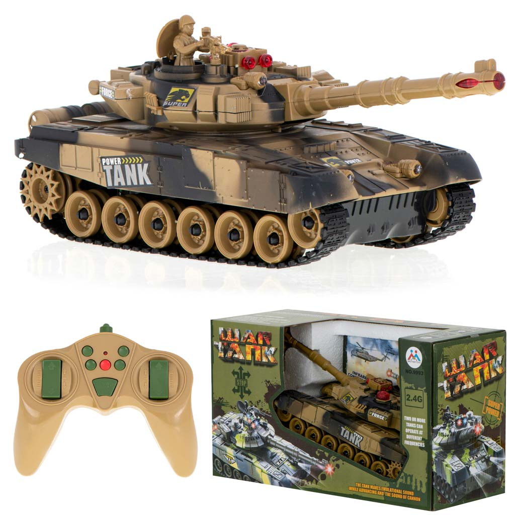 Vožnja v vse smeri. Zvoki, osvetlitev. Povratni sunek pri streljanju. Daljinsko vrtljiv stolp. Tank v 2 barvah in lahko se bori v infrardeči svetlobi. Napajanje: polnilna baterija Ni-Cd 7,2 V 700 mAh, 9V baterija. Dimenzije: 47x20,5x18,5 cm.Celoten opis