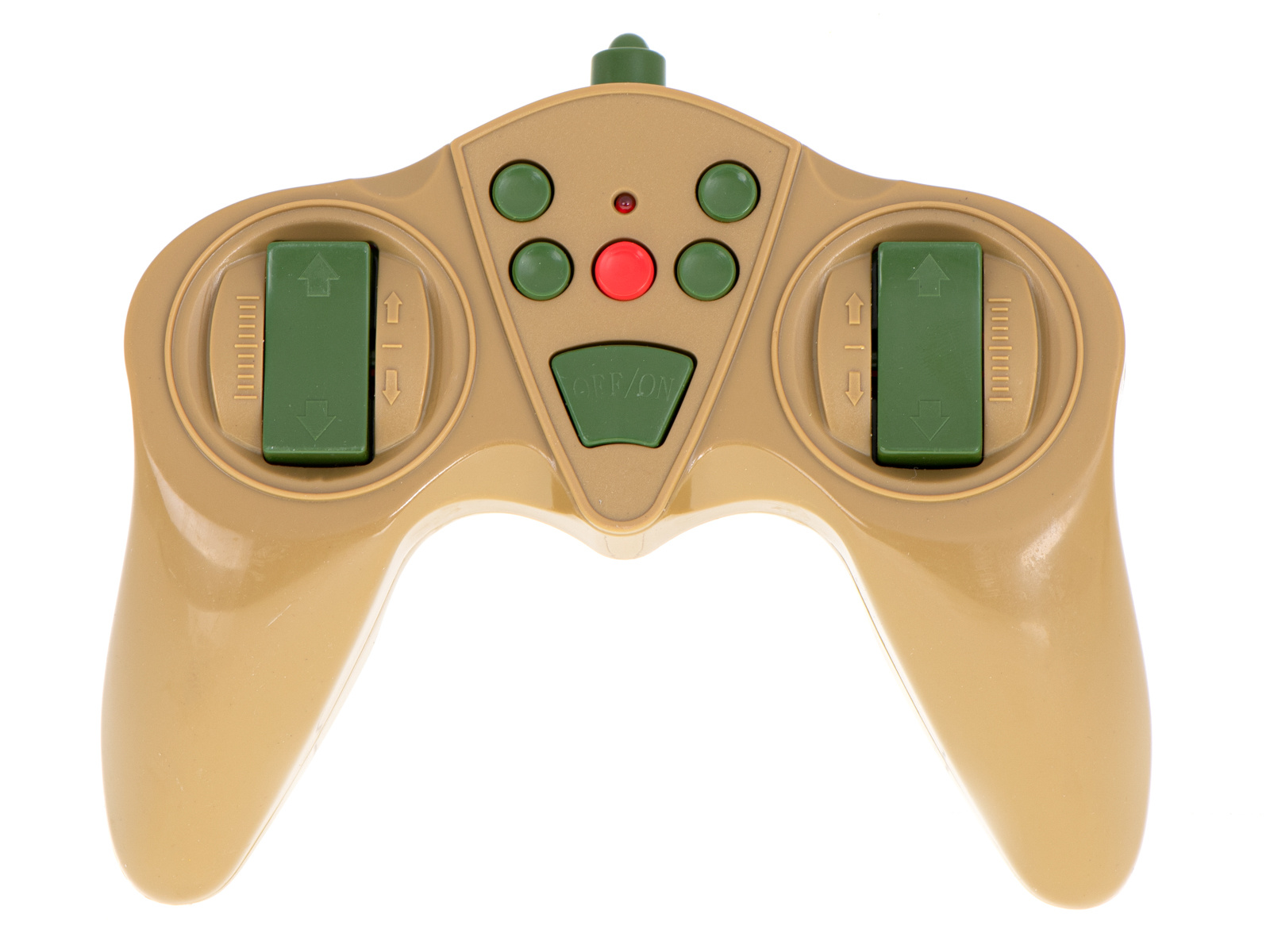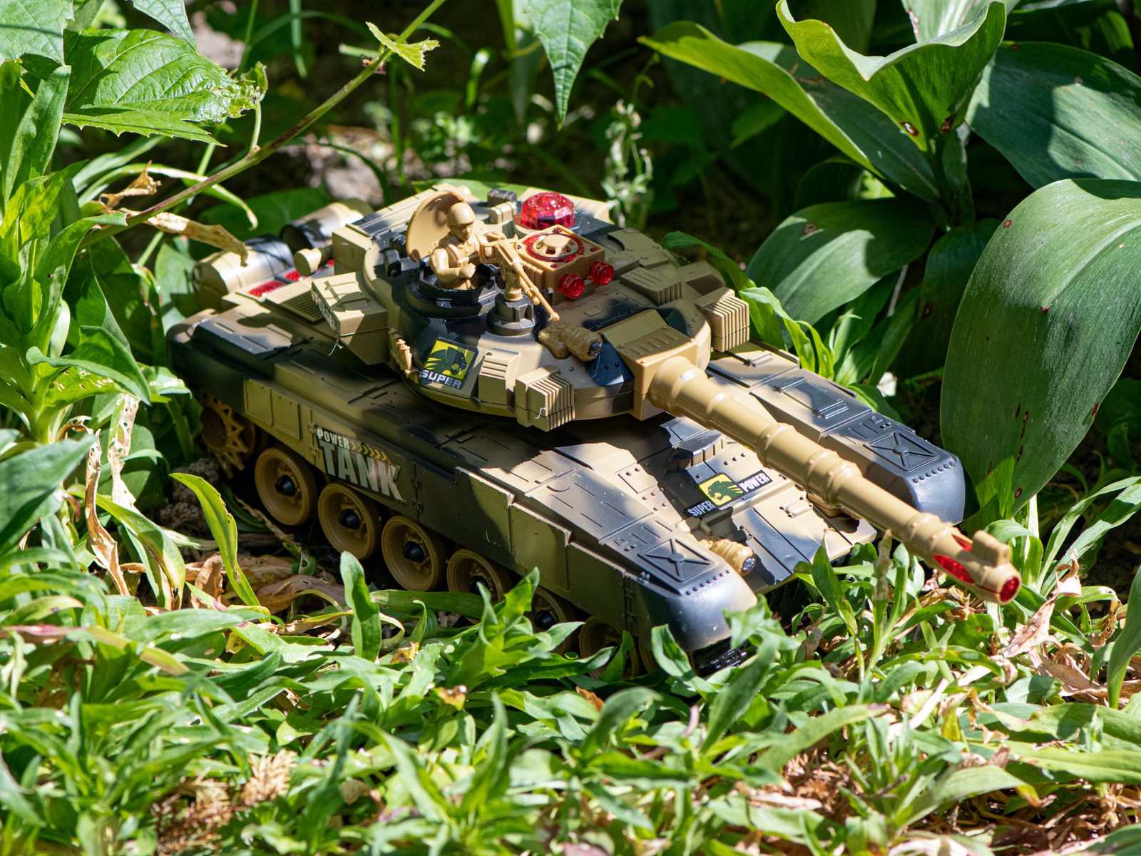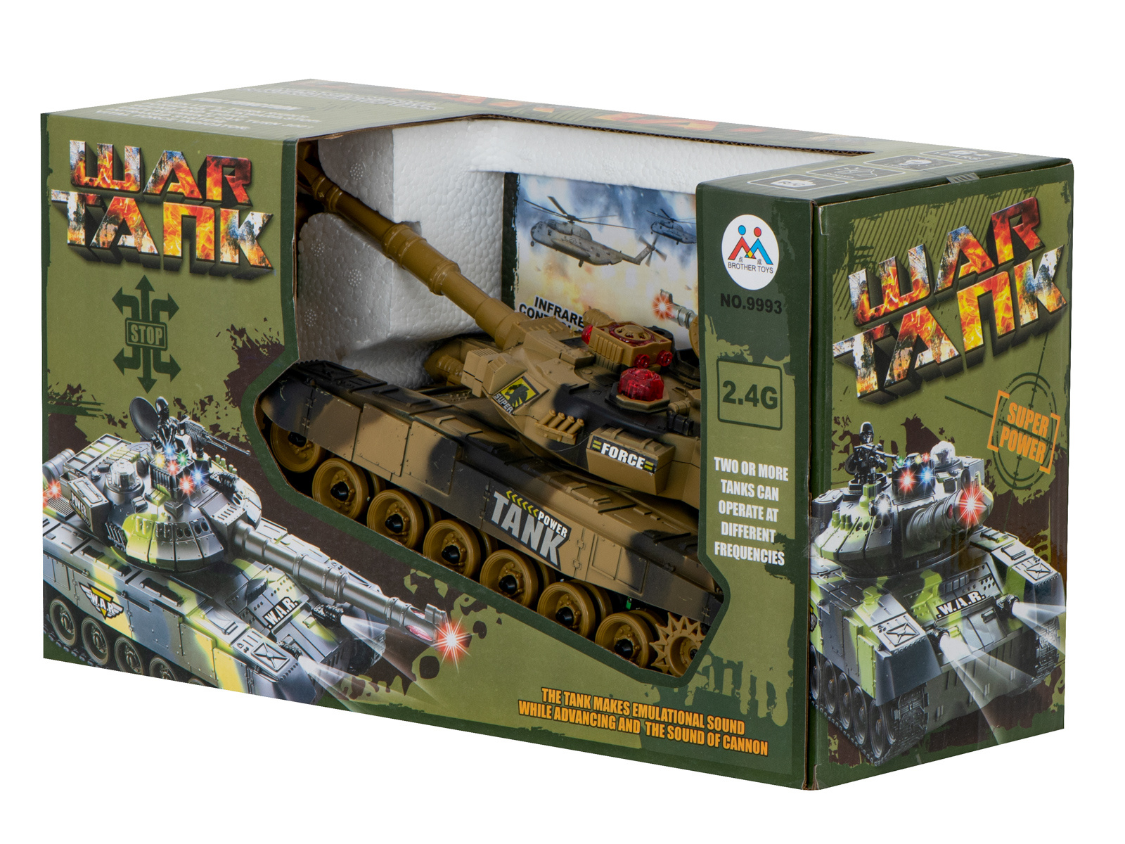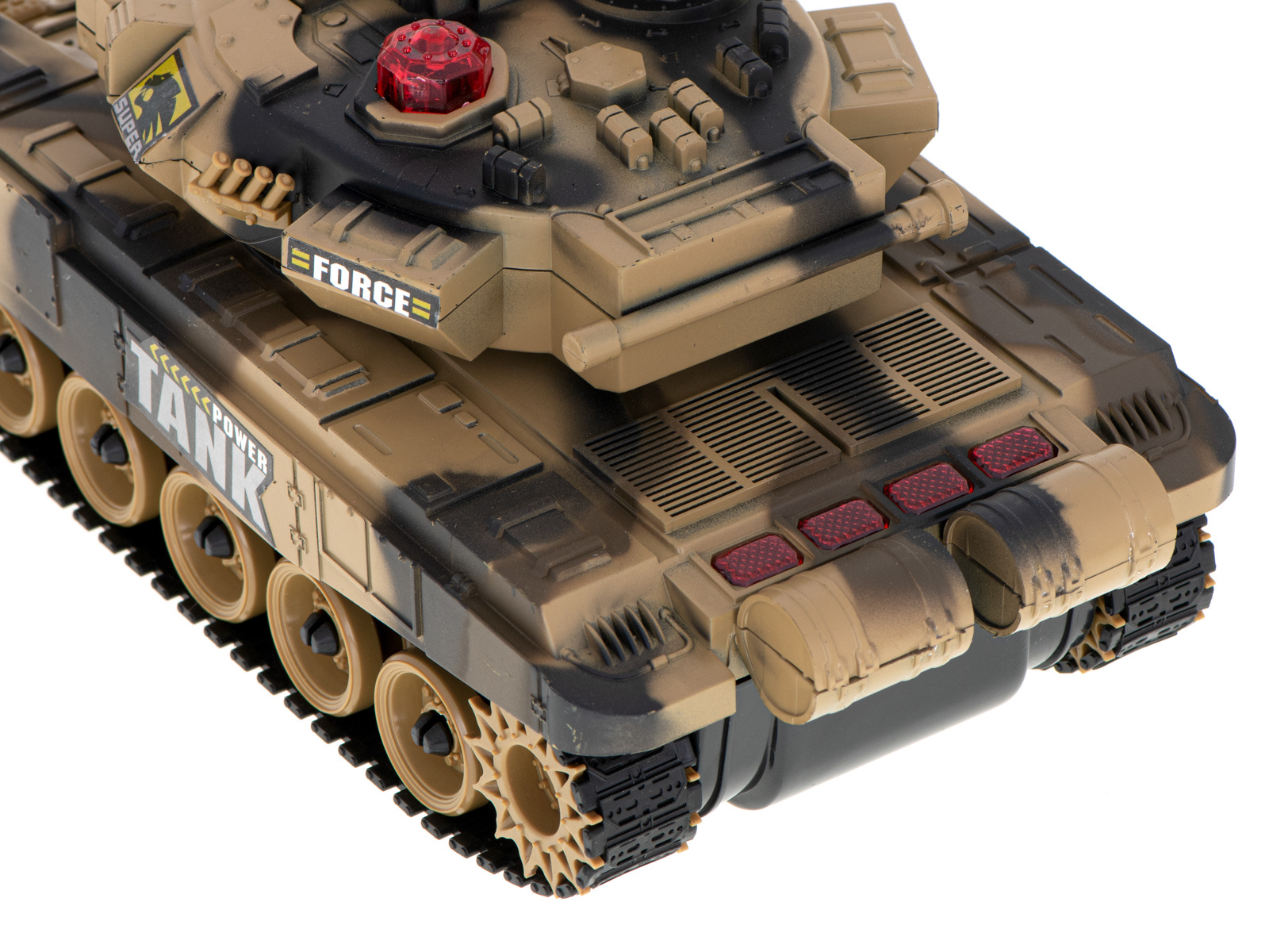 Vožnja v vse smeri. Zvoki, osvetlitev. Povratni sunek pri streljanju. Daljinsko vrtljiv stolp. Tank v 2 barvah in lahko se bori v infrardeči svetlobi. Napajanje: polnilna baterija Ni-Cd 7,2 V 700 mAh, 9V baterija. Dimenzije: 47x20,5x18,5 cm.Celoten opis