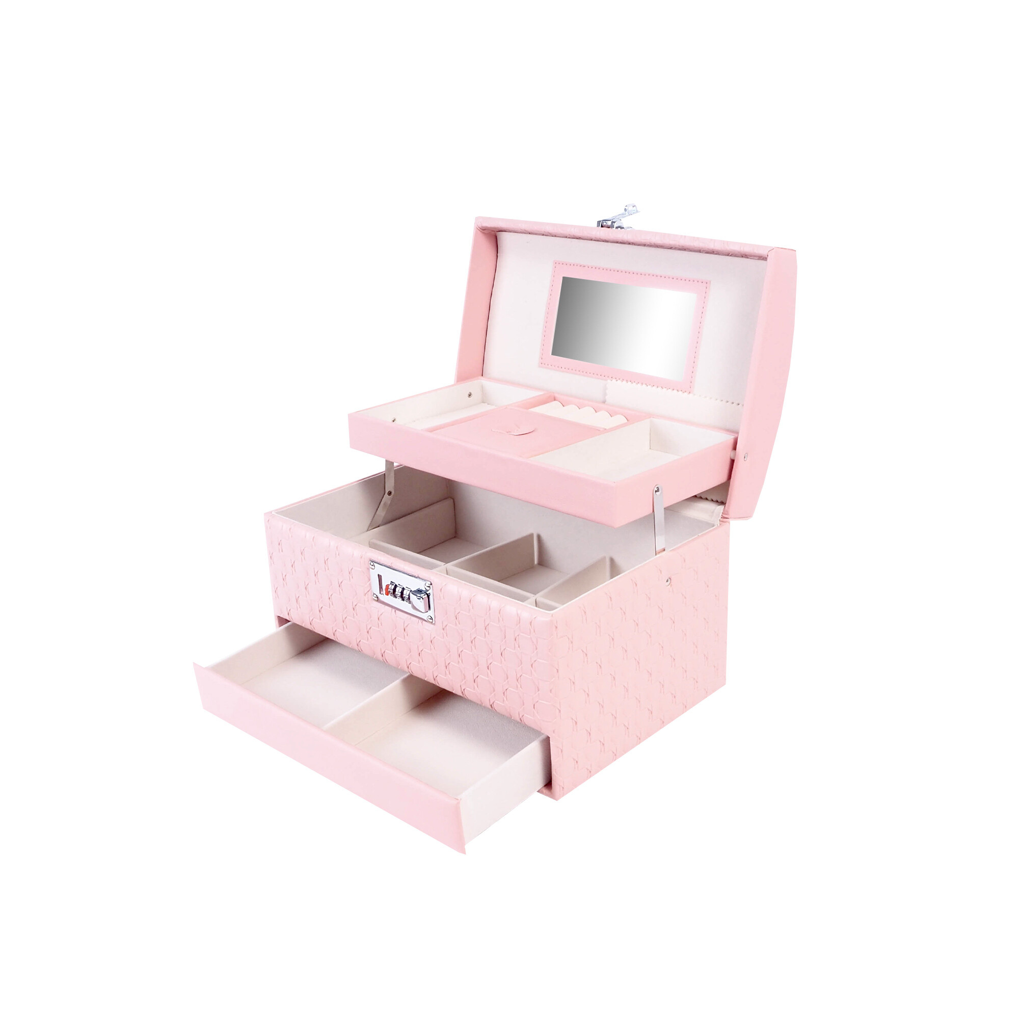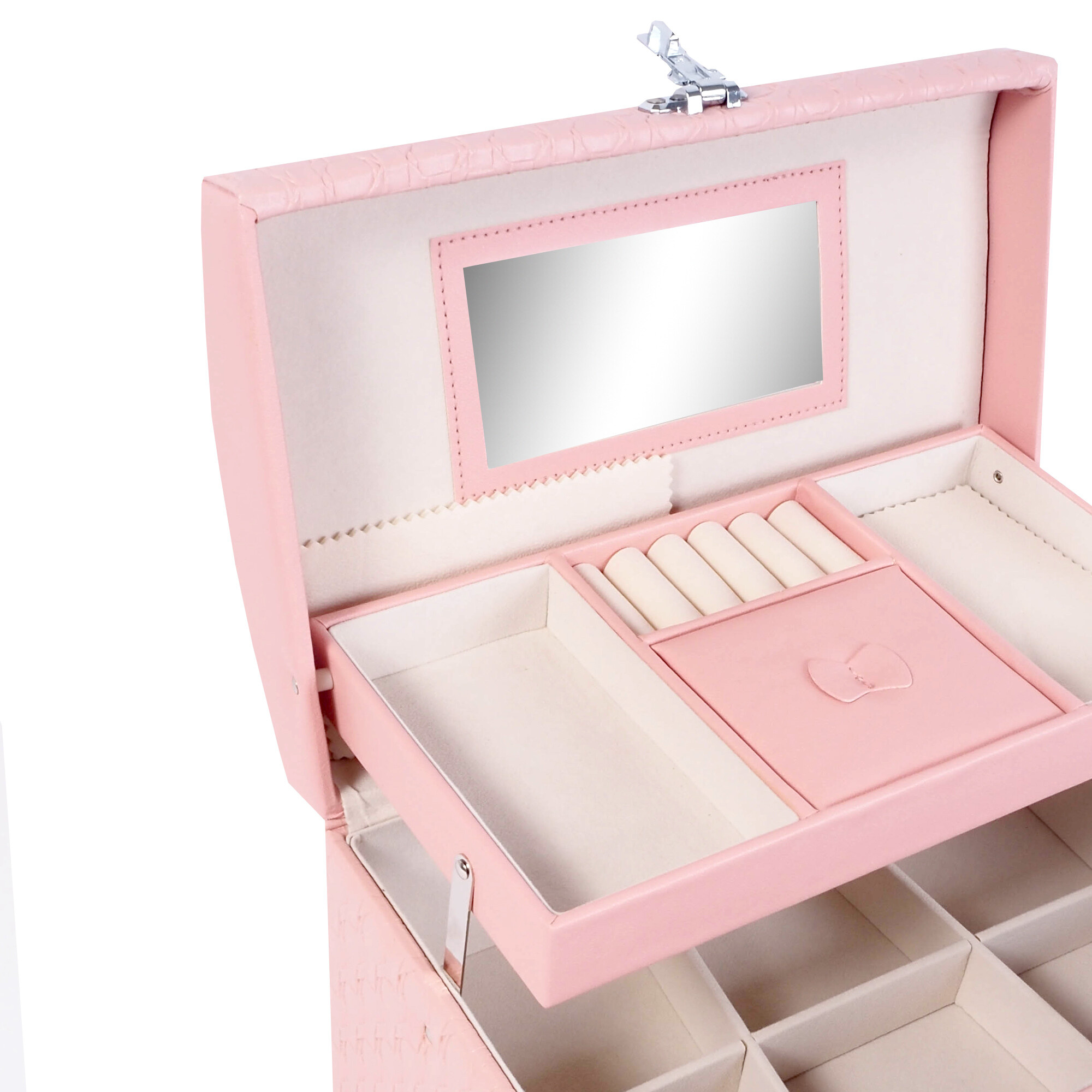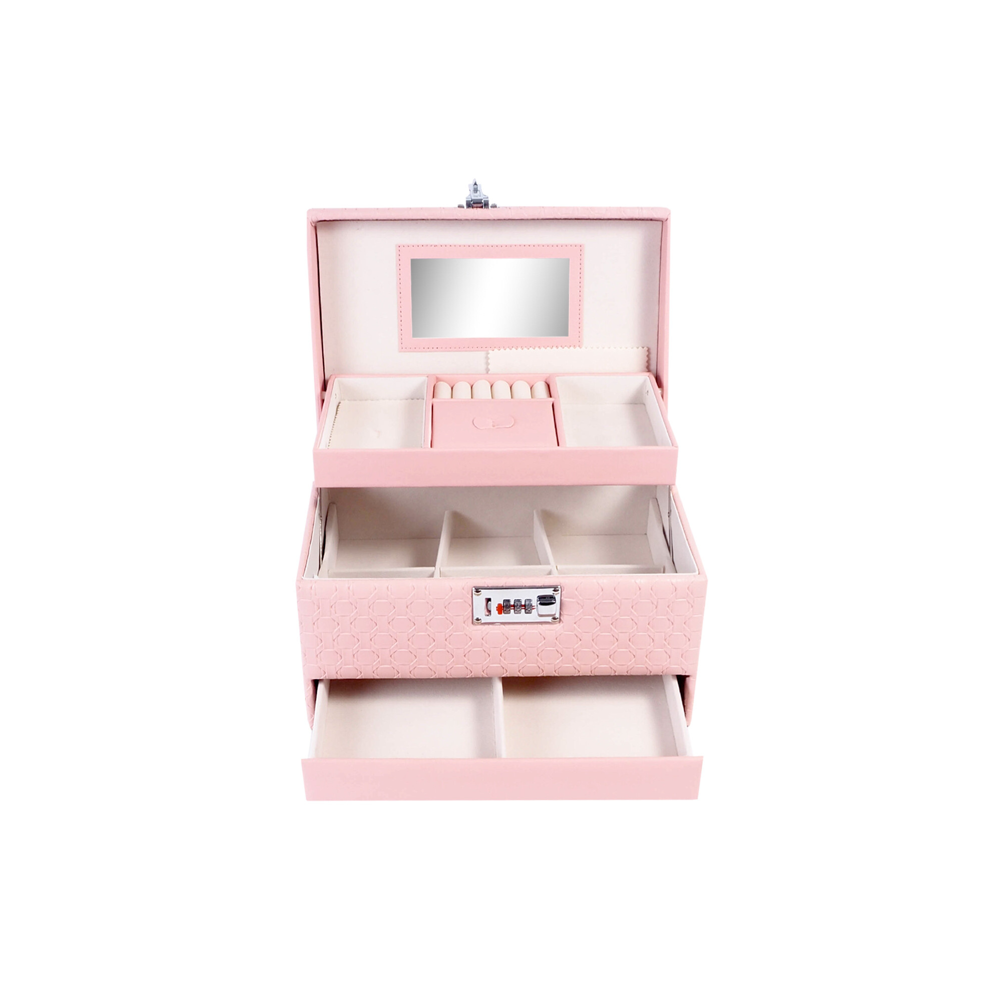Ena glavnih prednosti te škatlice za nakit je vgrajeno ogledalo, ki vam omogoča hitro in udobno preverjanje svojega videza. Zrcalo je nameščeno na notranji strani pokrova, tako da je vedno pri roki, ko ga potrebujete.