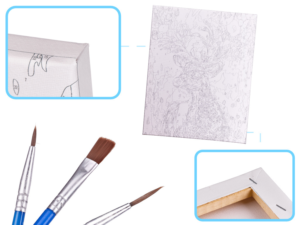 Za slikanje potrebujete le skodelico vode, ostalo pa je del kompleta - platno s sliko za barvanje, tri čopiče različnih debelin in barve.