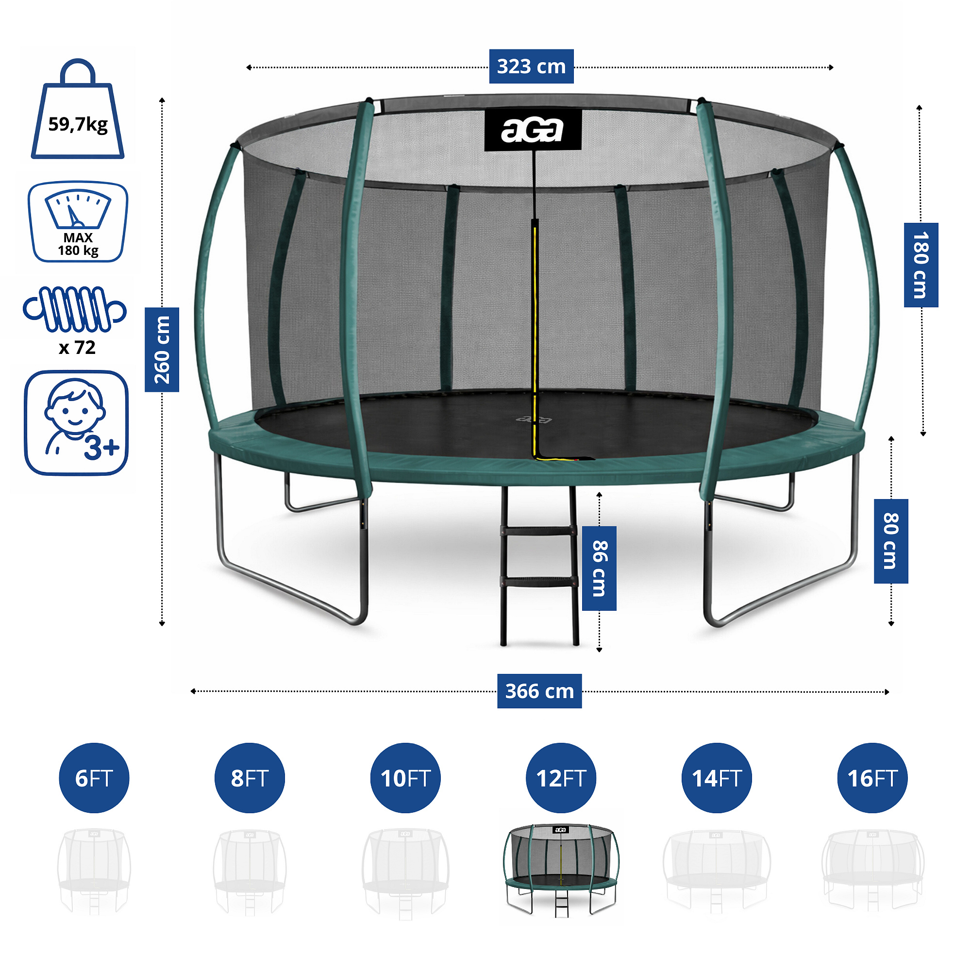 - Premer trampolina: 366 cm (12 ft)