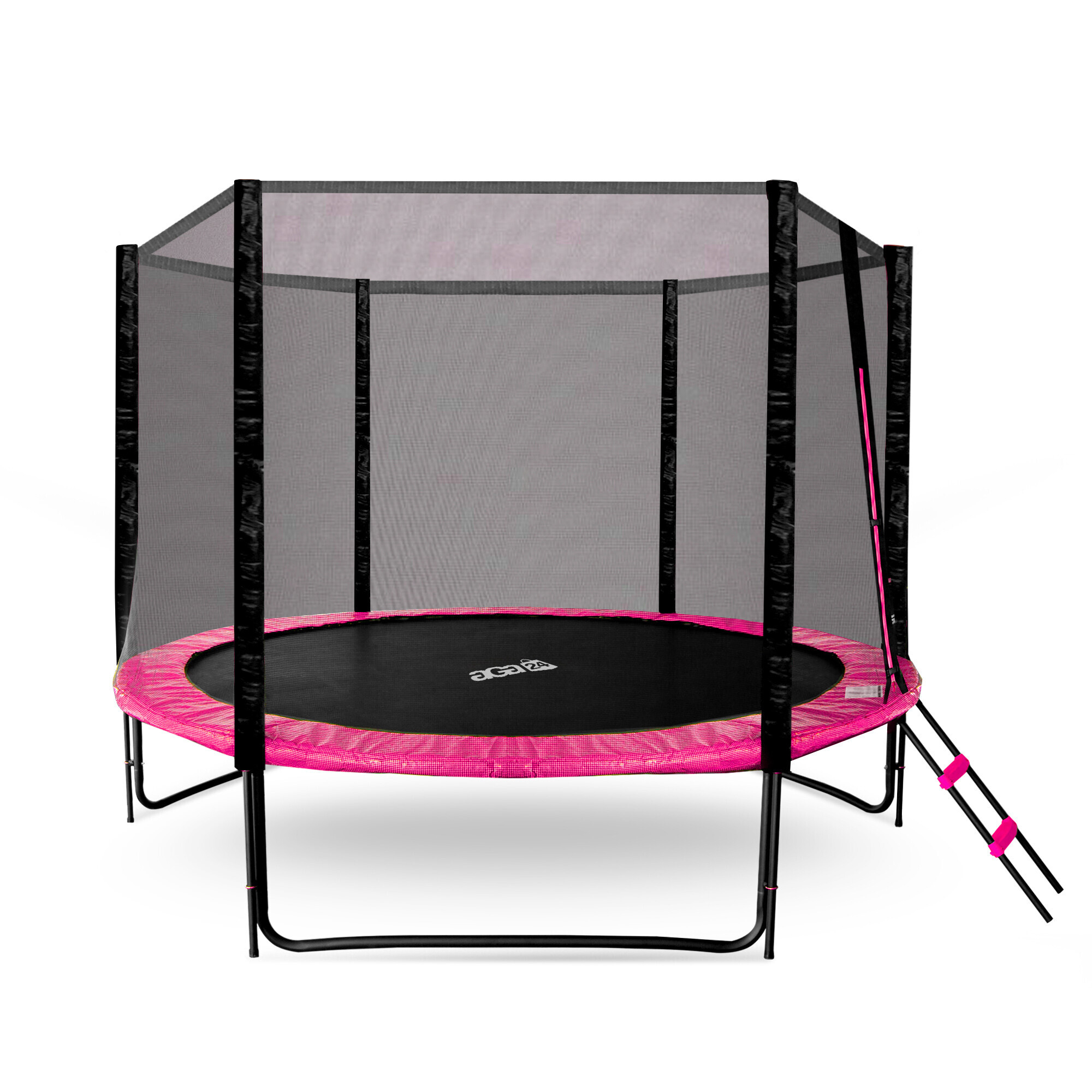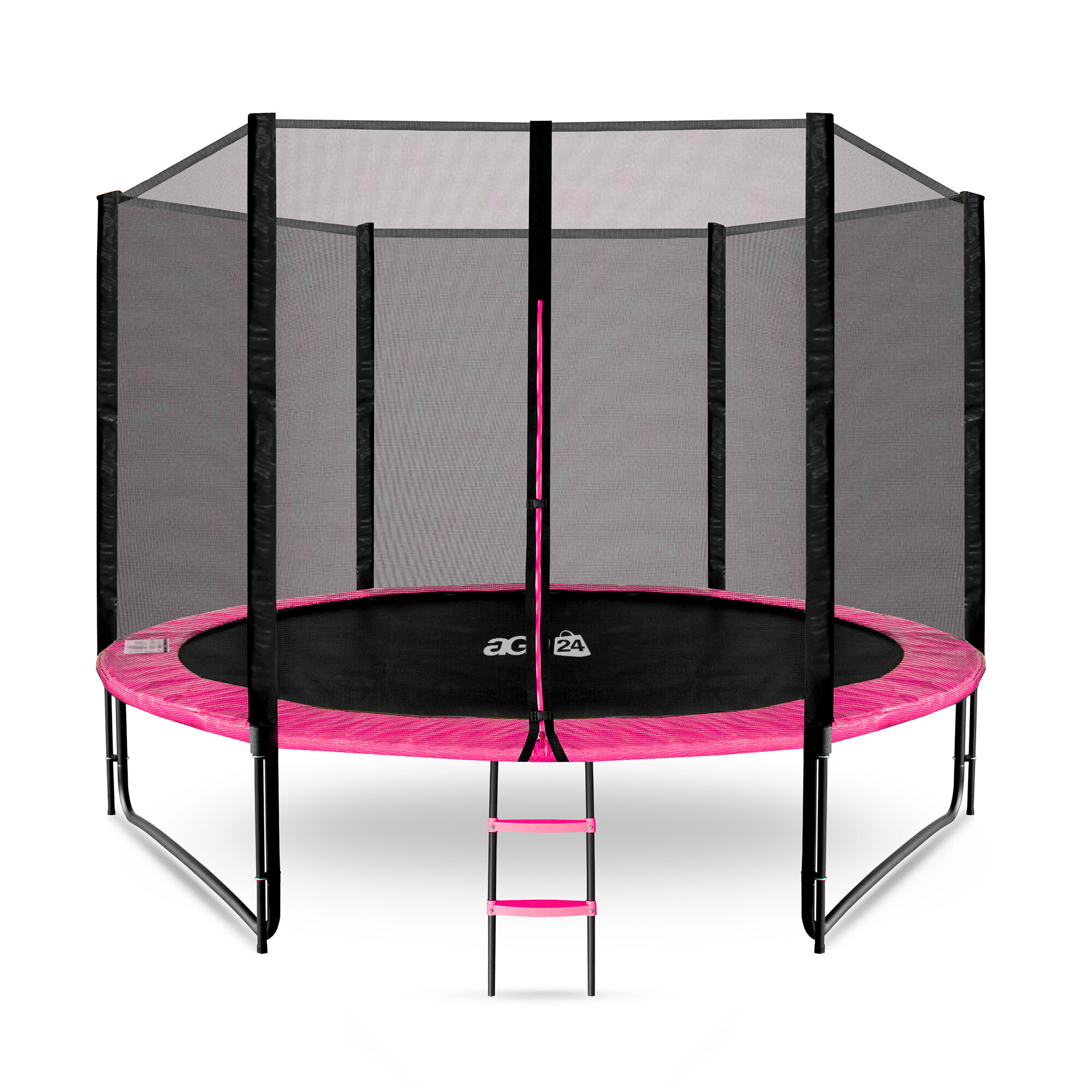 Specifikacije trampolina Aga SPORT PRO 305 cm Roza z zaščitno mrežo in lestev.