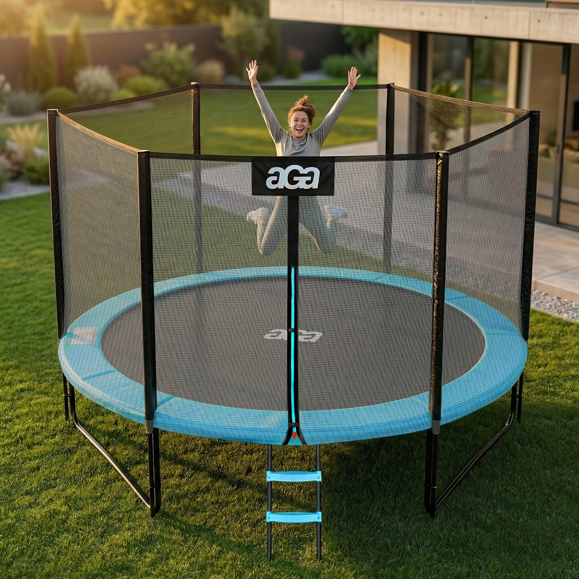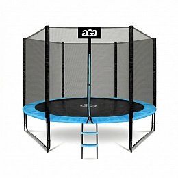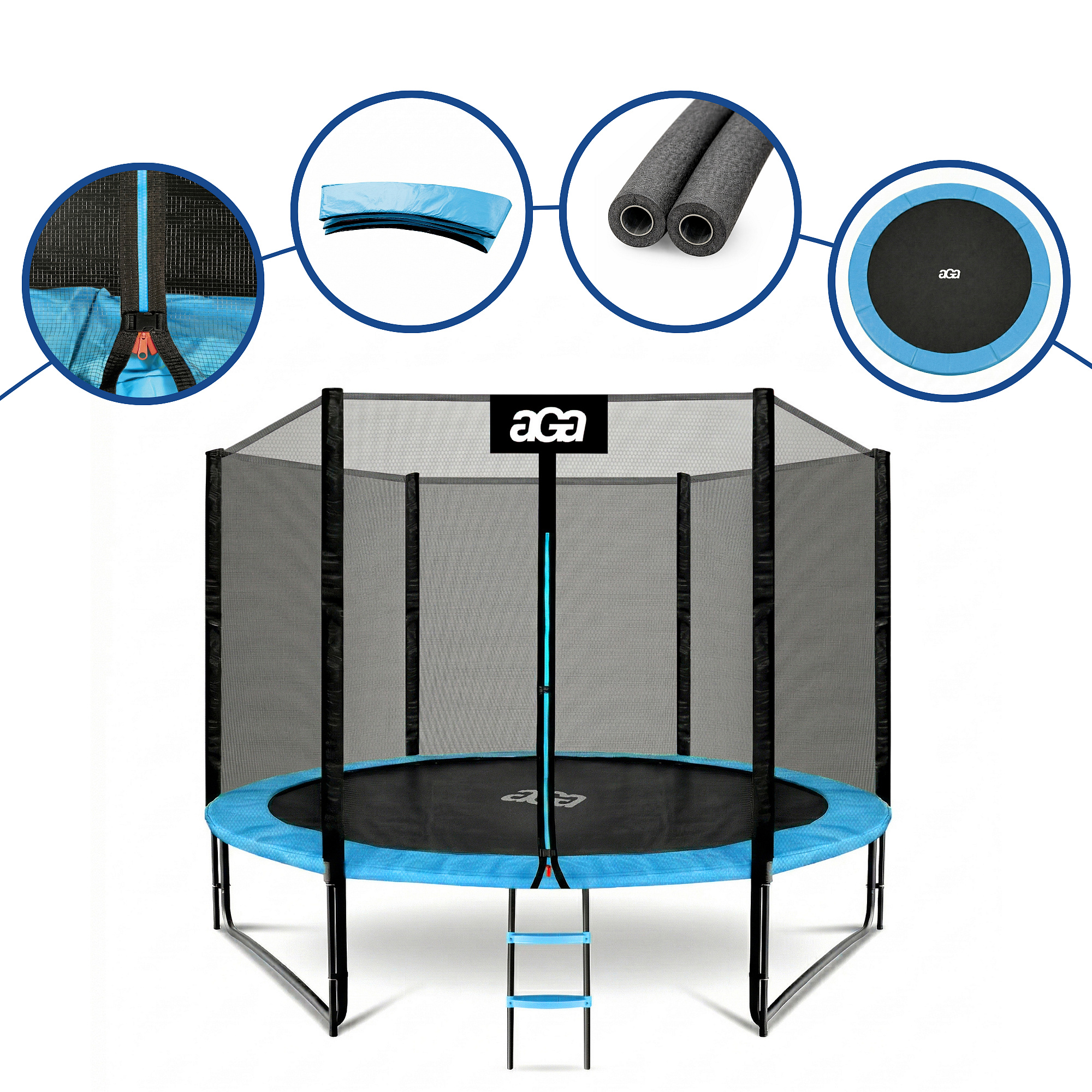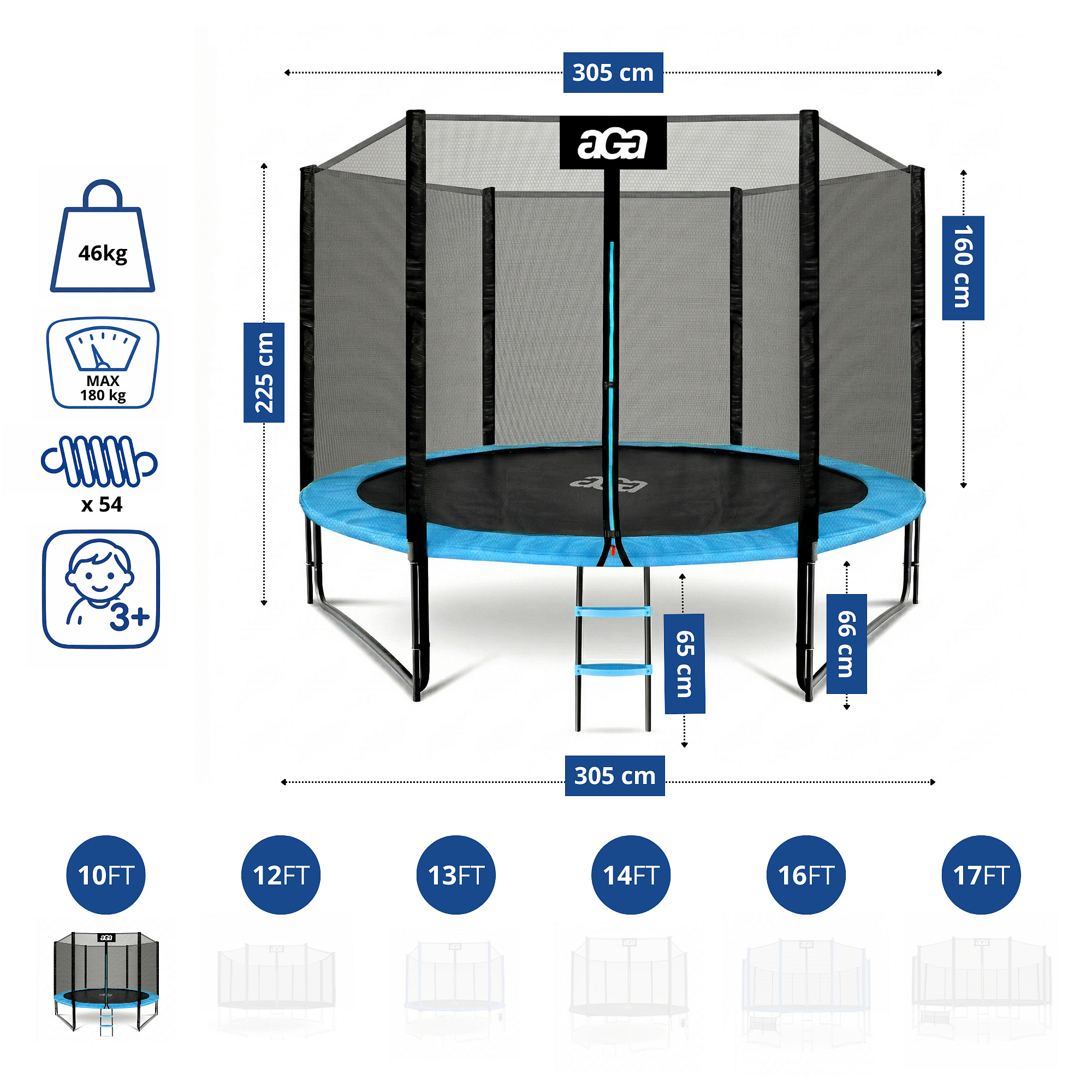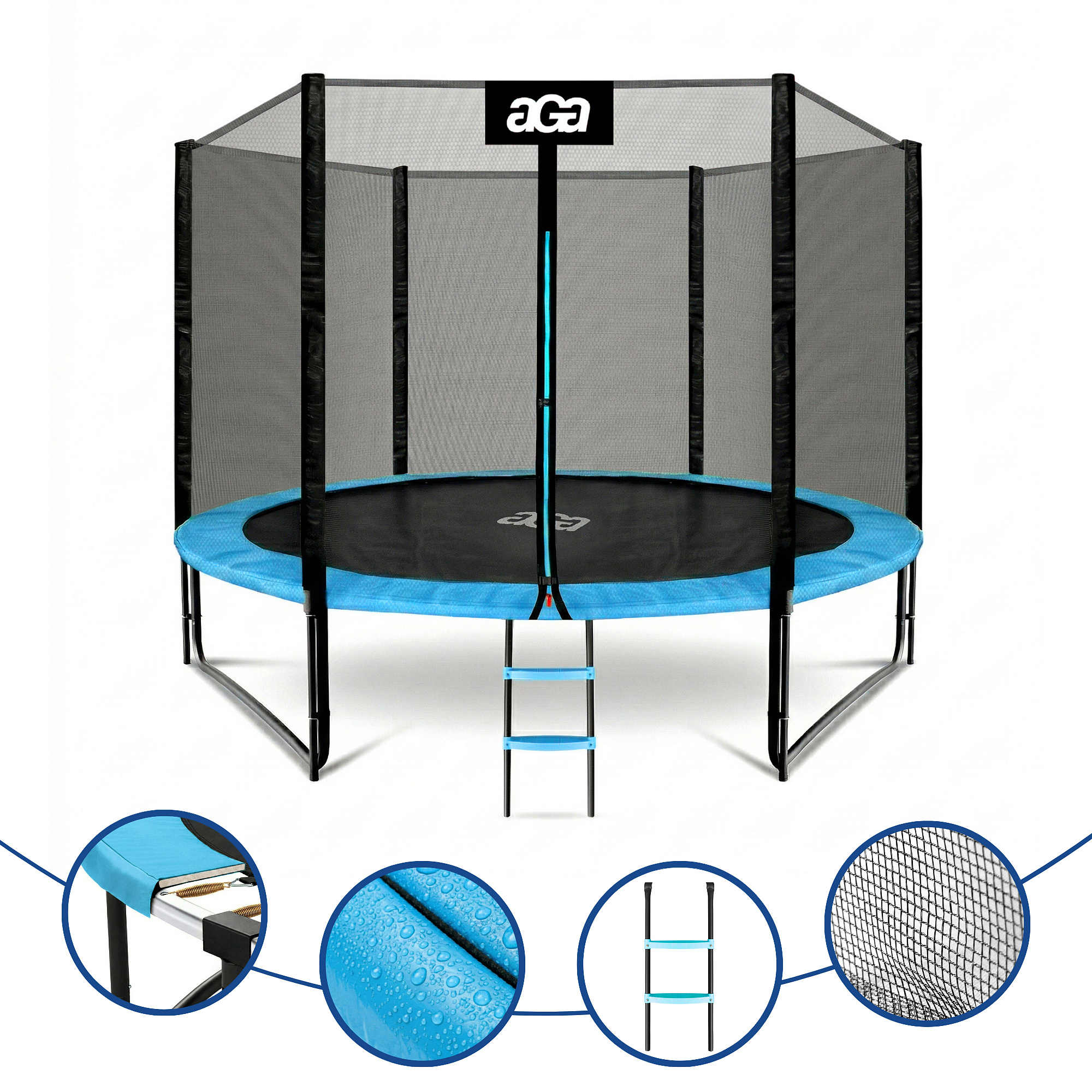 Specifikacije trampolina Aga SPORT PRO 305 cm Svetlo modra z zaščitno mrežo in lestev.