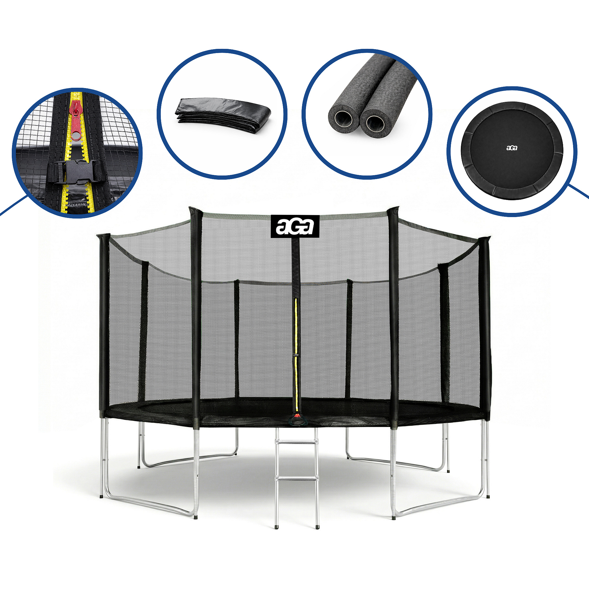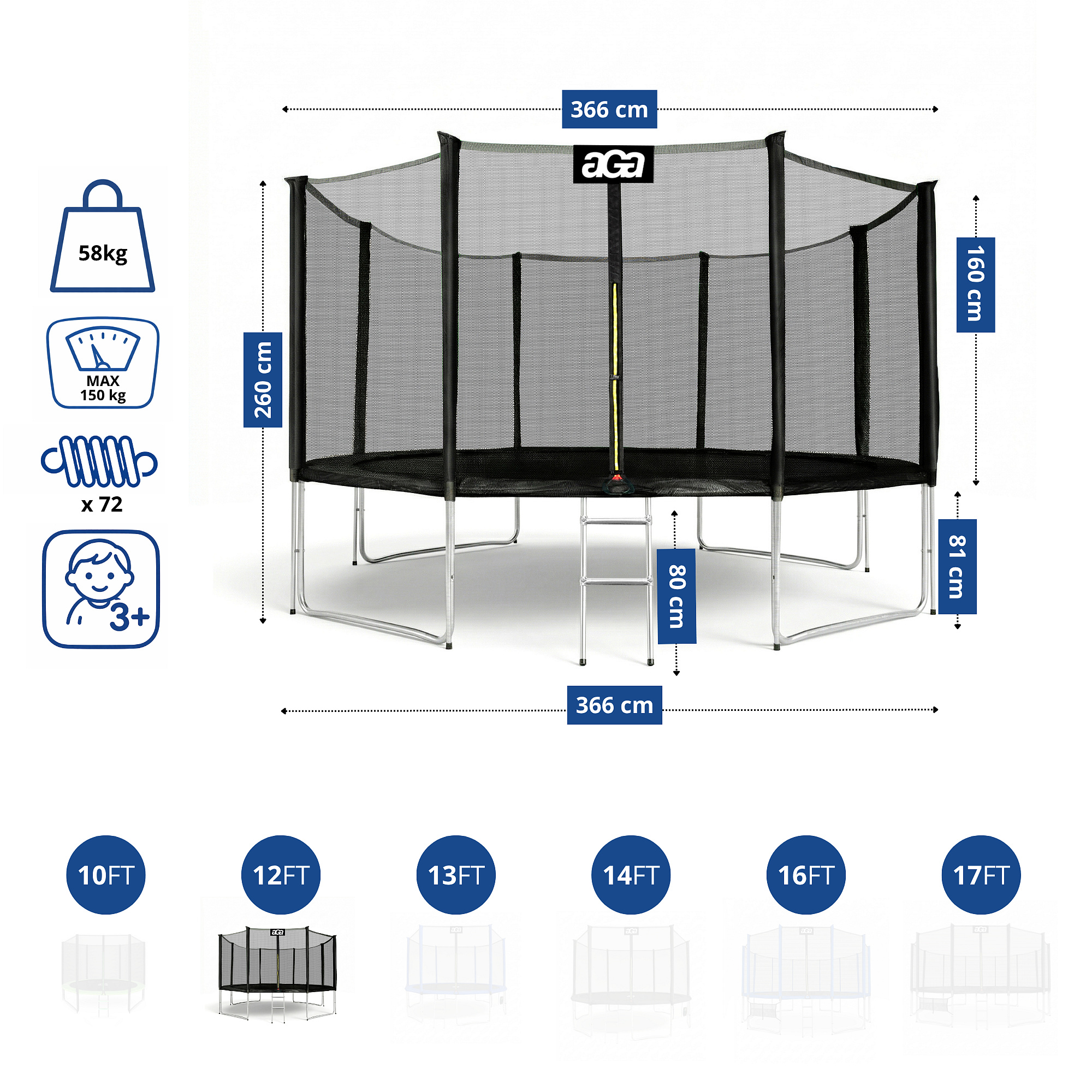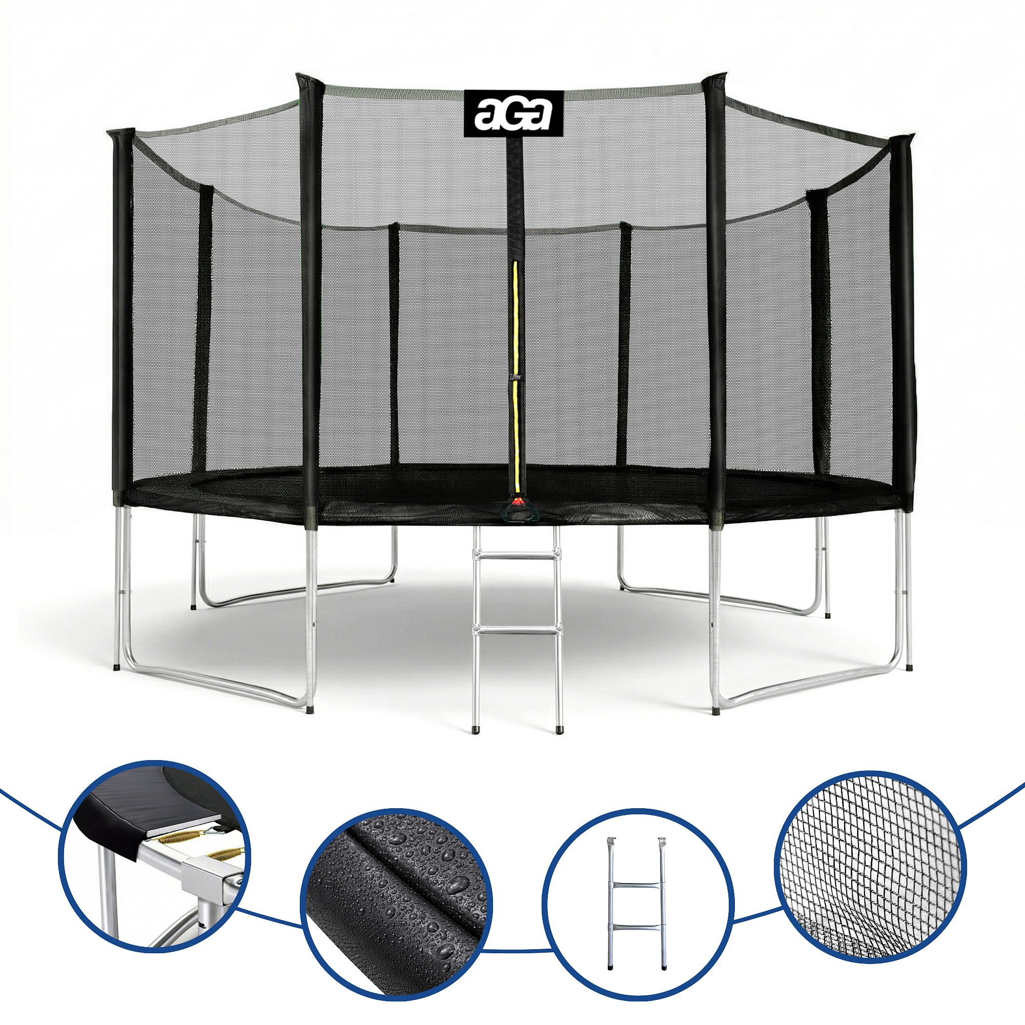 Specifikacije trampolina Aga SPORT PRO 366 cm z zaščitno mrežo.