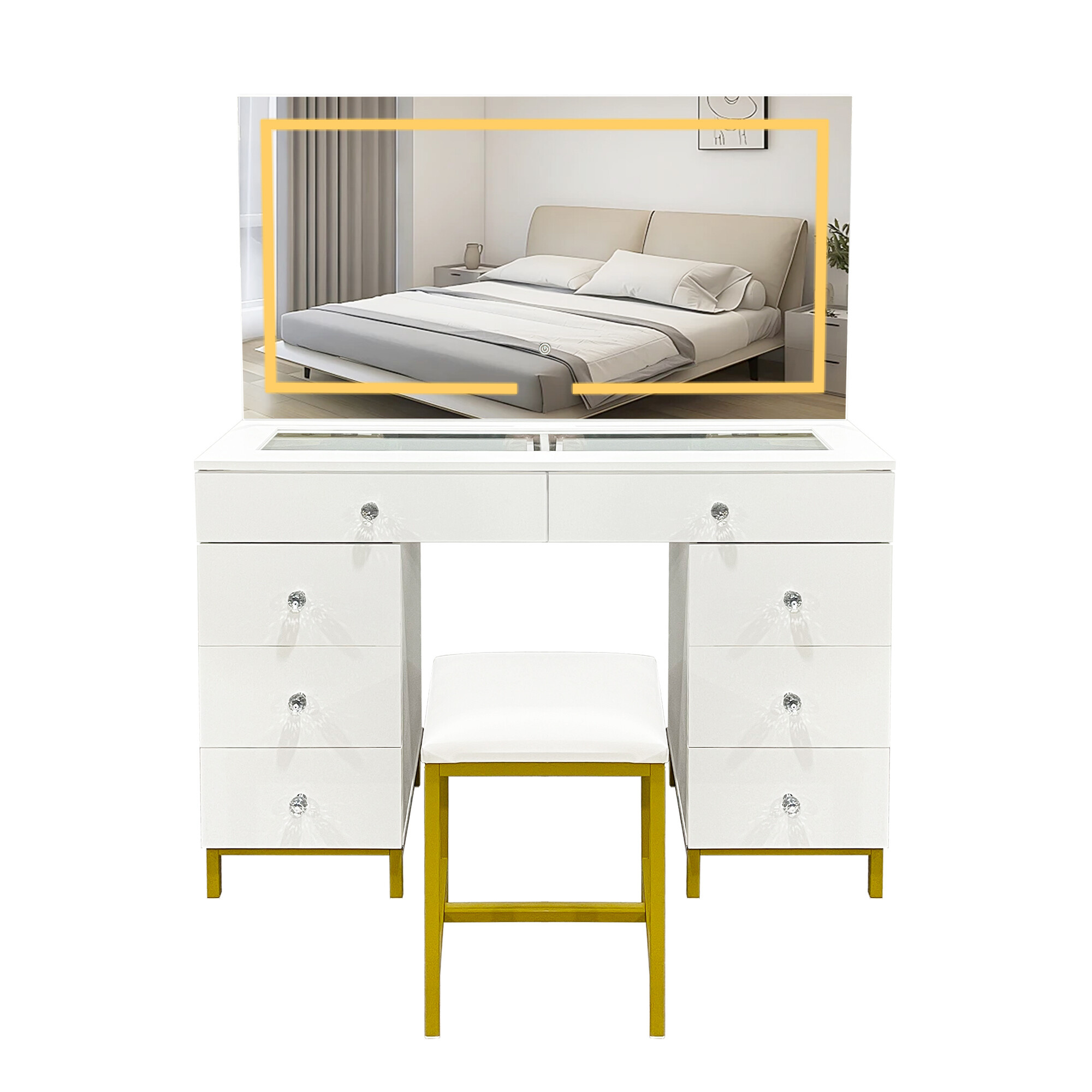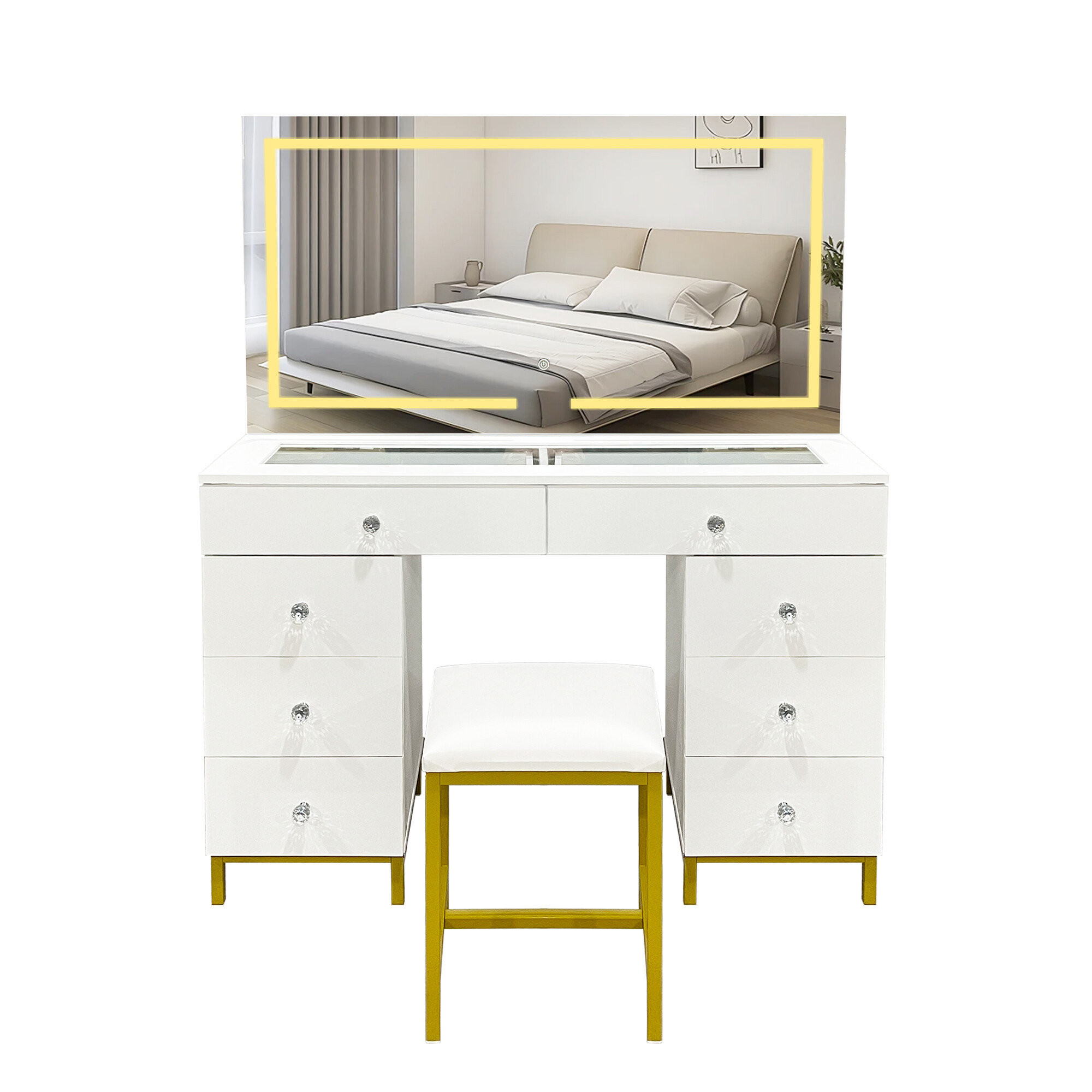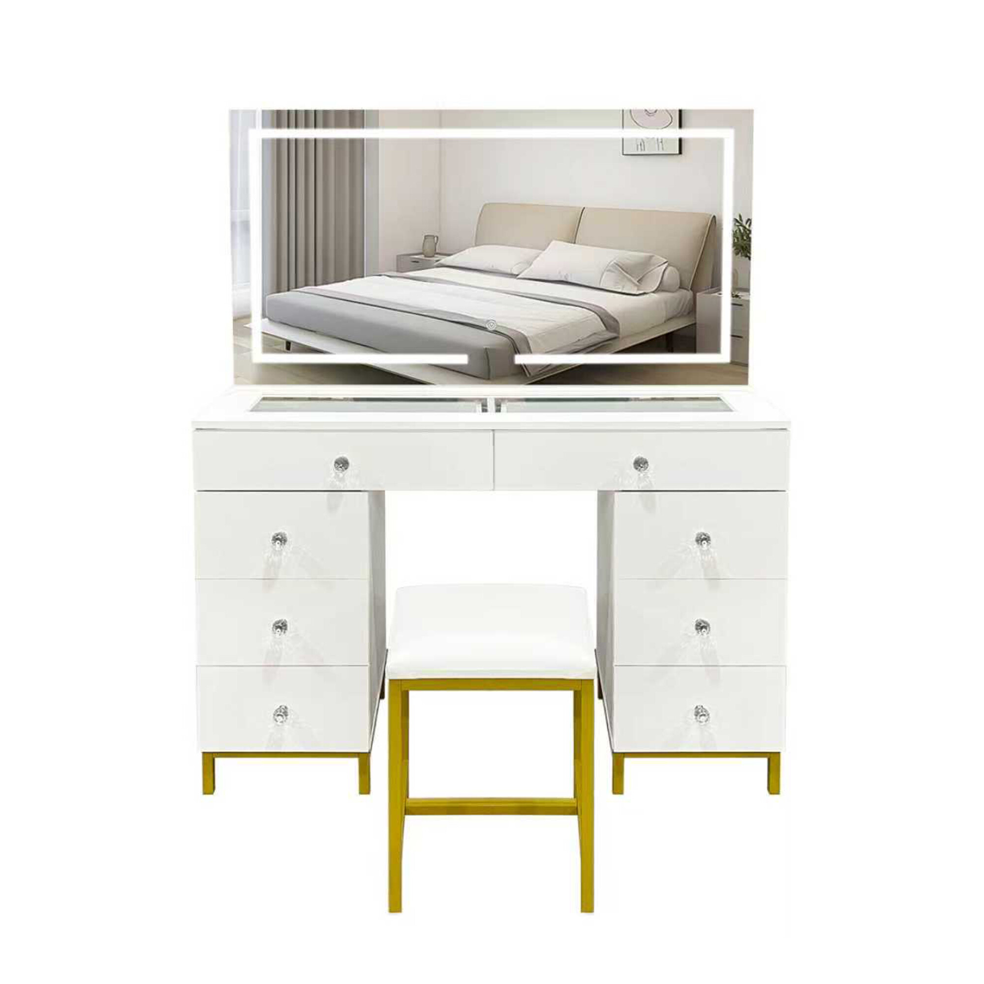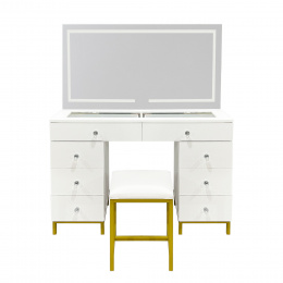 Privoščite si vsakodnevni odmerek razkošja s to moderno toaletno mizico z ogledalom in LED osvetlitvijo. Stilska bela mizica v mat izvedbi bo postala ne le praktičen, temveč tudi estetski dodatek vsake spalnice ali garderobe.