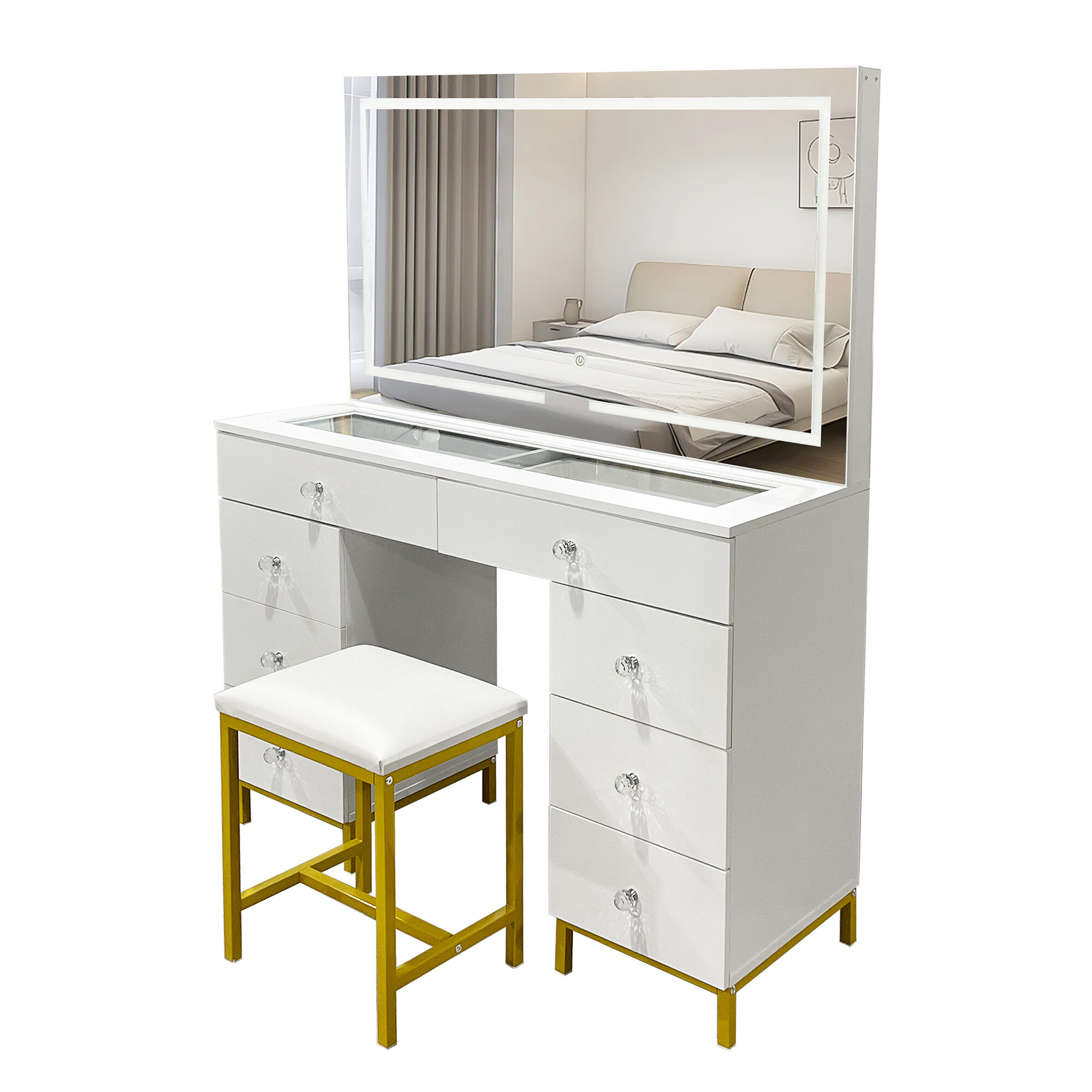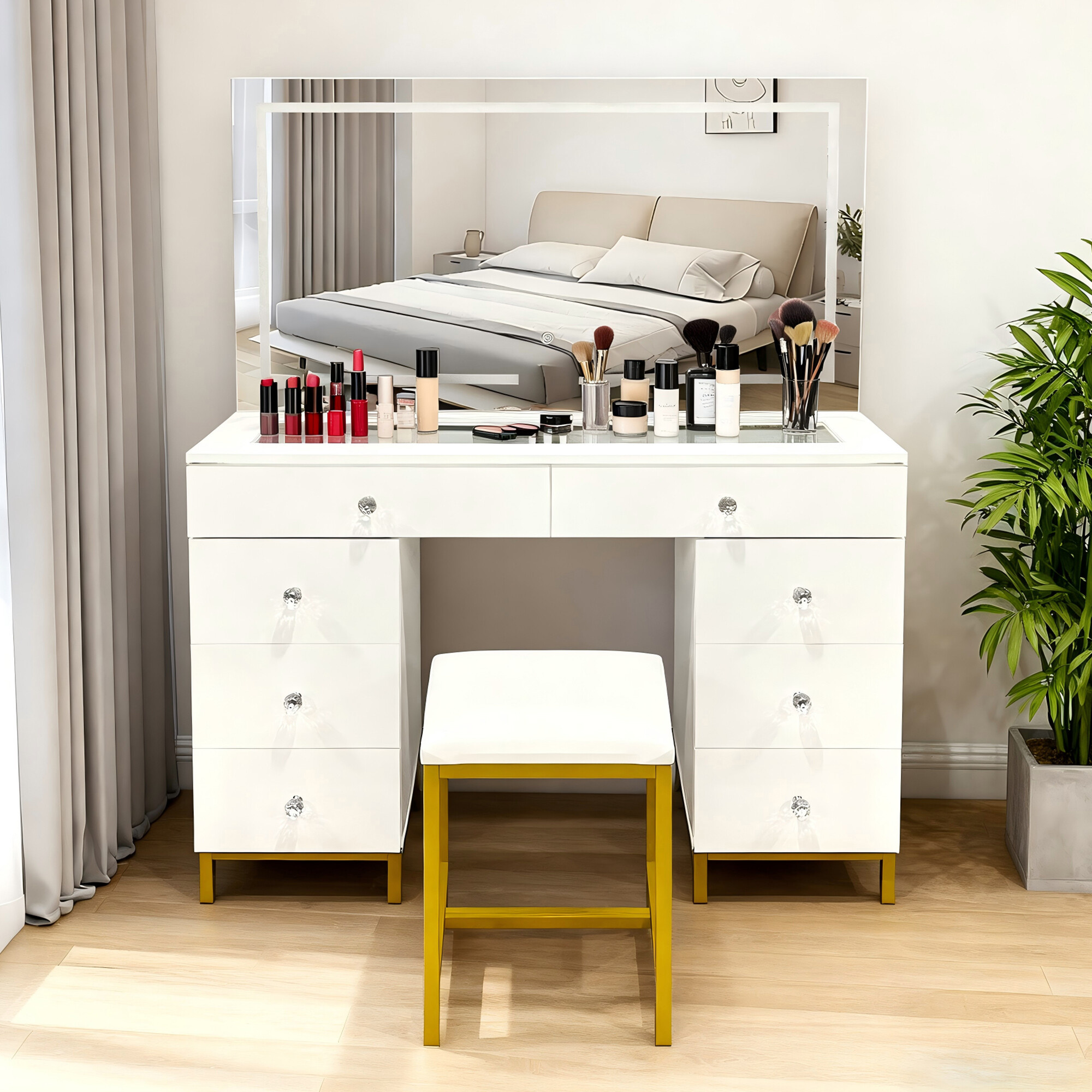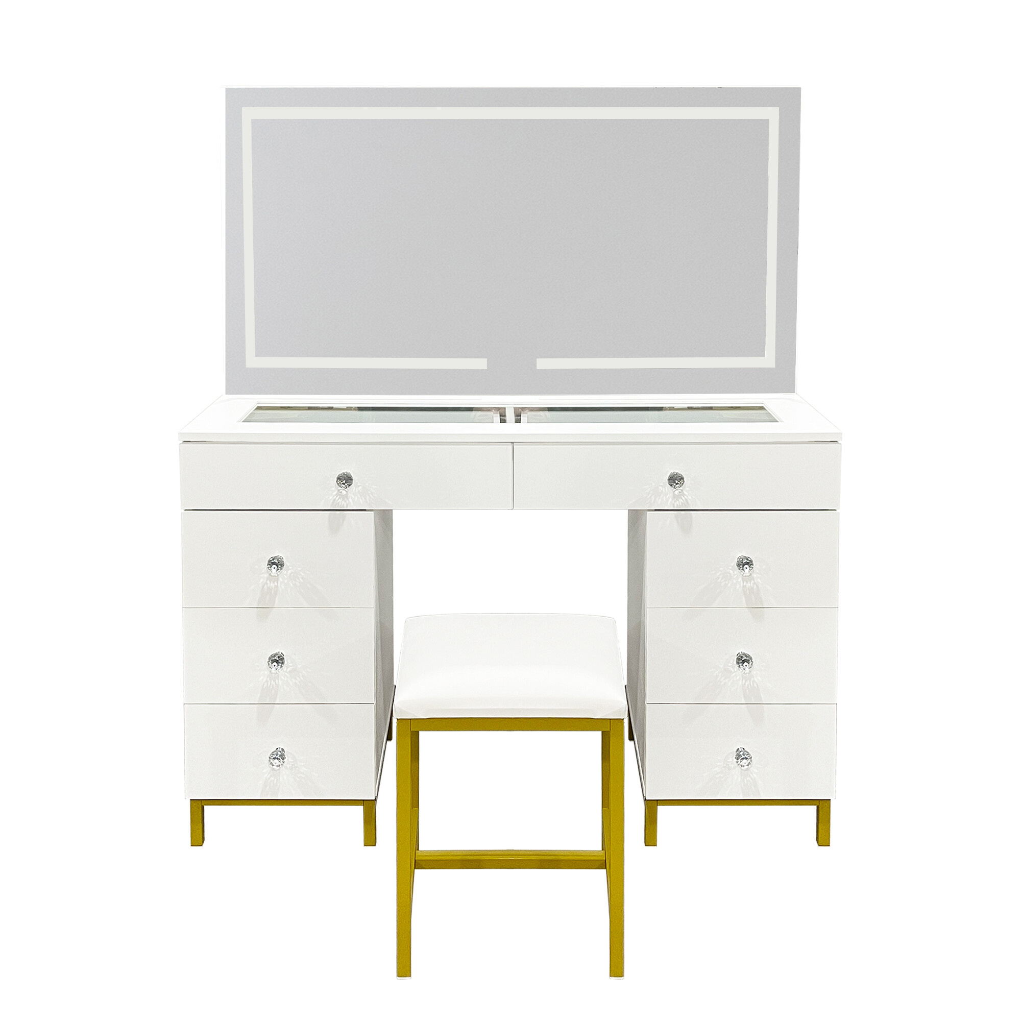 Privoščite si vsakodnevni odmerek razkošja s to moderno toaletno mizico z ogledalom in LED osvetlitvijo. Stilska bela mizica v mat izvedbi bo postala ne le praktičen, temveč tudi estetski dodatek vsake spalnice ali garderobe.