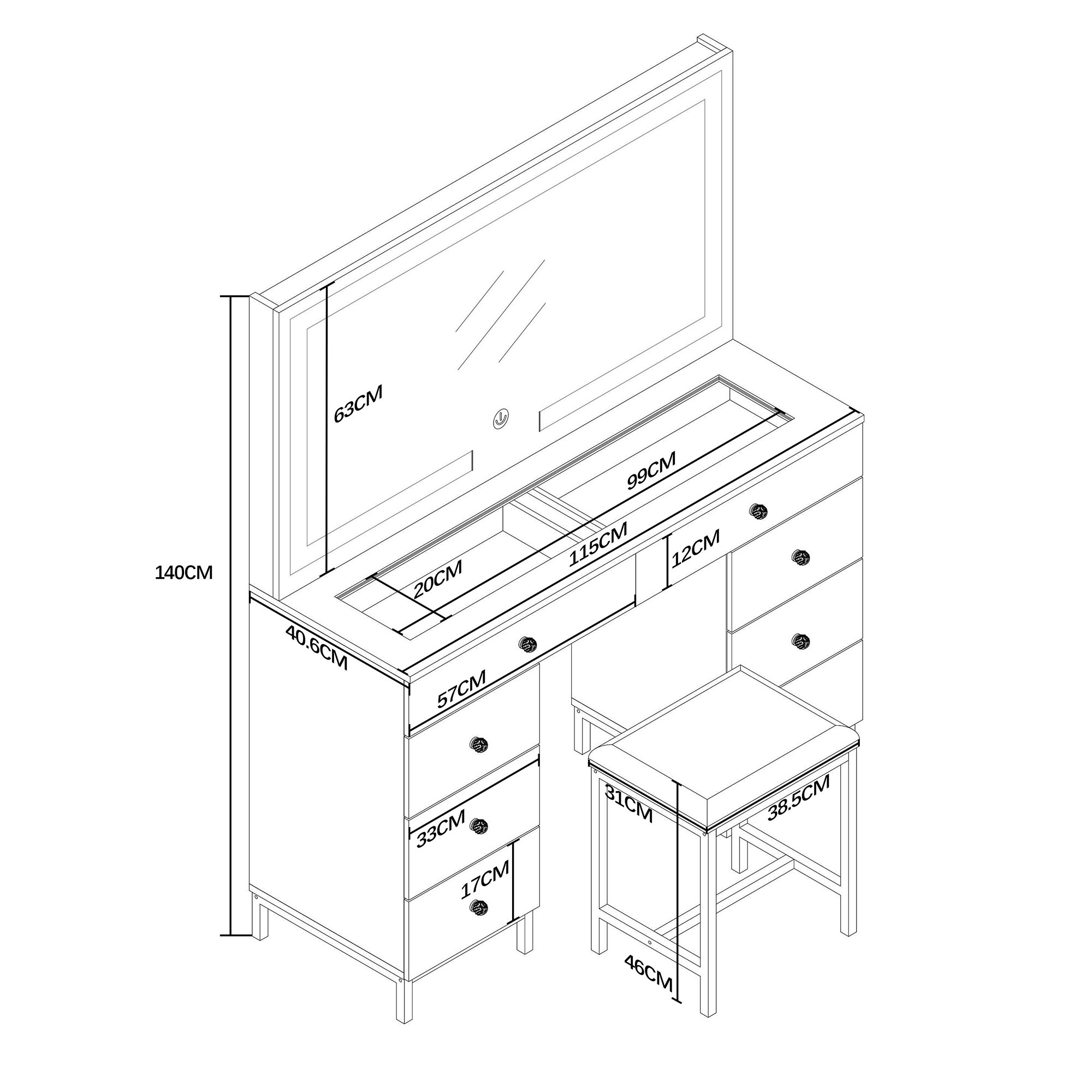Dominantna značilnost mize je veliko ogledalo z LED žarnicami, pri katerih lahko preprosto spreminjate temperaturo svetlobe od hladne, nevtralne do tople. Zahvaljujoč temu si boste vedno zagotovili idealno osvetlitev za ličenje, urejanje las ali večerno nego kože.