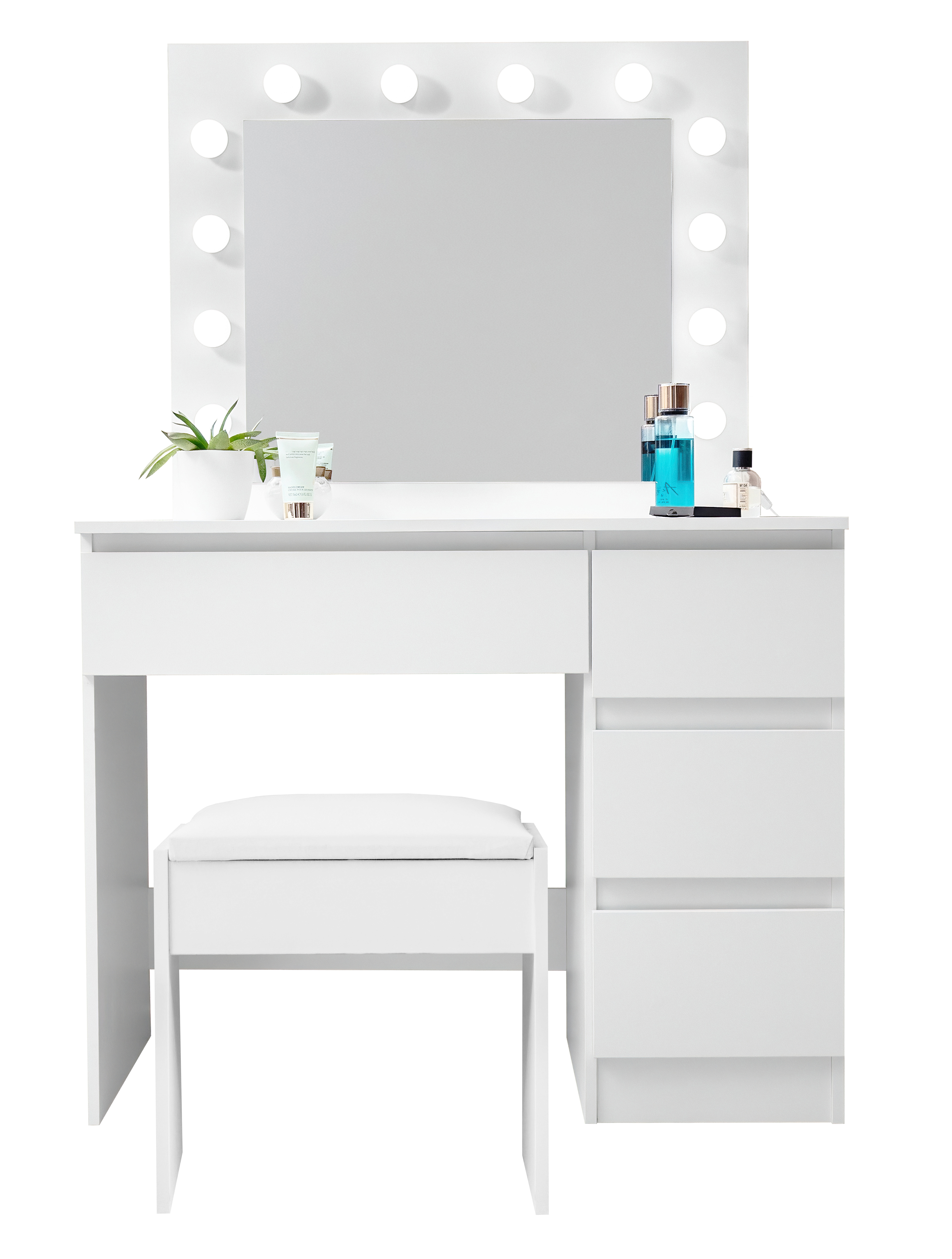 Taburet je izdelan iz visoko kakovostne mehke pene, na kateri je mogoče sedeti cele ure.Toaletna mizica je izdelana iz trdnih laminiranih ivernih plošč z melaminsko površino, ki izstopa po svoji odpornosti proti praskam.