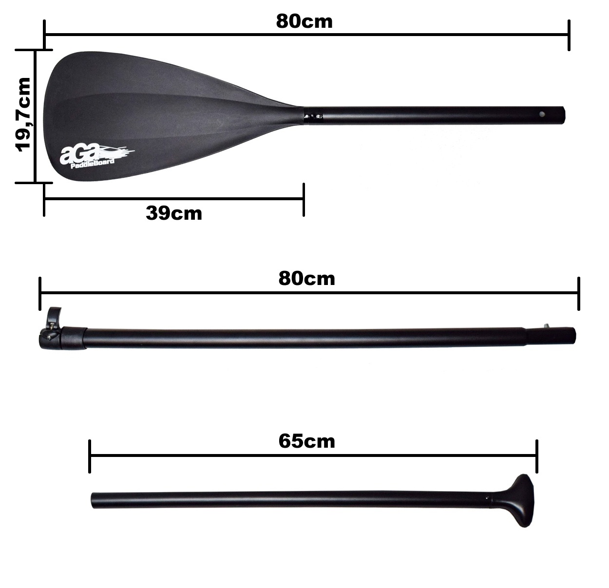 V paketu boste našli vse, kar potrebujete za odhod na vodo: troslojno aluminijasto veslo z nastavljivo dolžino, črpalko z manometrom, varnostno vrvico za nogo - leash, plavut, komplet za popravilo.