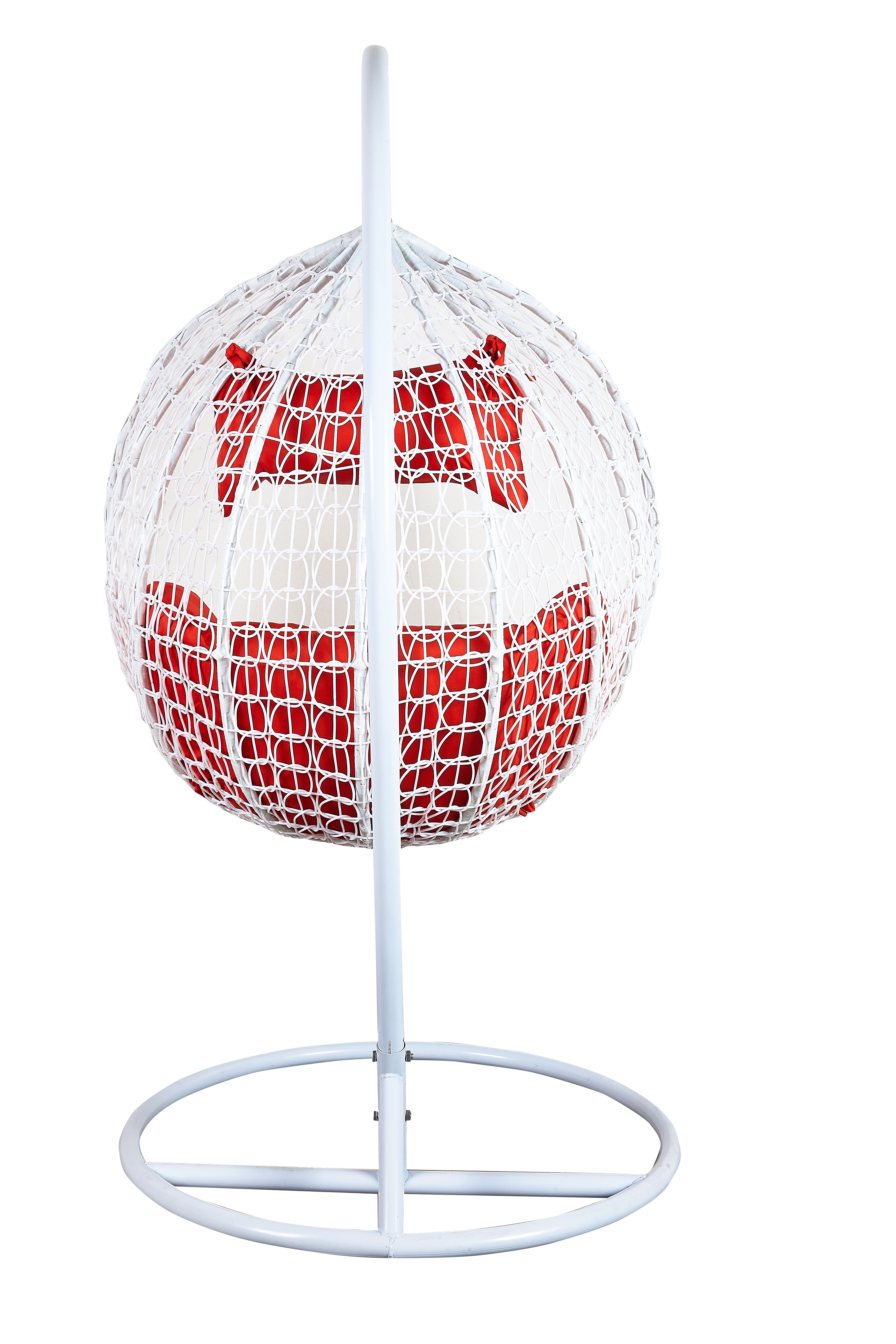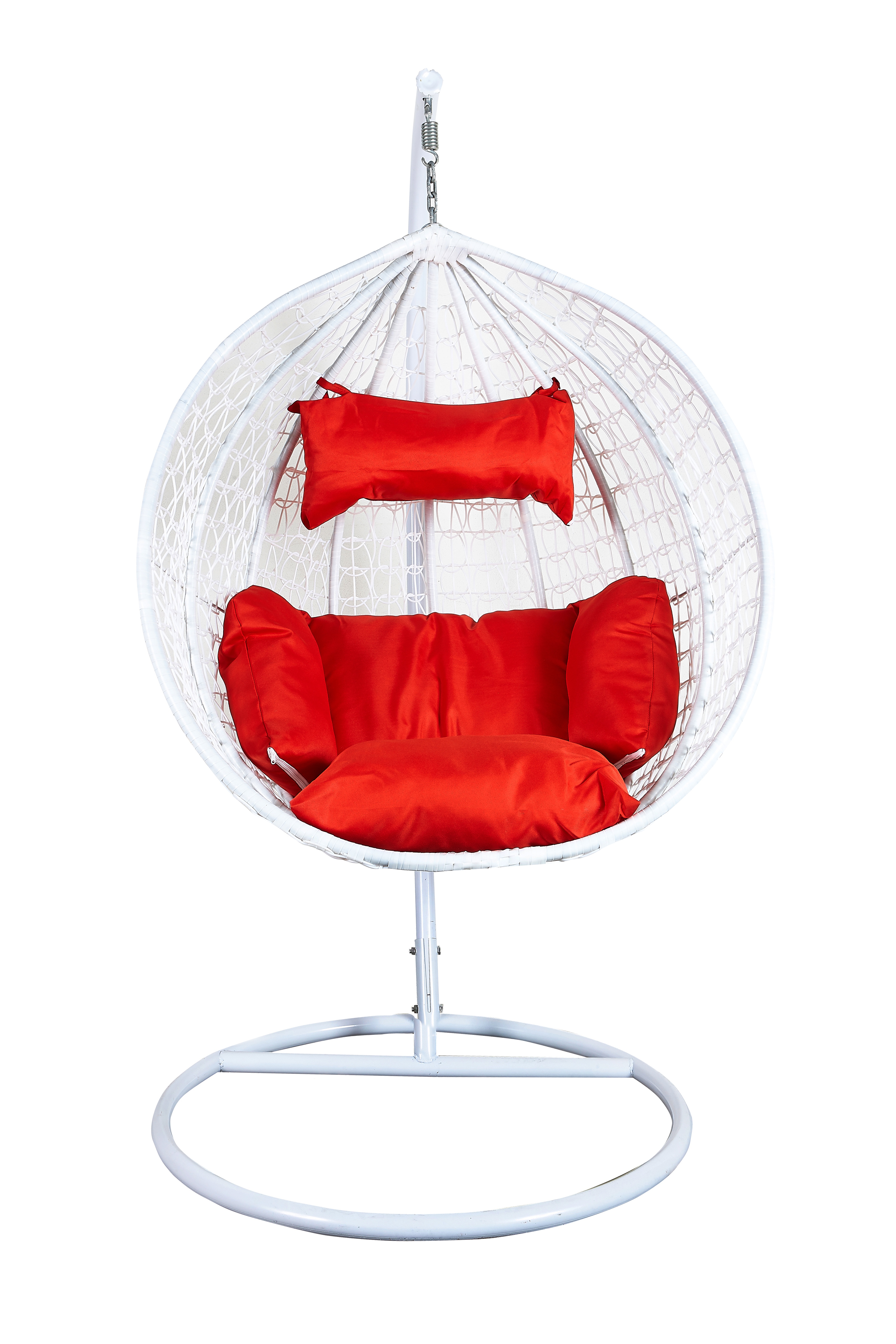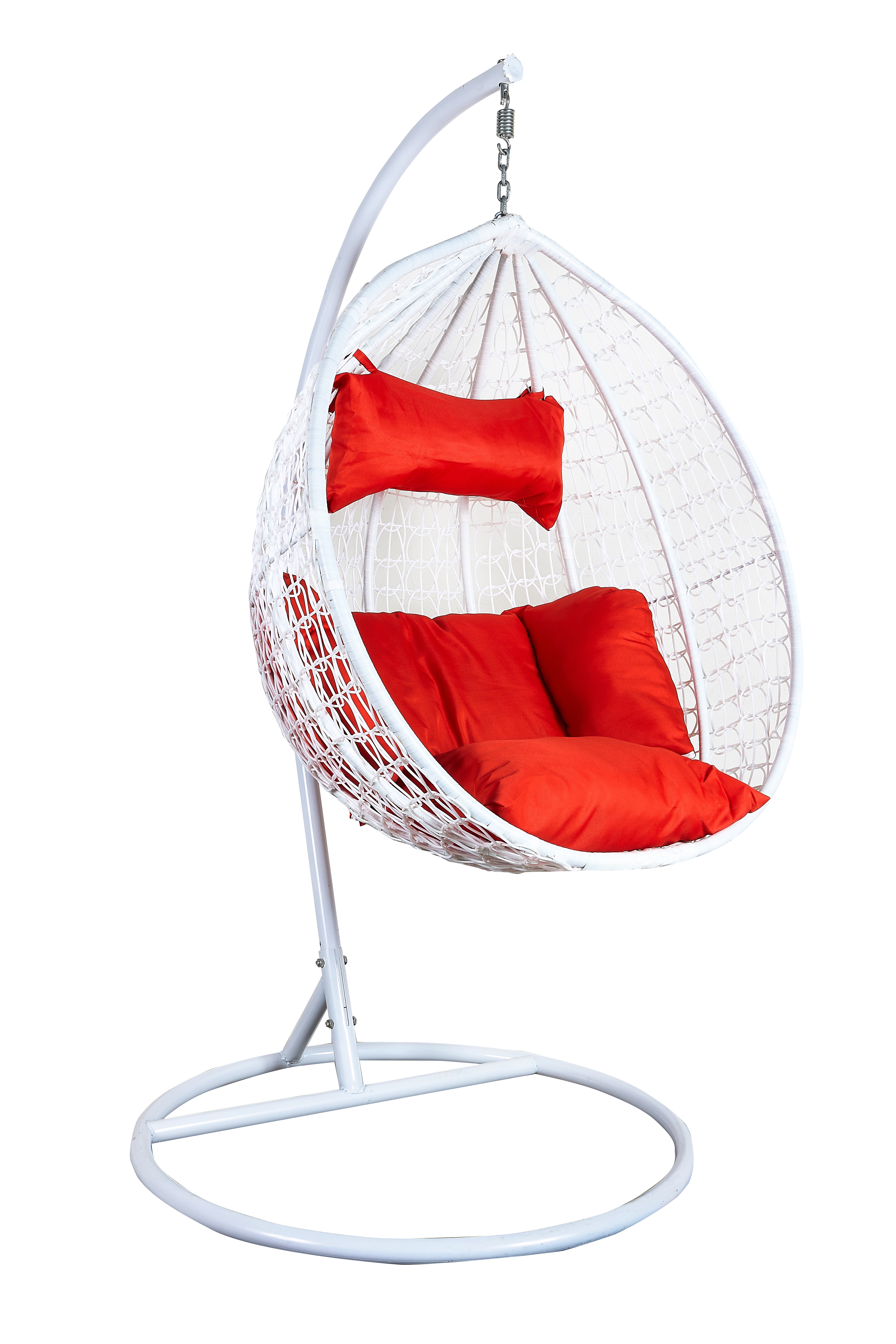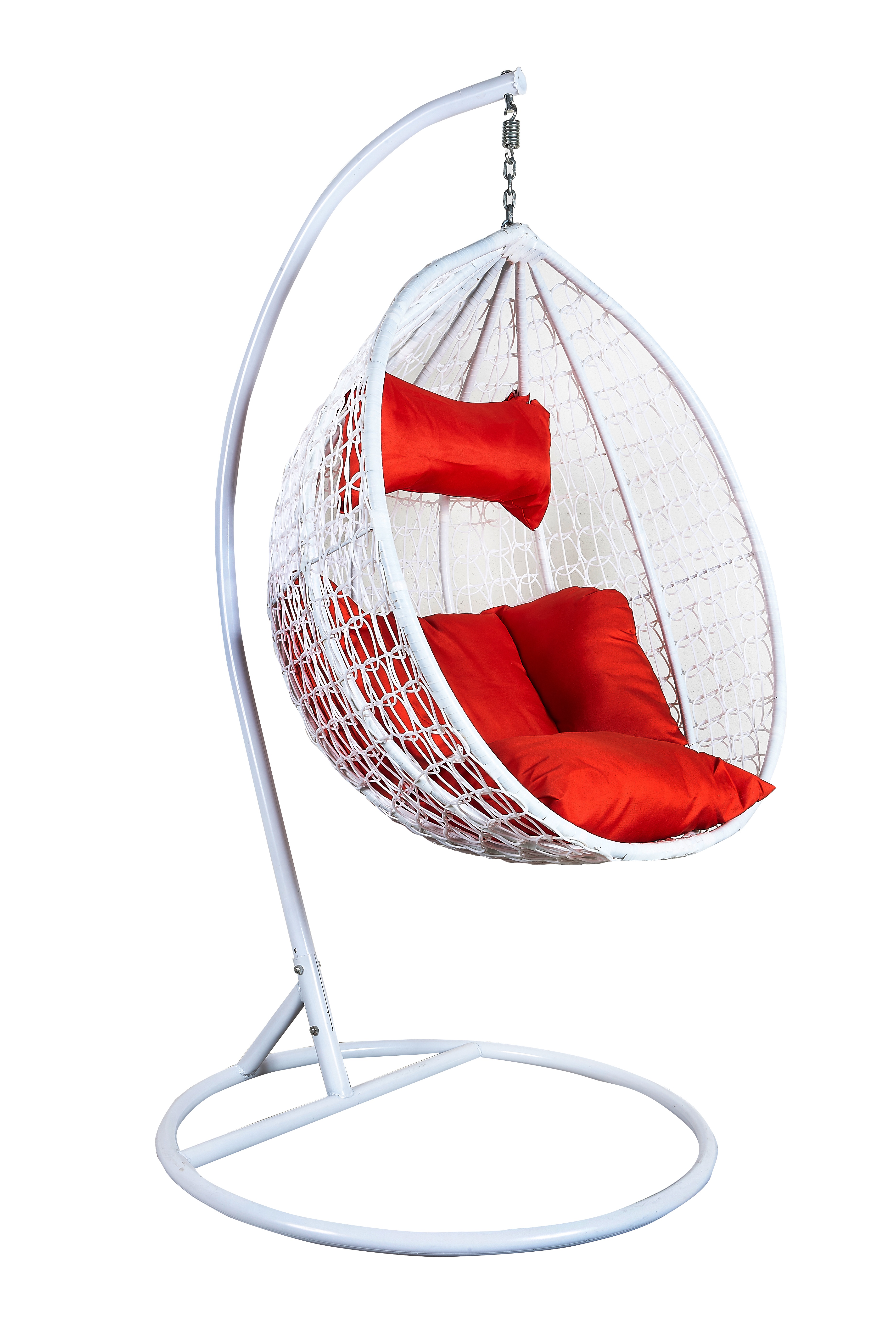 Viseči stol s stabilno kovinsko konstrukcijo in sedežnim prostorom, okrasno prepletenim iz umetnega ratana.