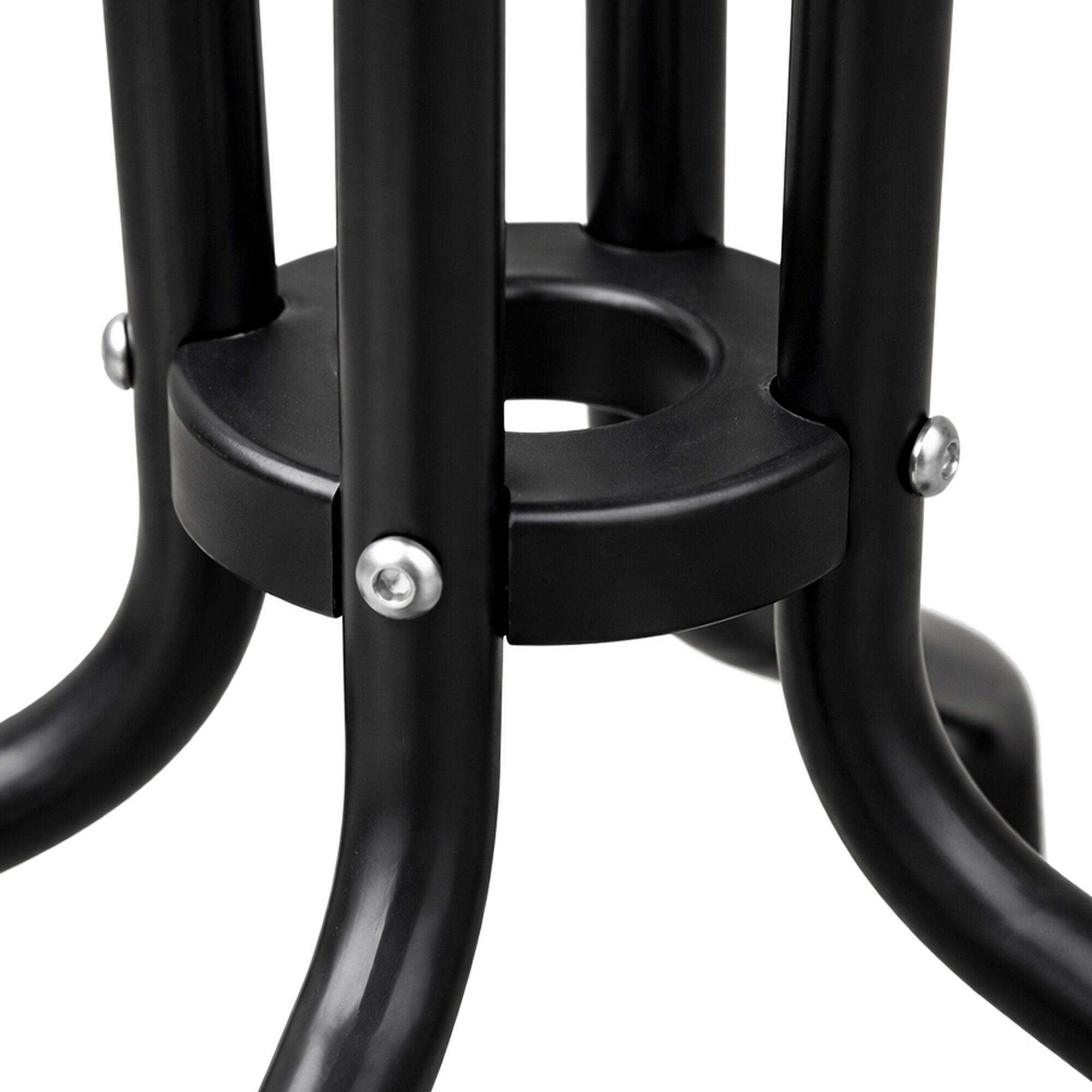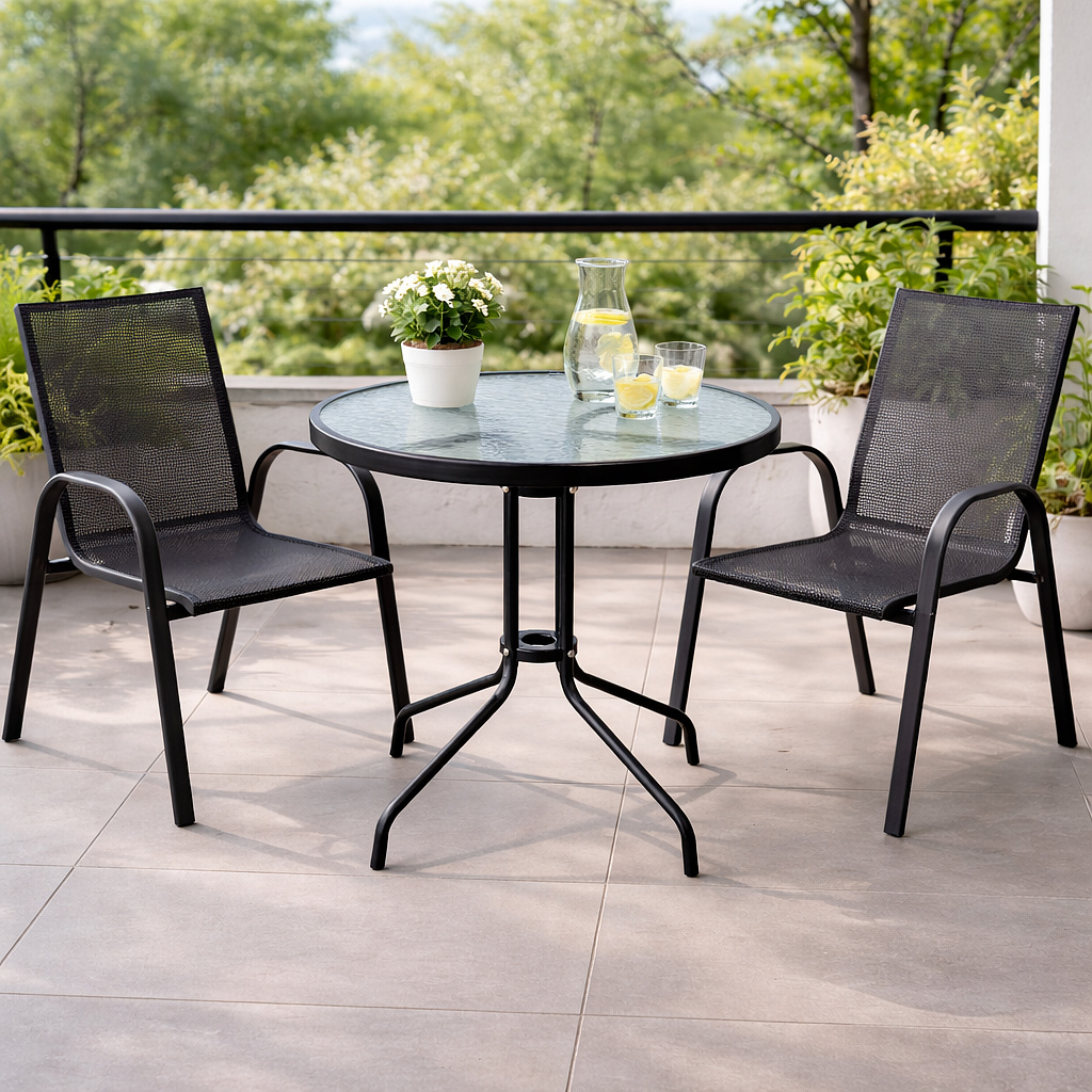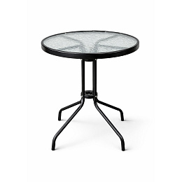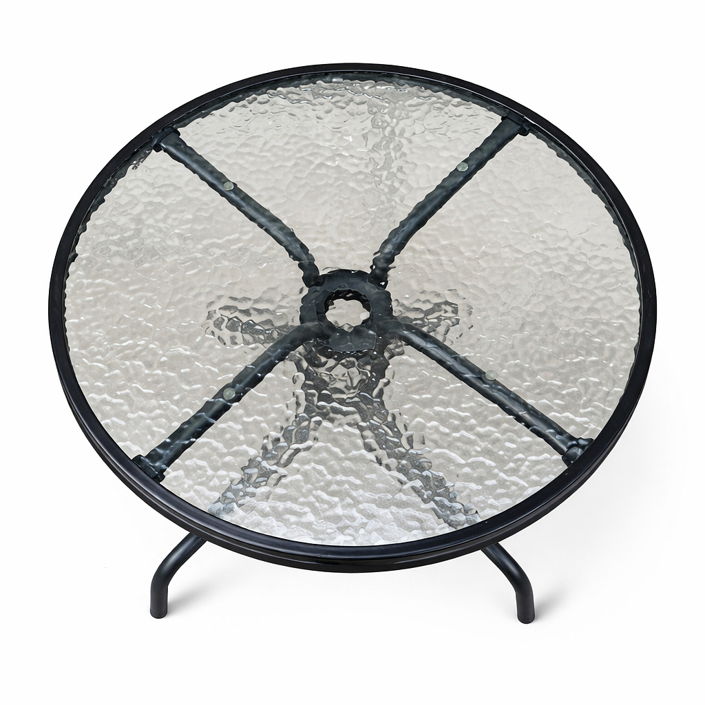 Okrogla vrtna miza s trdnim kovinskim okvirjem in teksturiranim steklenim vrhom, primerna za vrtove, terase, kavarne, paviljone, balkone.