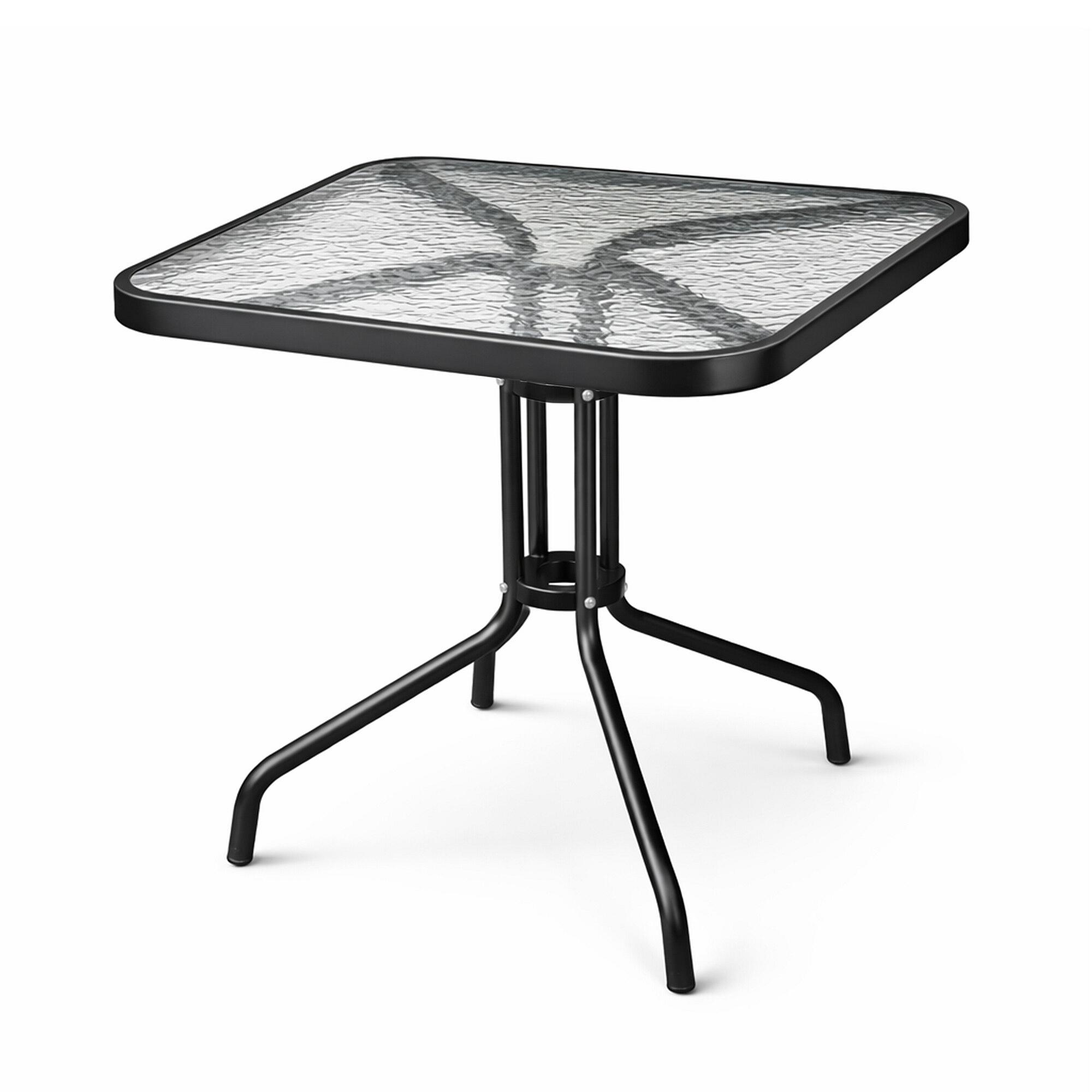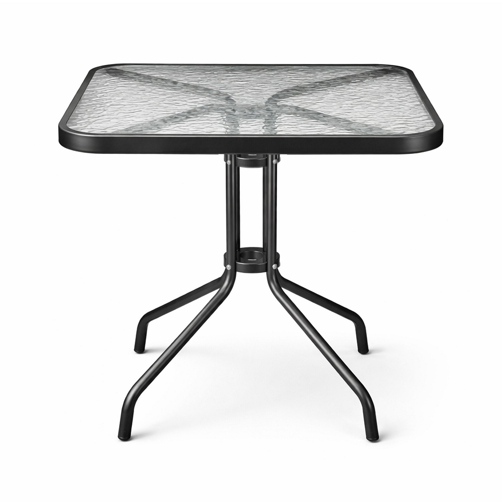 Vrtna miza s trdnim kovinskim okvirjem in stekleno ploščo, primerna za vrtove, terase, kavarne, paviljone, balkone.