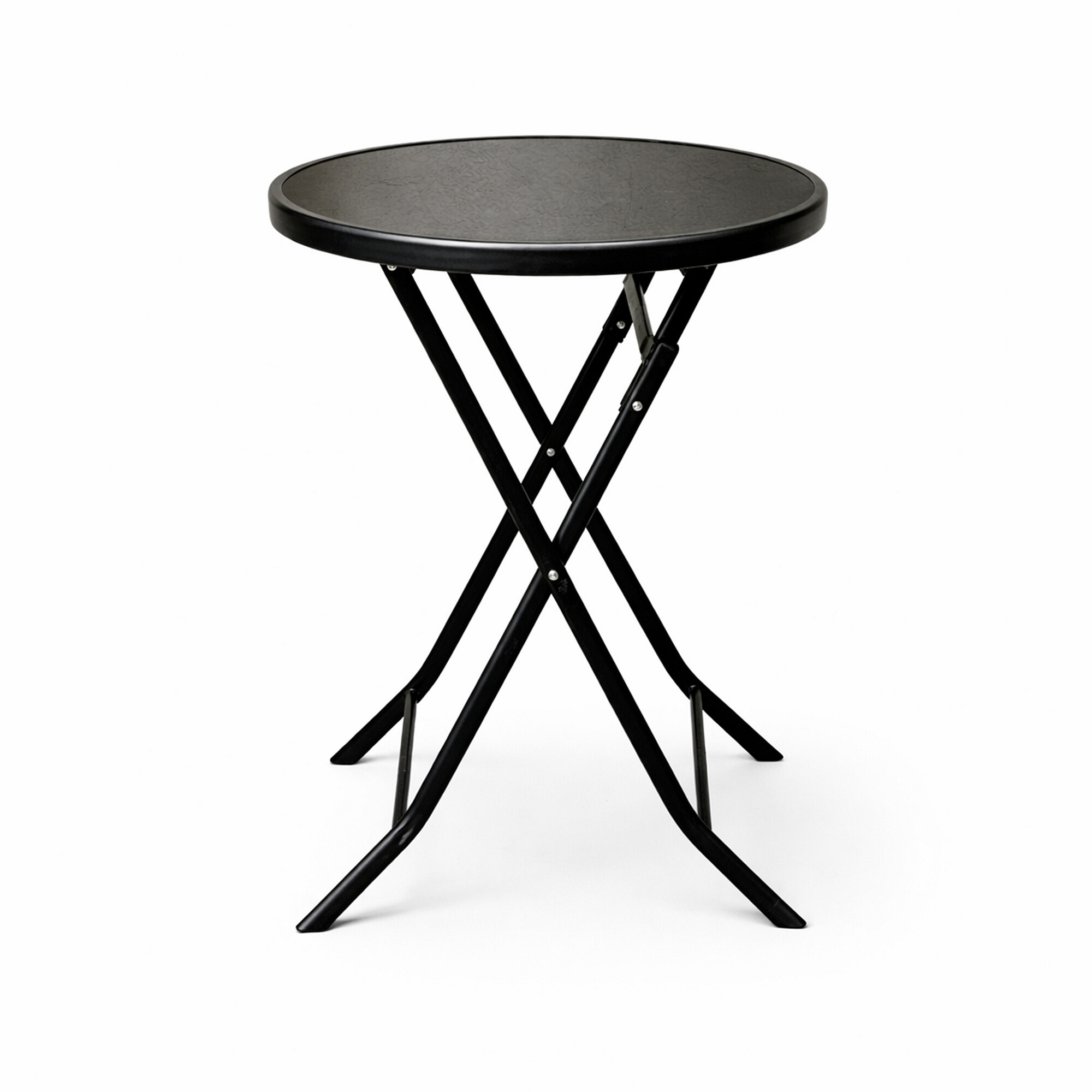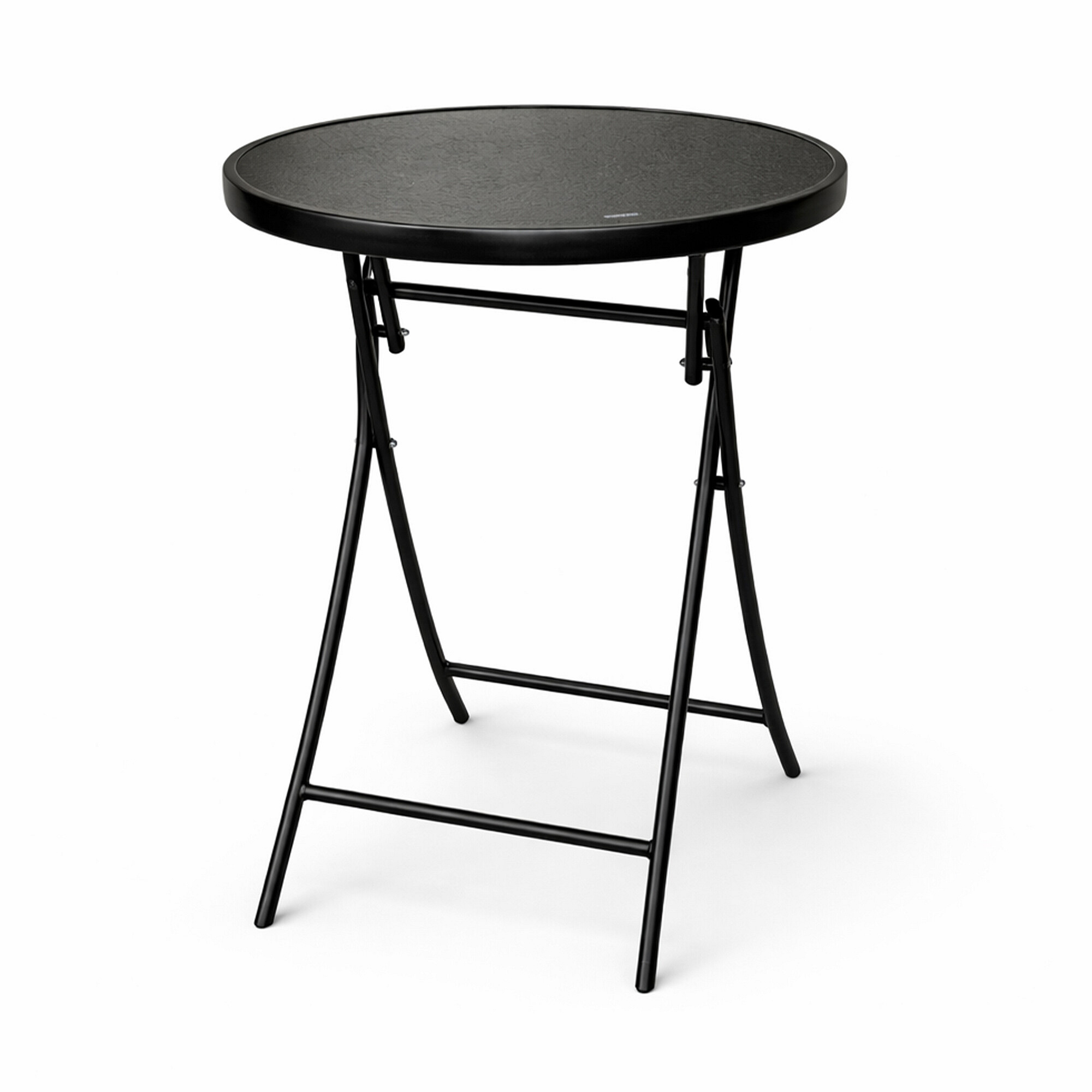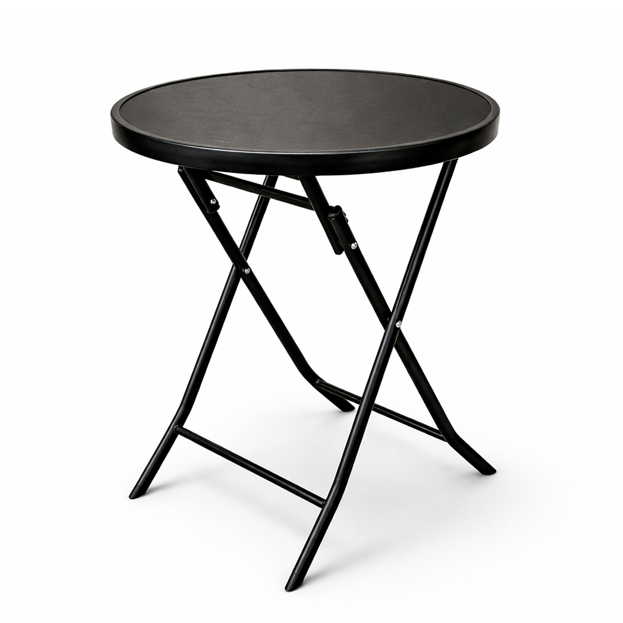 Okrogla vrtna miza s trdnim kovinskim okvirjem in stekleno ploščo, primerna za vrtove, terase, kavarne, paviljone, balkone.