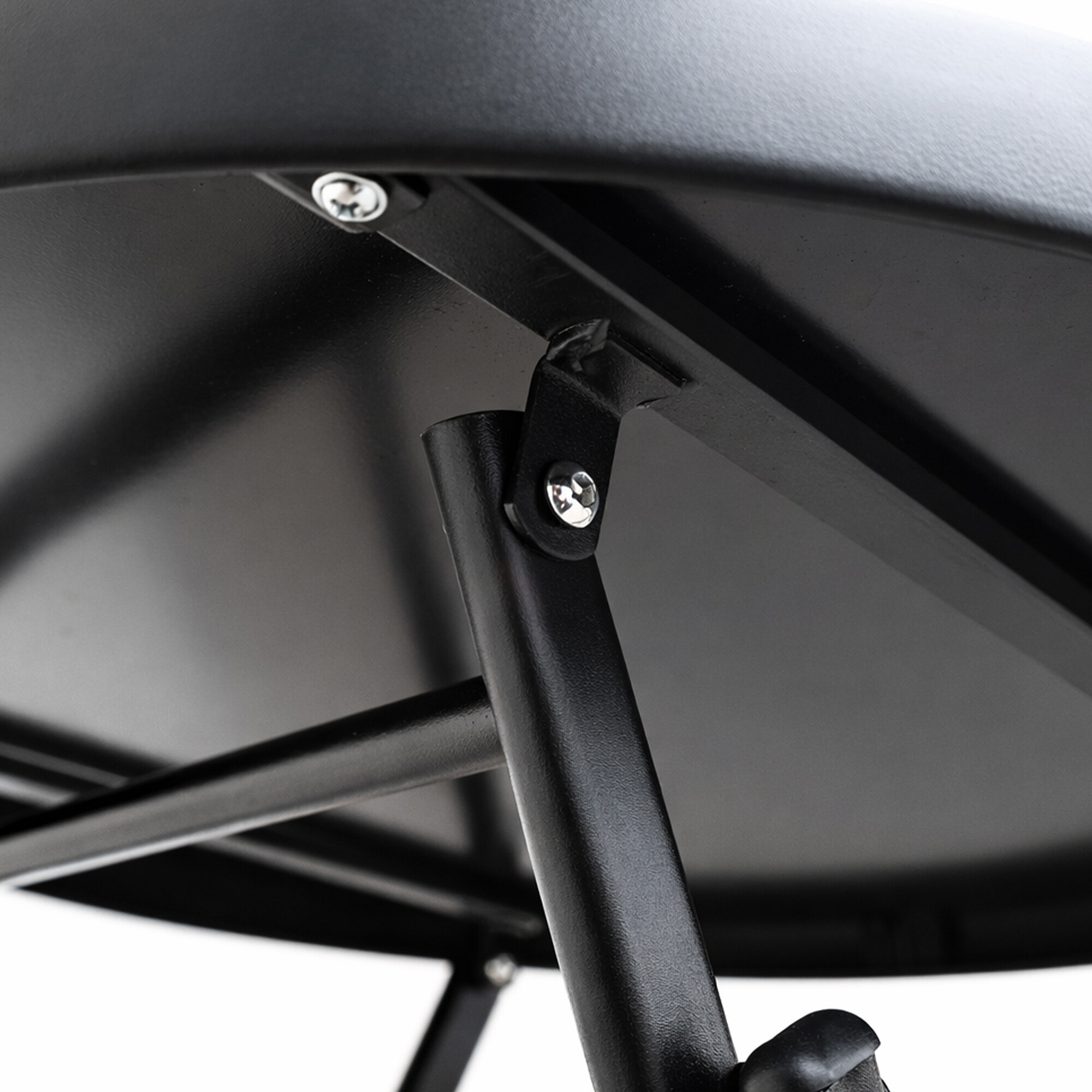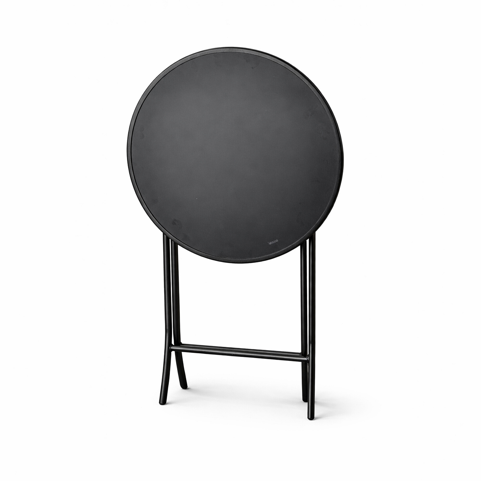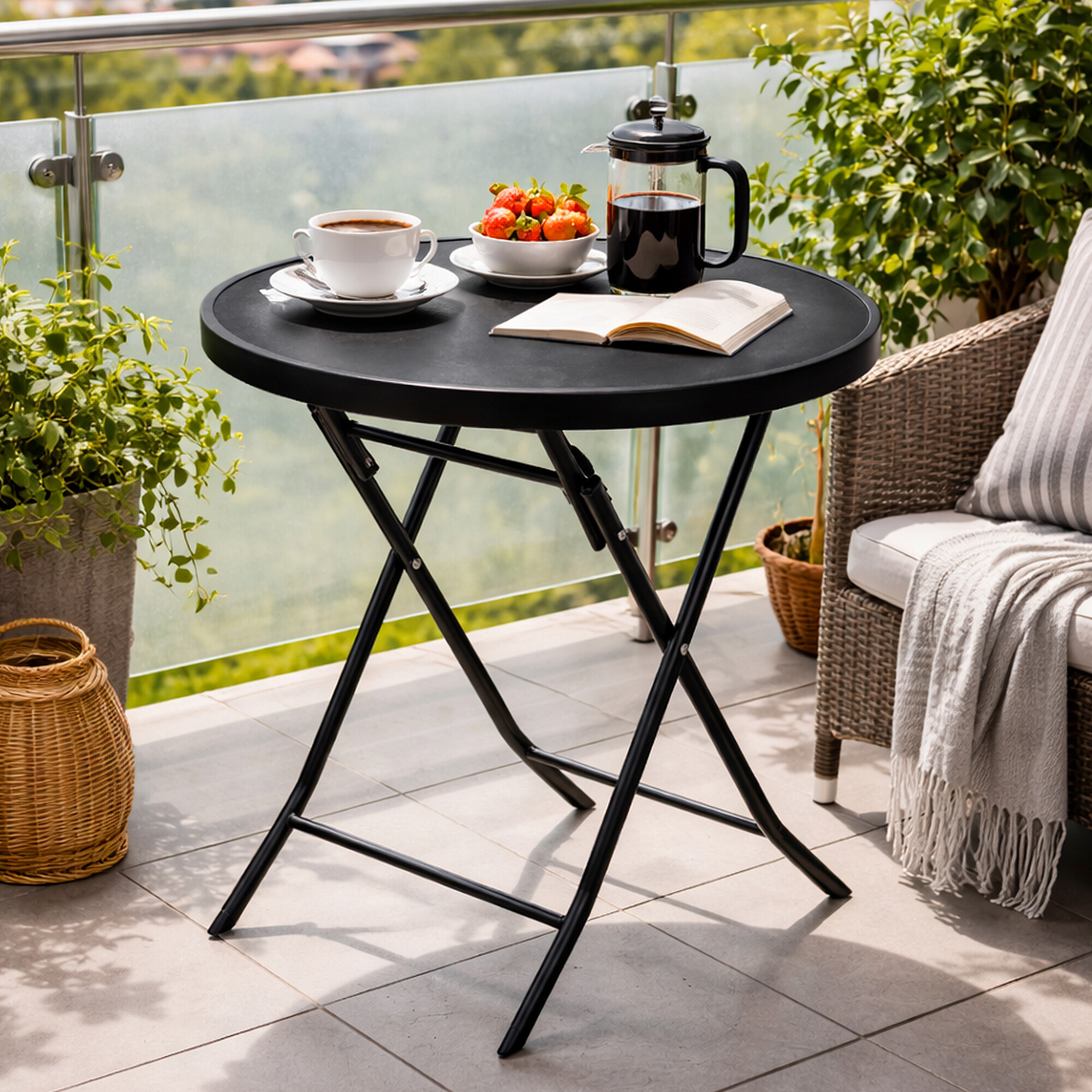 Okrogla vrtna miza s trdnim kovinskim okvirjem in stekleno ploščo, primerna za vrtove, terase, kavarne, paviljone, balkone.
